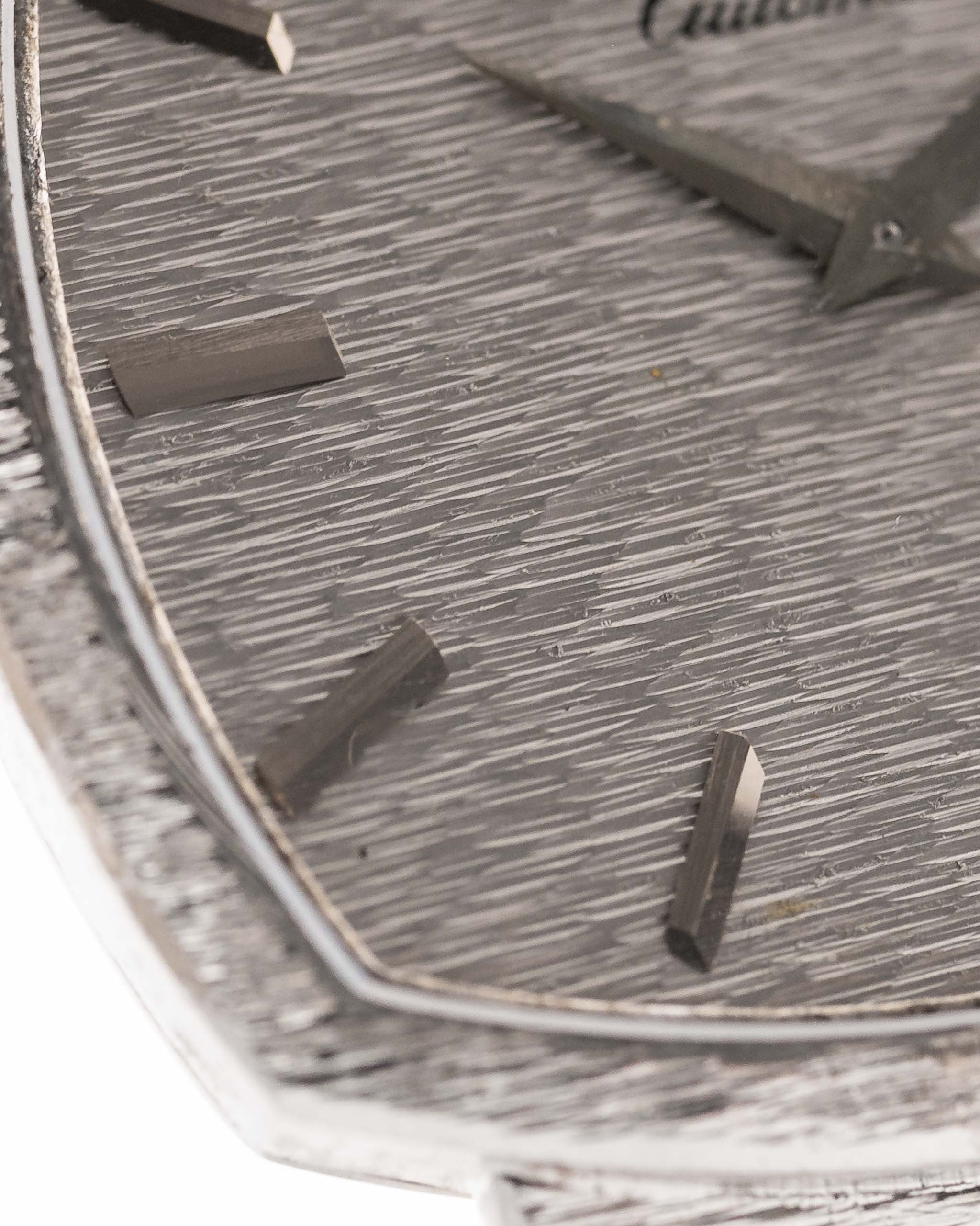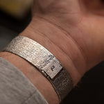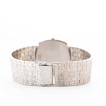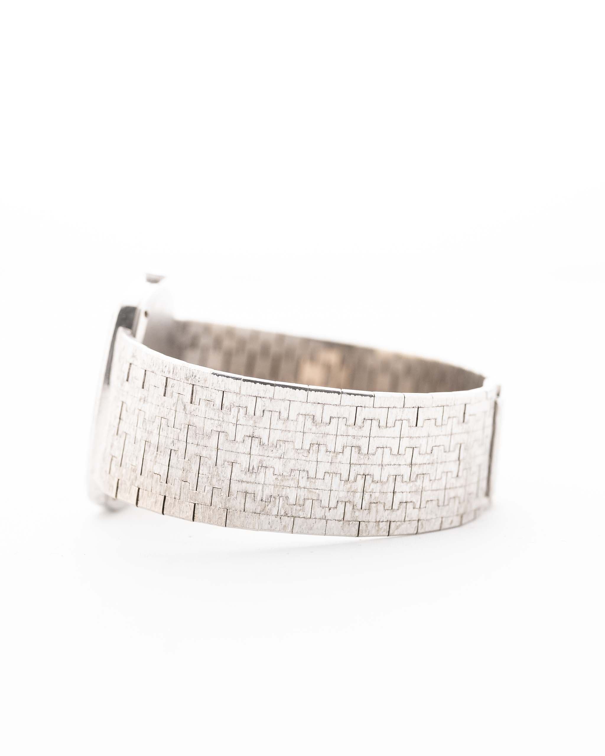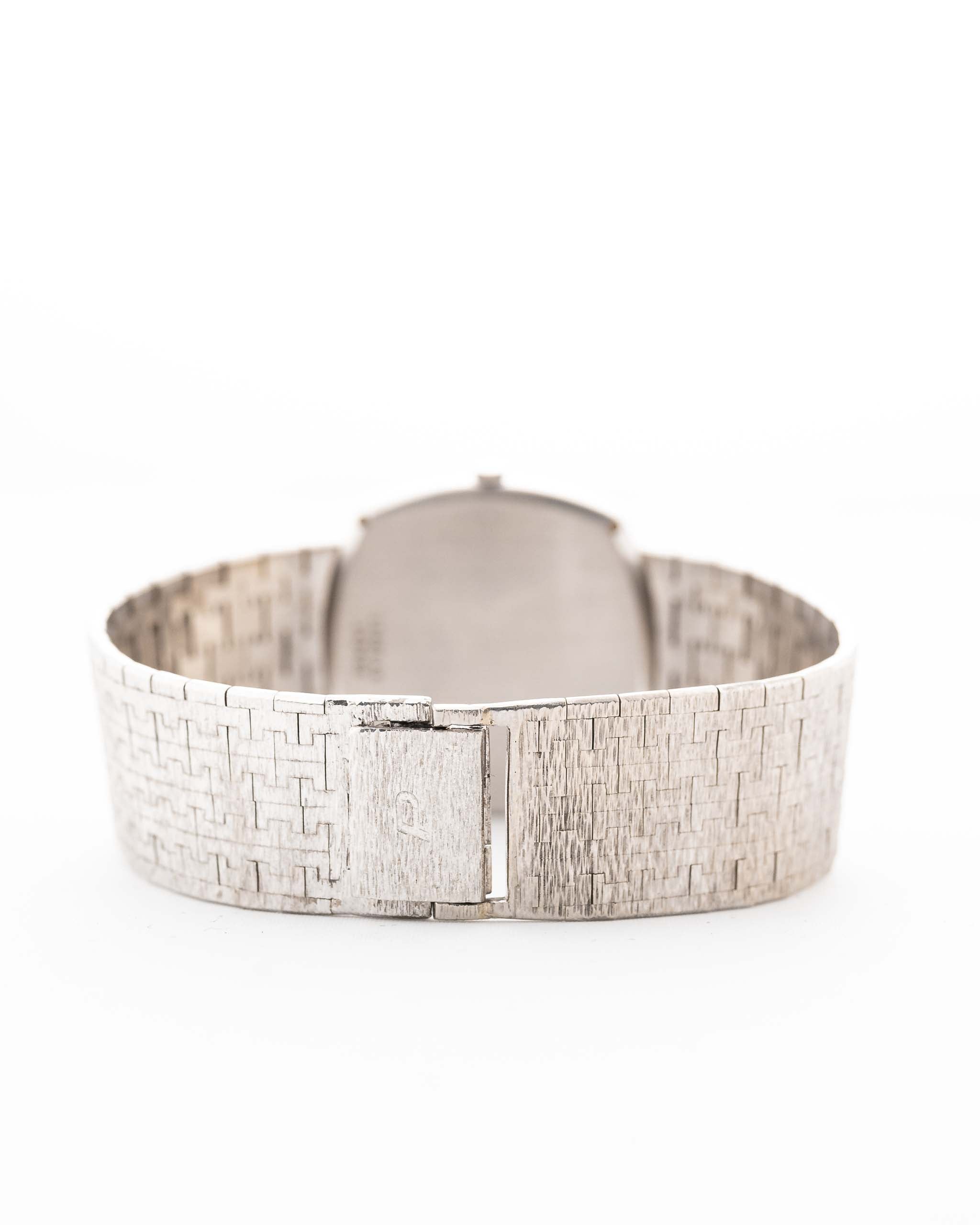 Presented in near-unworn condition, it features a spectacular integrated 18k white gold bracelet and a flawless white gold hammered dial. The distinctive TV-shaped case with an all-over bark finish across bezel, dial, and bracelet transforms this watch into a true piece of wearable art.