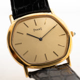 Our piece comes in unpolished condition with the original Piaget leather strap and 18k yellow gold buckle, the dial is flawless and the hexagon case shape is a really unique piece of art.