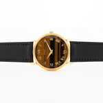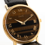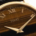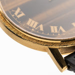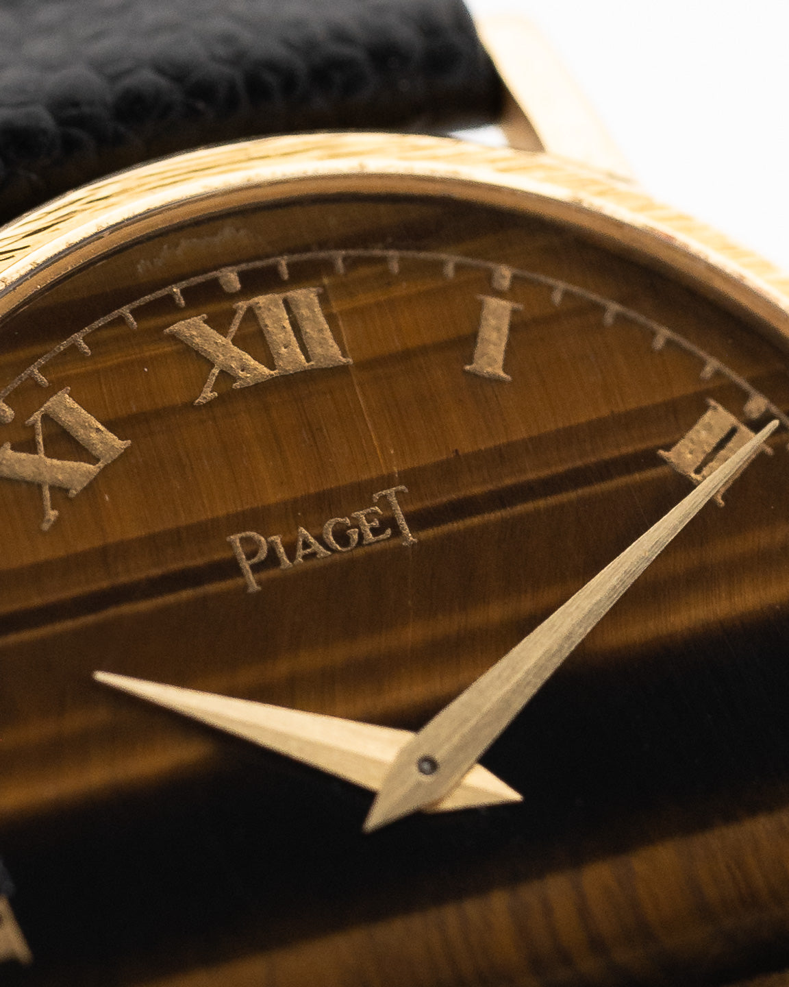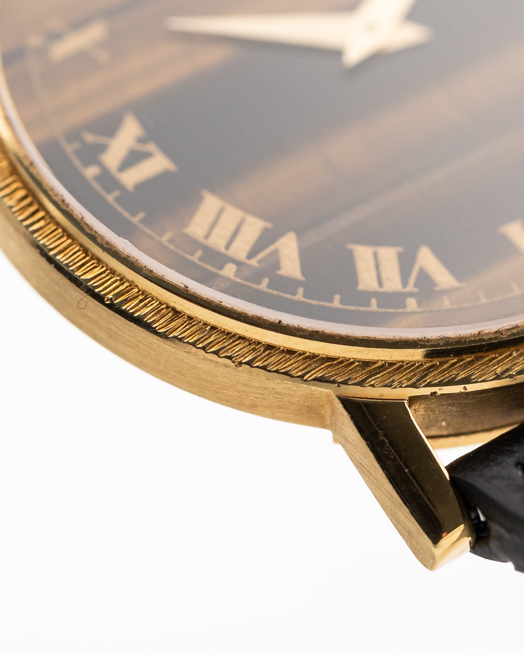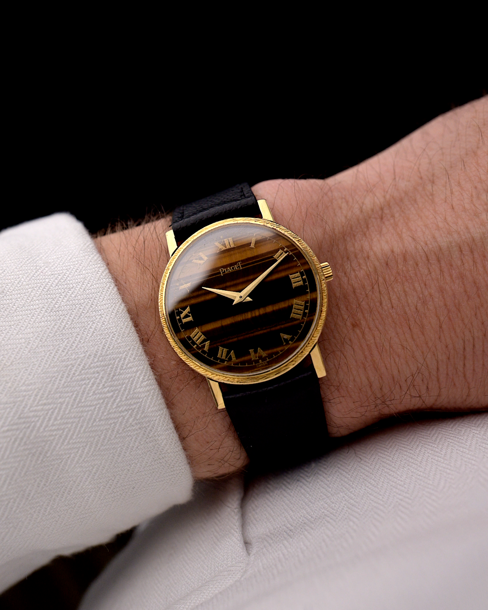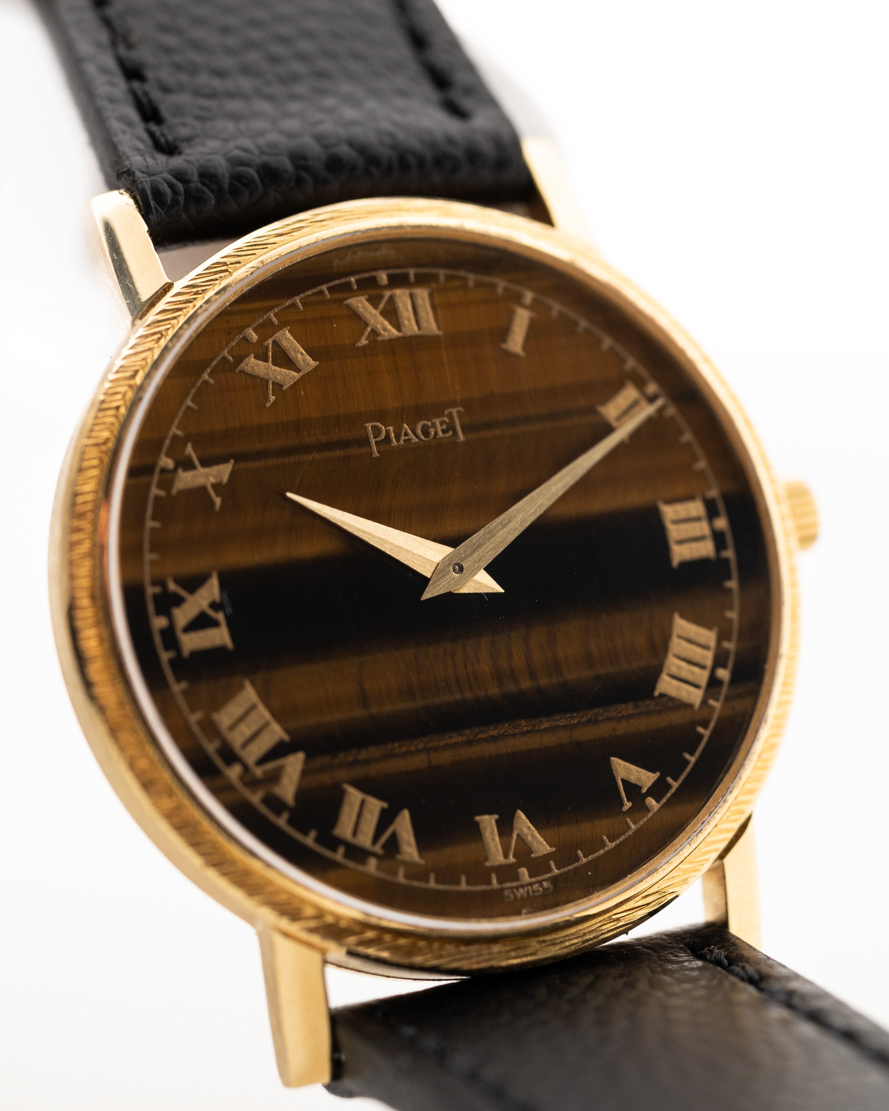 Its slimness was not only a technical accomplishment, it also allowed the manufacture to fit dials made of hard stones while retaining a thin profile like this flawless 18k Piaget with a beautiful tiger eye stone dial. Special on this one is the bark finished bezel.