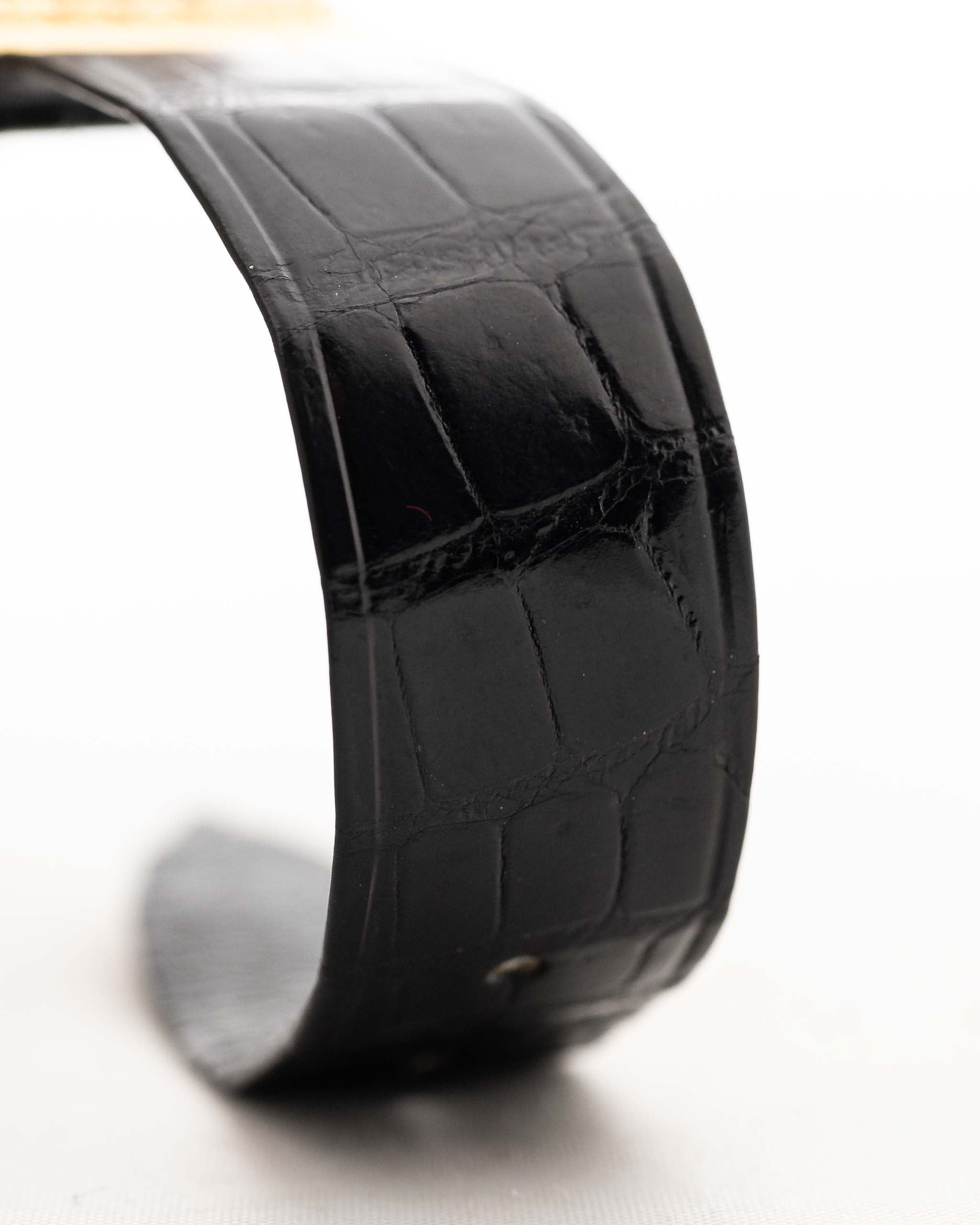 Slim and refined, this rectangular case wears elegantly on the wrist, while the natural striations of the dial ensure no two examples are alike. The watch remains in superb condition and is paired with a minimalist leather strap for understated luxury.