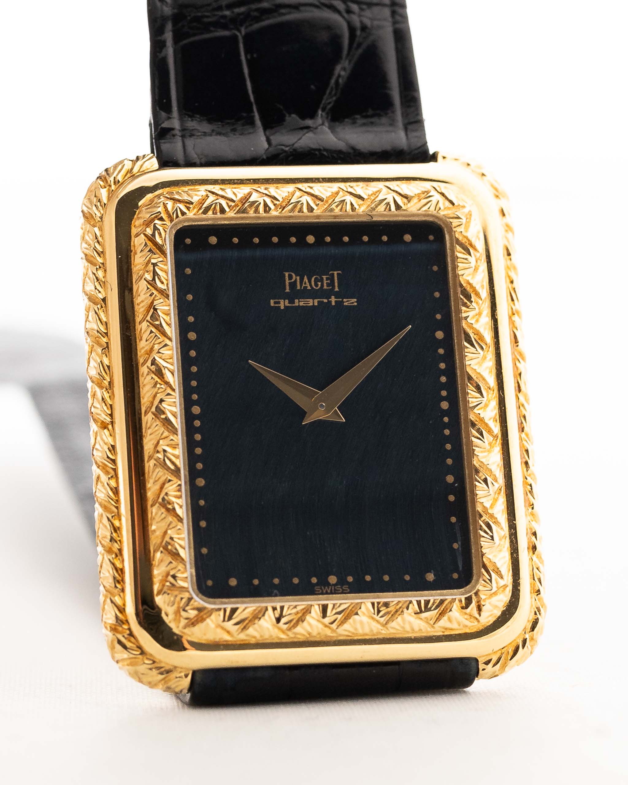 Vintage Piaget 74121 watch, 18k yellow gold, blue Hawk's Eye dial, rectangular case, quartz movement, on black background