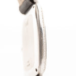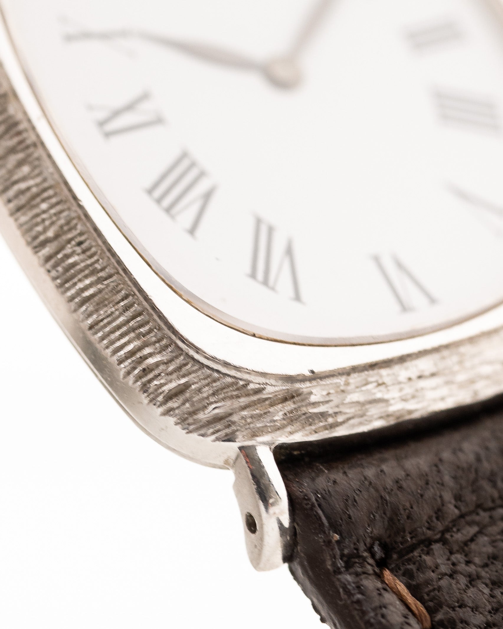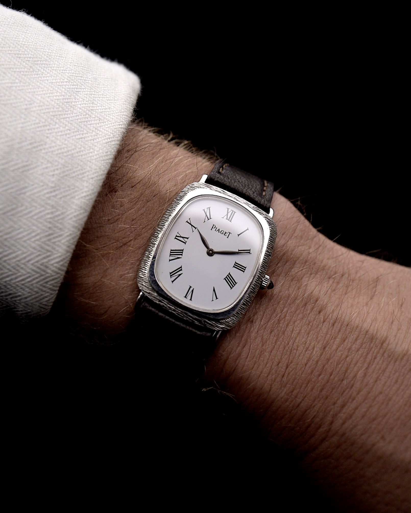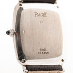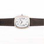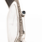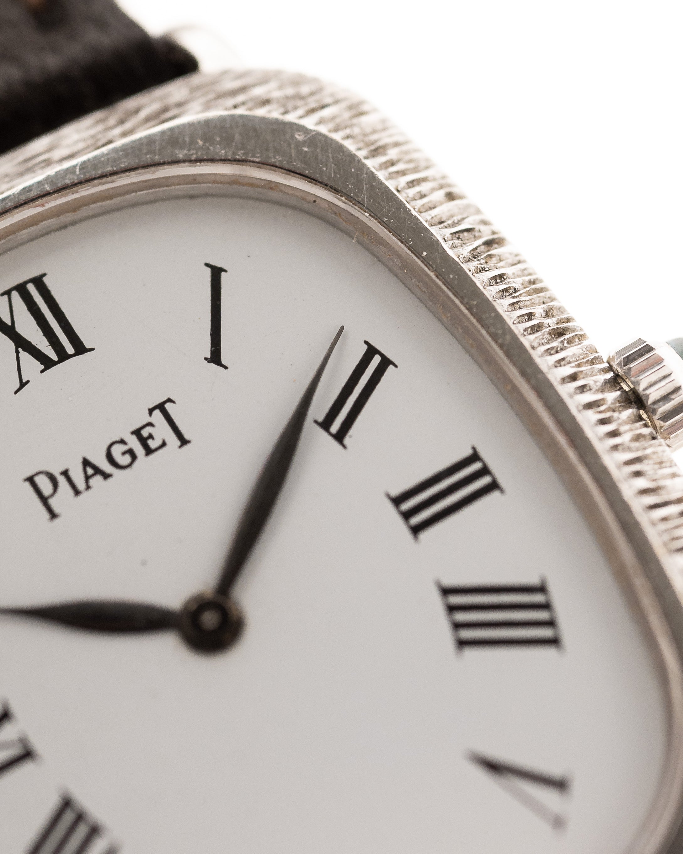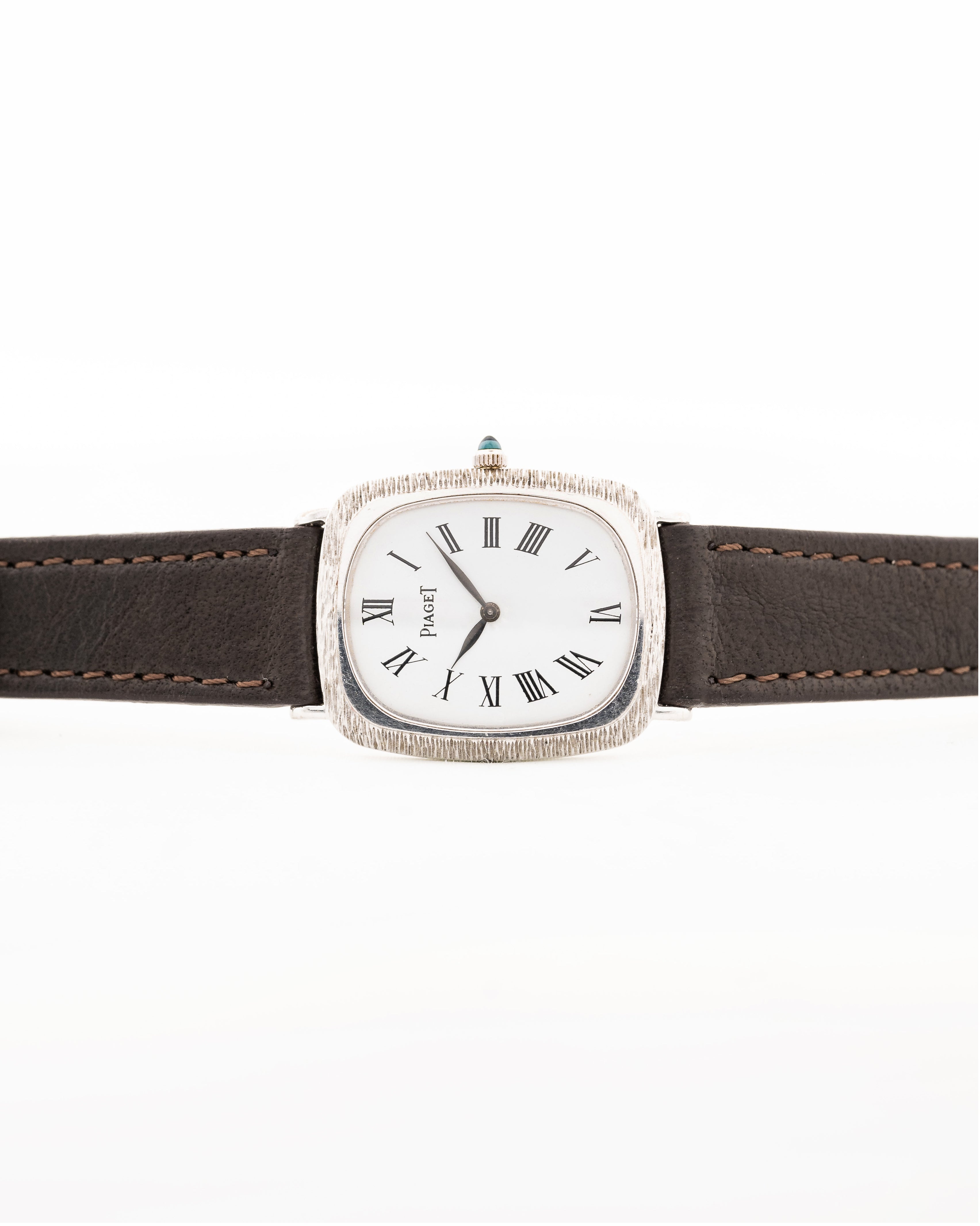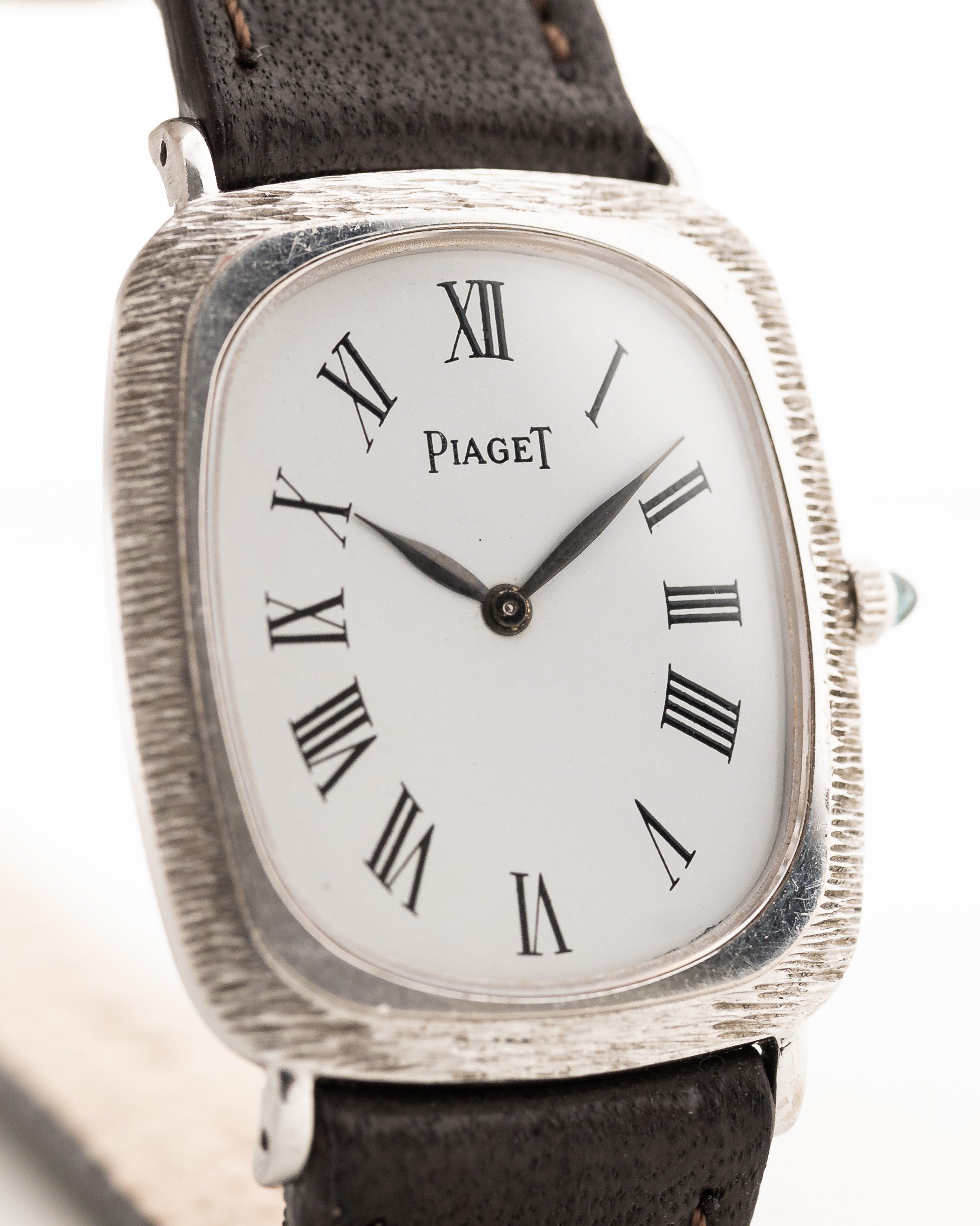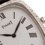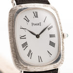 This beautiful Piaget comes in a 18k white gold case with bark finished bezel, clean white dial with roman numerals and leaf hands.