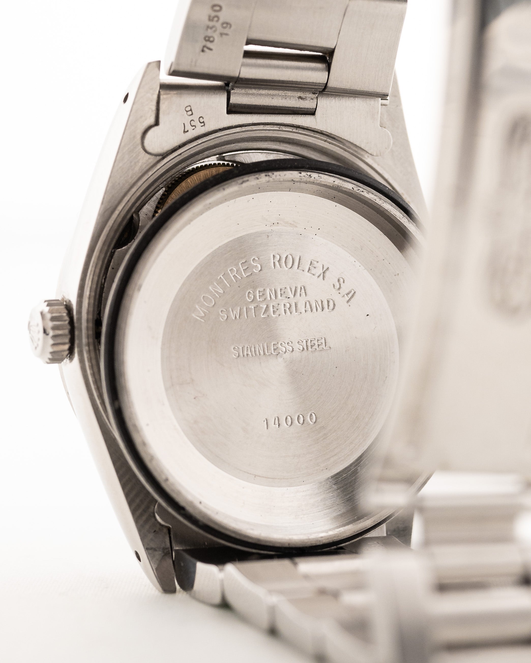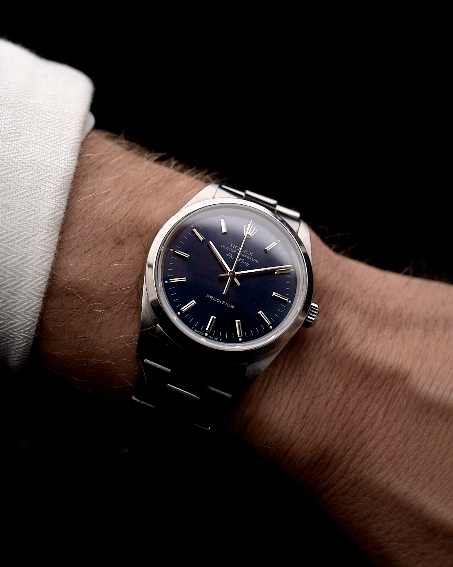 This particular piece from 1990 is notable for its impeccable condition with the smooth bezel and a deep ocean blue dial.