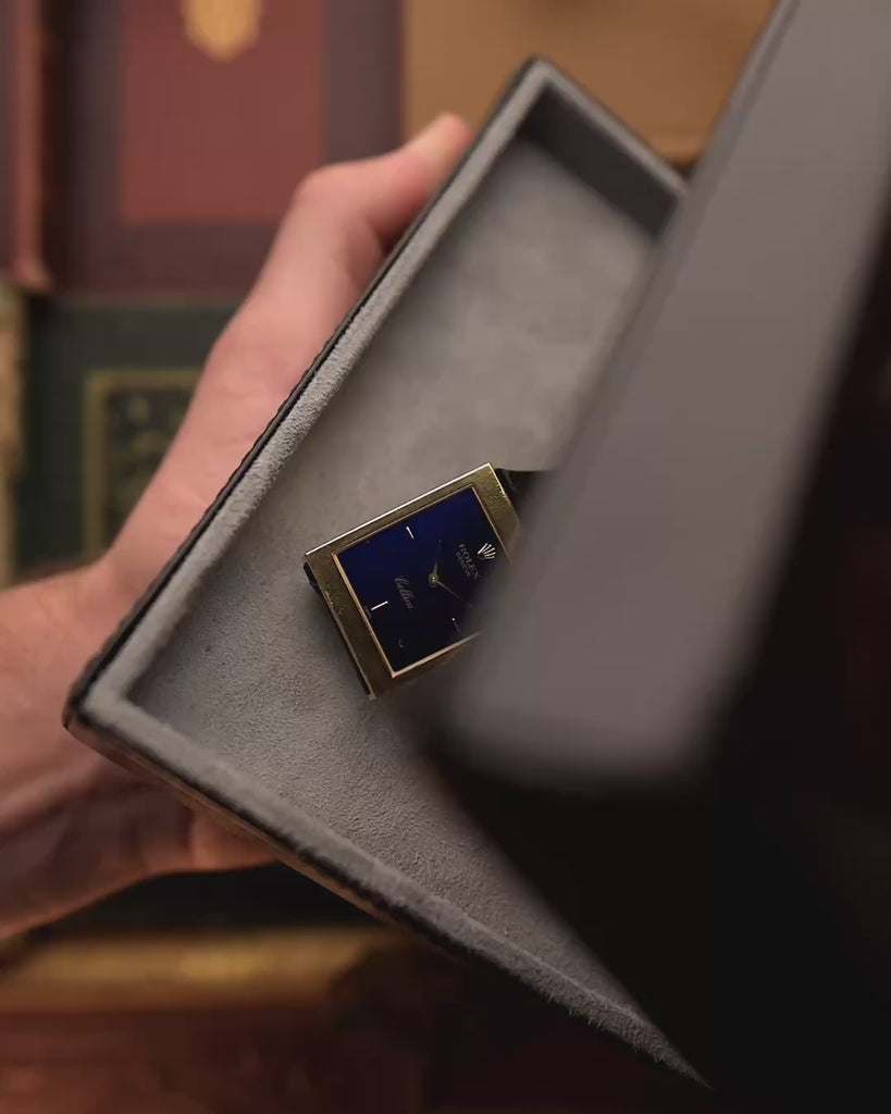 The square case, an unconventional shape for Rolex, gives the watch a distinctive architectural presence. Its glossy deep-blue dial — exceptionally rare for this reference — adds striking contrast against the gold case and bezel, reflecting light with subtle sophistication.