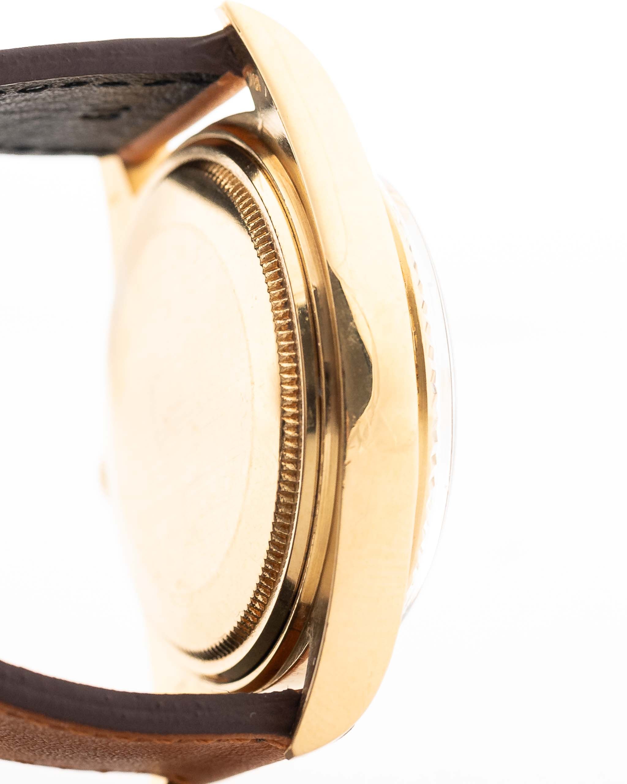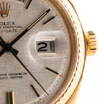 The Rolex Day-Date stands at the pinnacle of vintage elegance — and this 1973 Ref. 1803 is an especially captivating example. Housed in a solid 18k yellow gold case, this model pairs the classic proportions of the Day-Date with one of the most desirable dial executions of the era: a silver linen pie pan dial. Its textured surface catches the light beautifully, giving the watch a refined character that sets it apart from standard configurations.