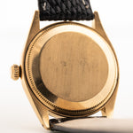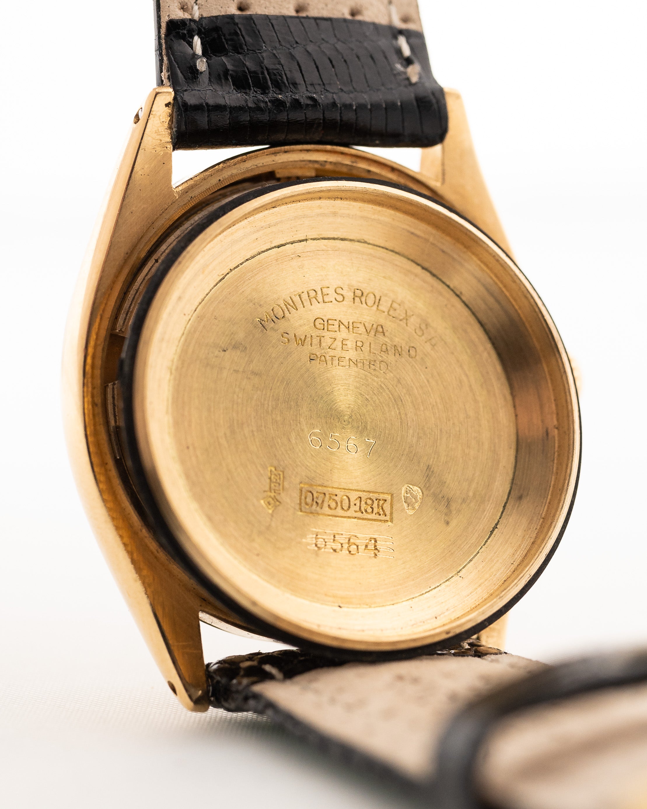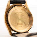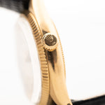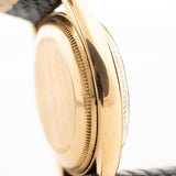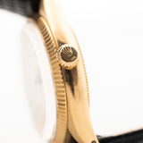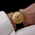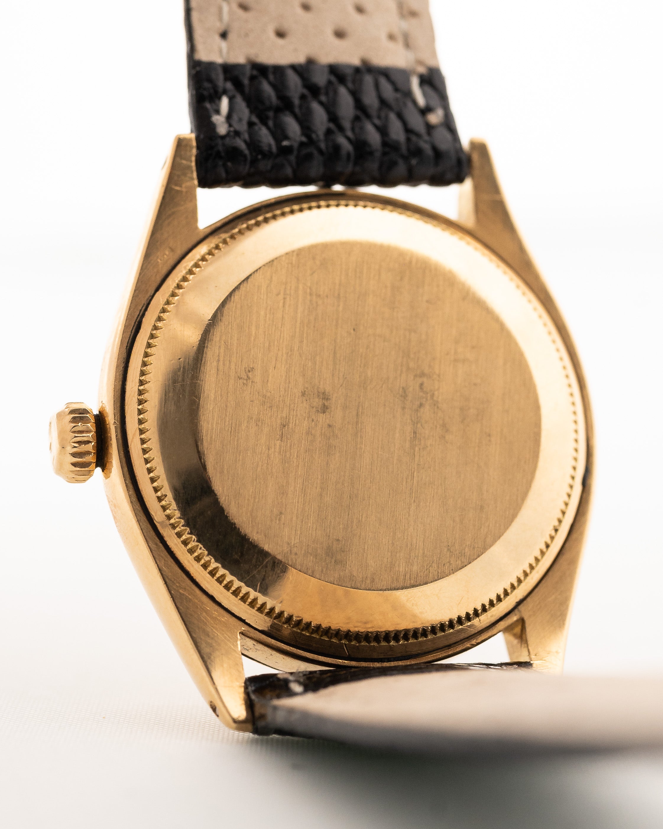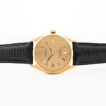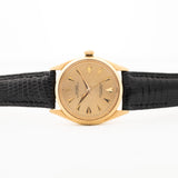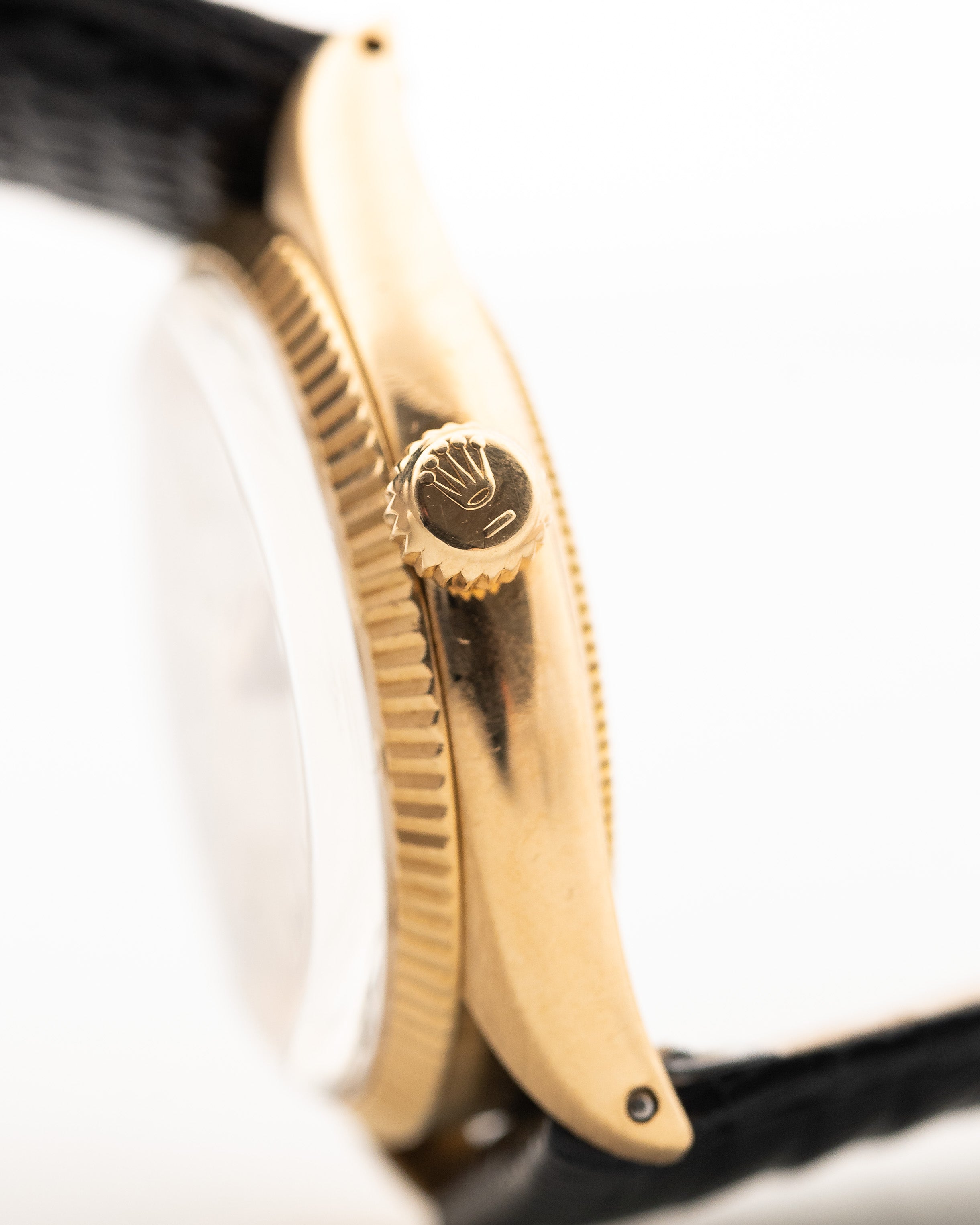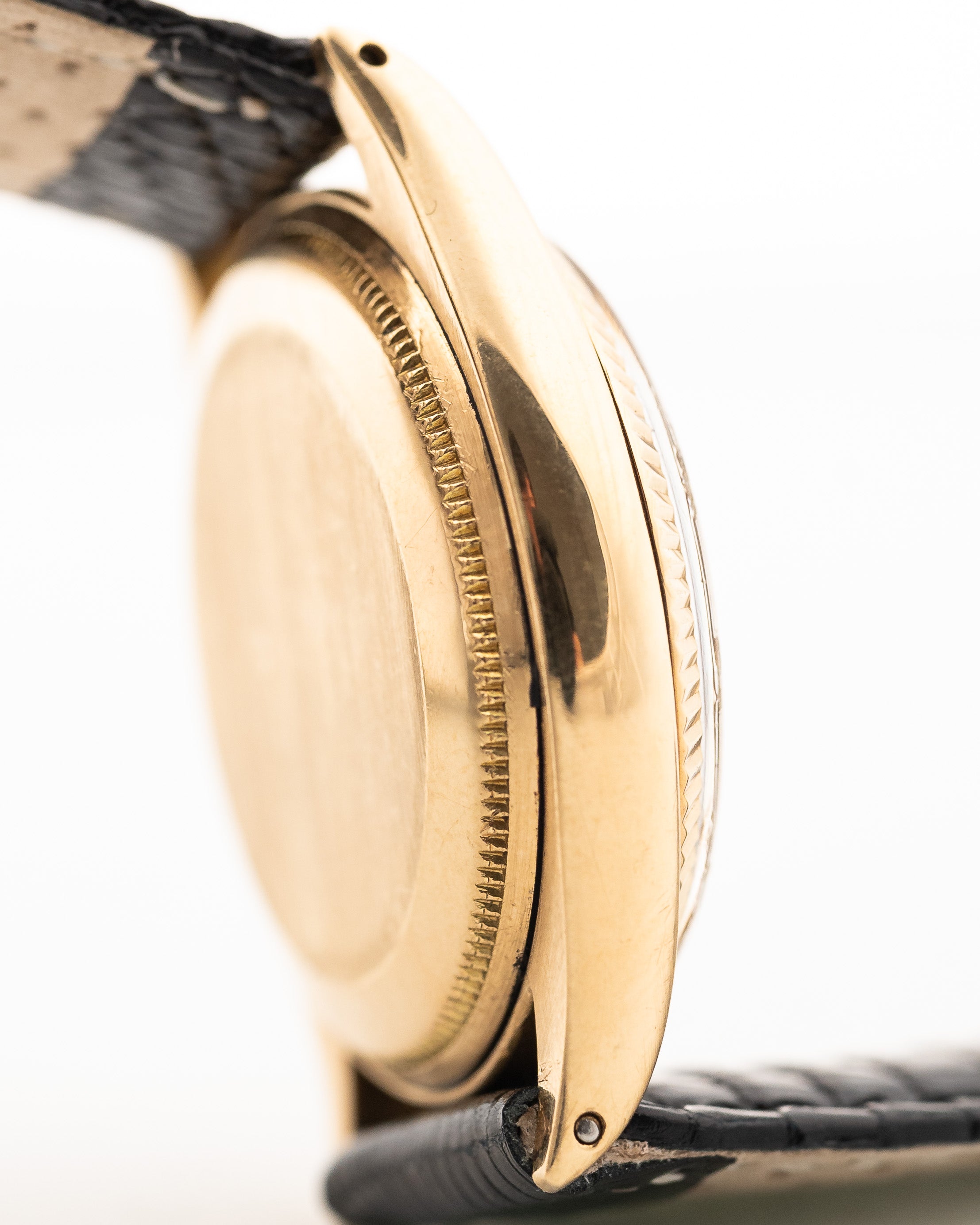 A solid yellow gold case with a fluted bezel and a beautiful and very rare golden colored dial with arrow head hour markers keep the appearance simple and elegant.