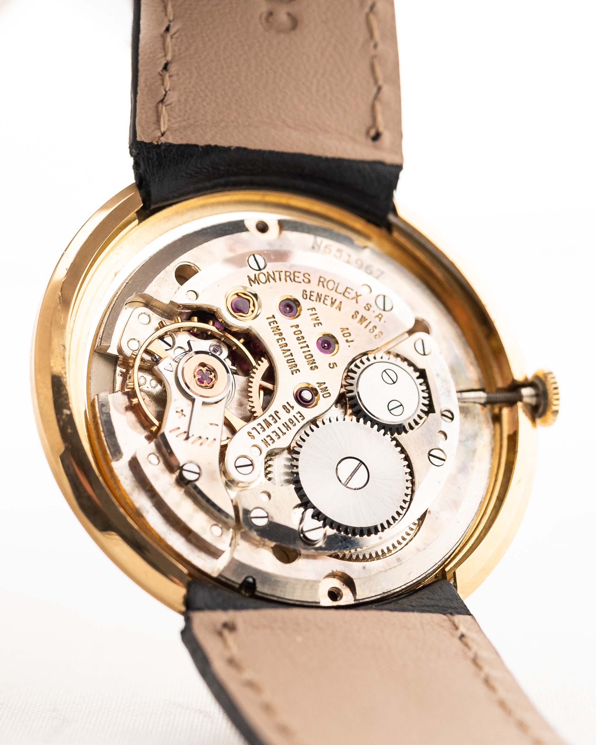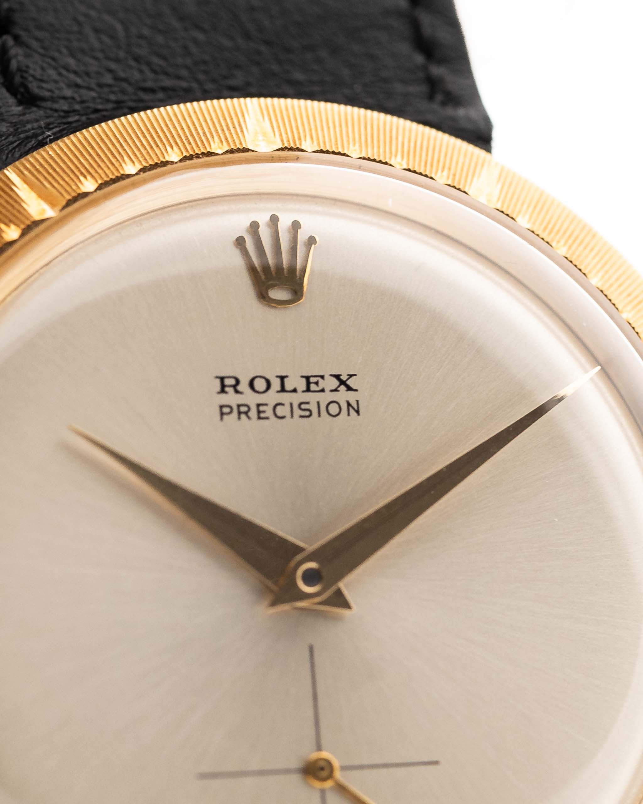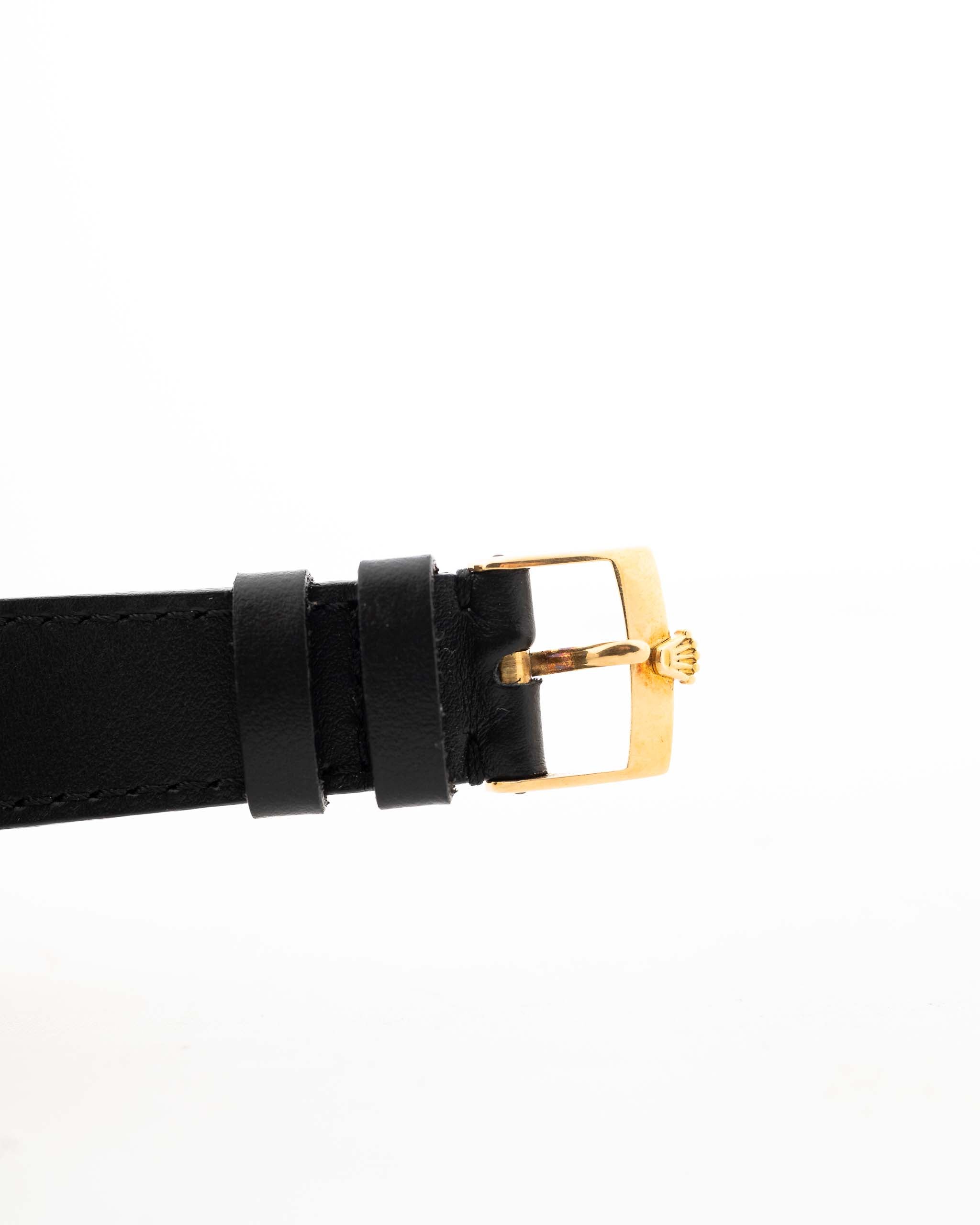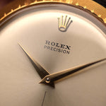 A beautifully preserved example of Rolex’s understated dress-watch era, the Zephyr Ref. 9522 showcases why the Precision line deserves far more recognition. Its flat 18k yellow gold Disco Volante case, paired with an engraved bezel featuring hour and minute markers, gives this piece a uniquely refined presence on the wrist.