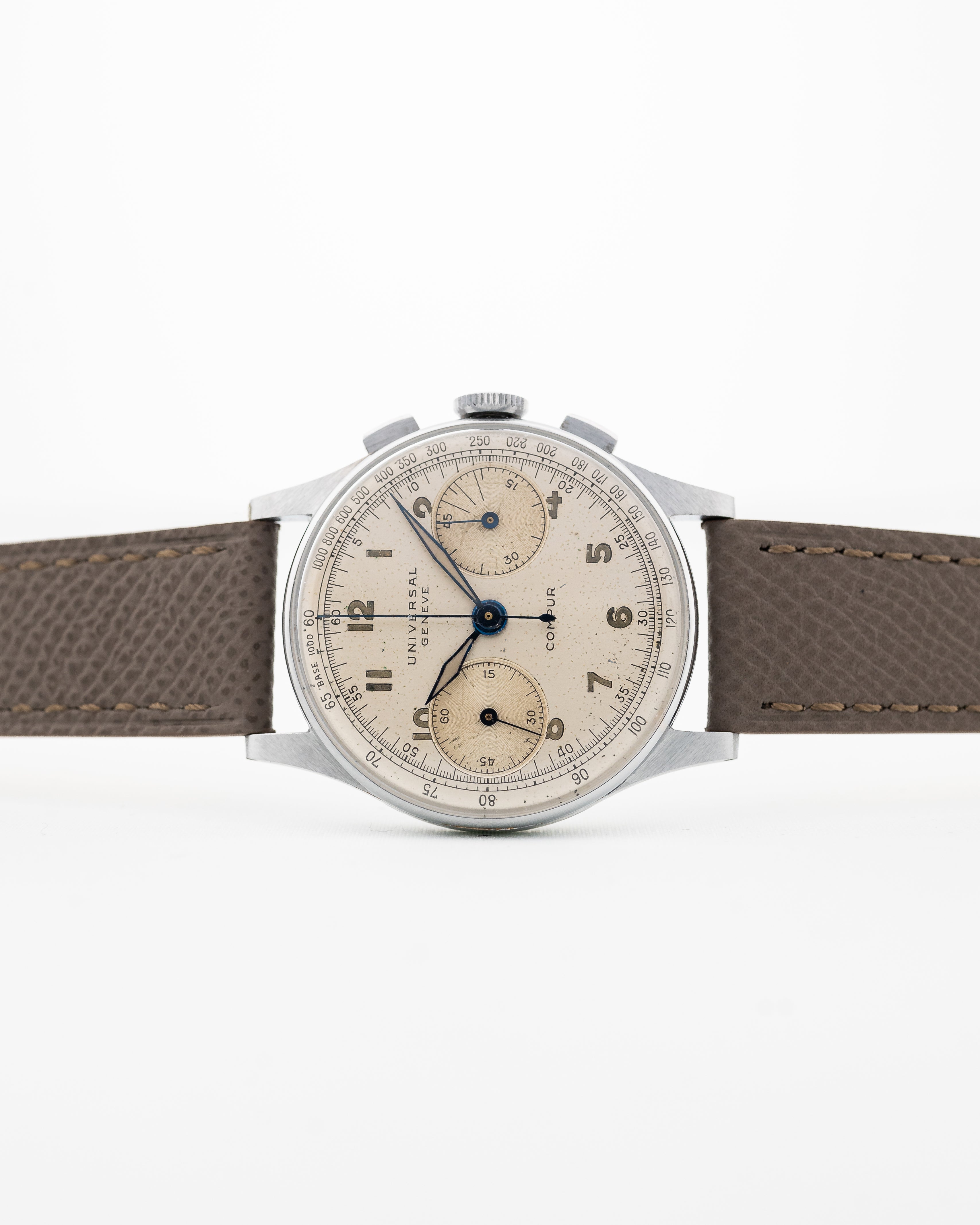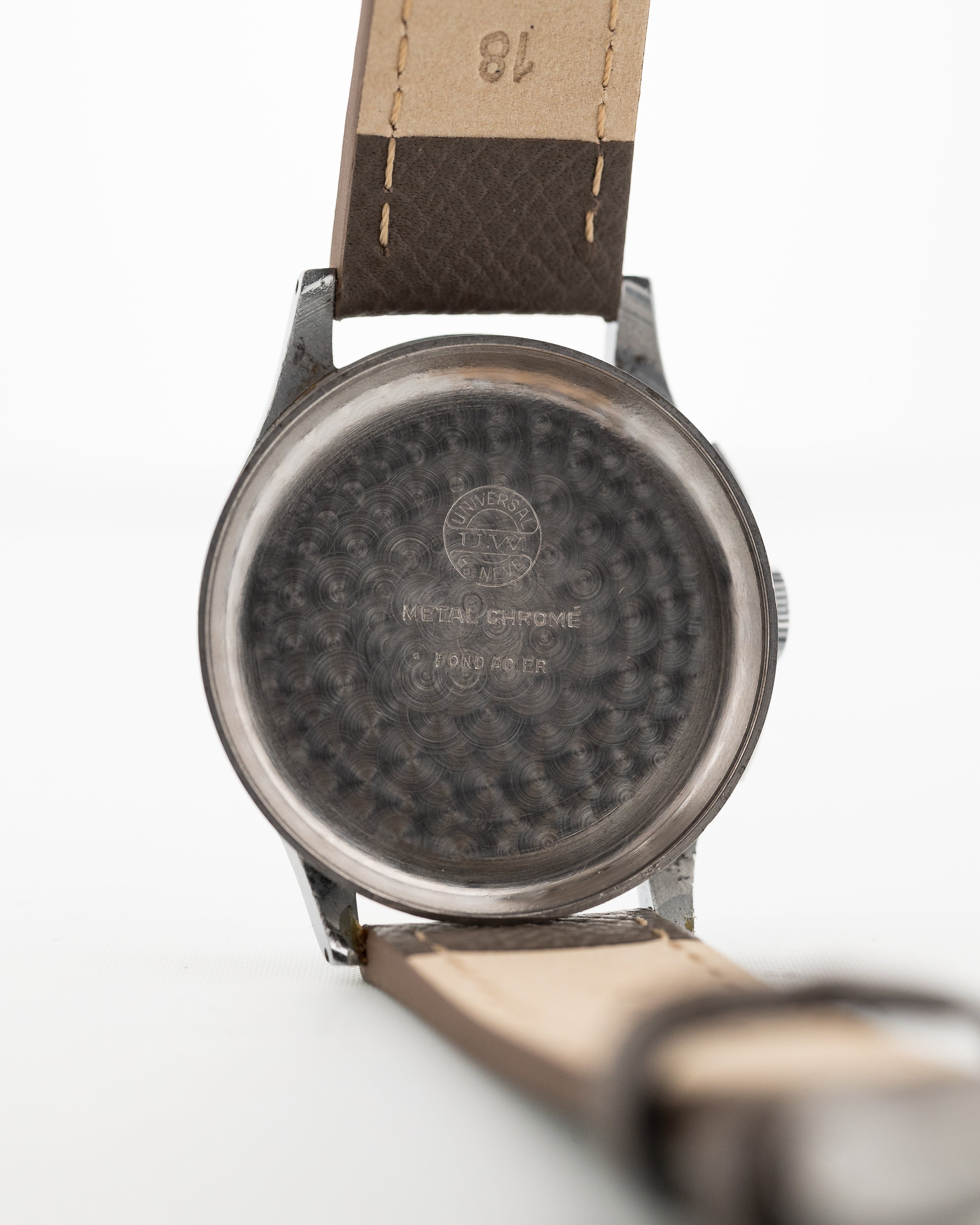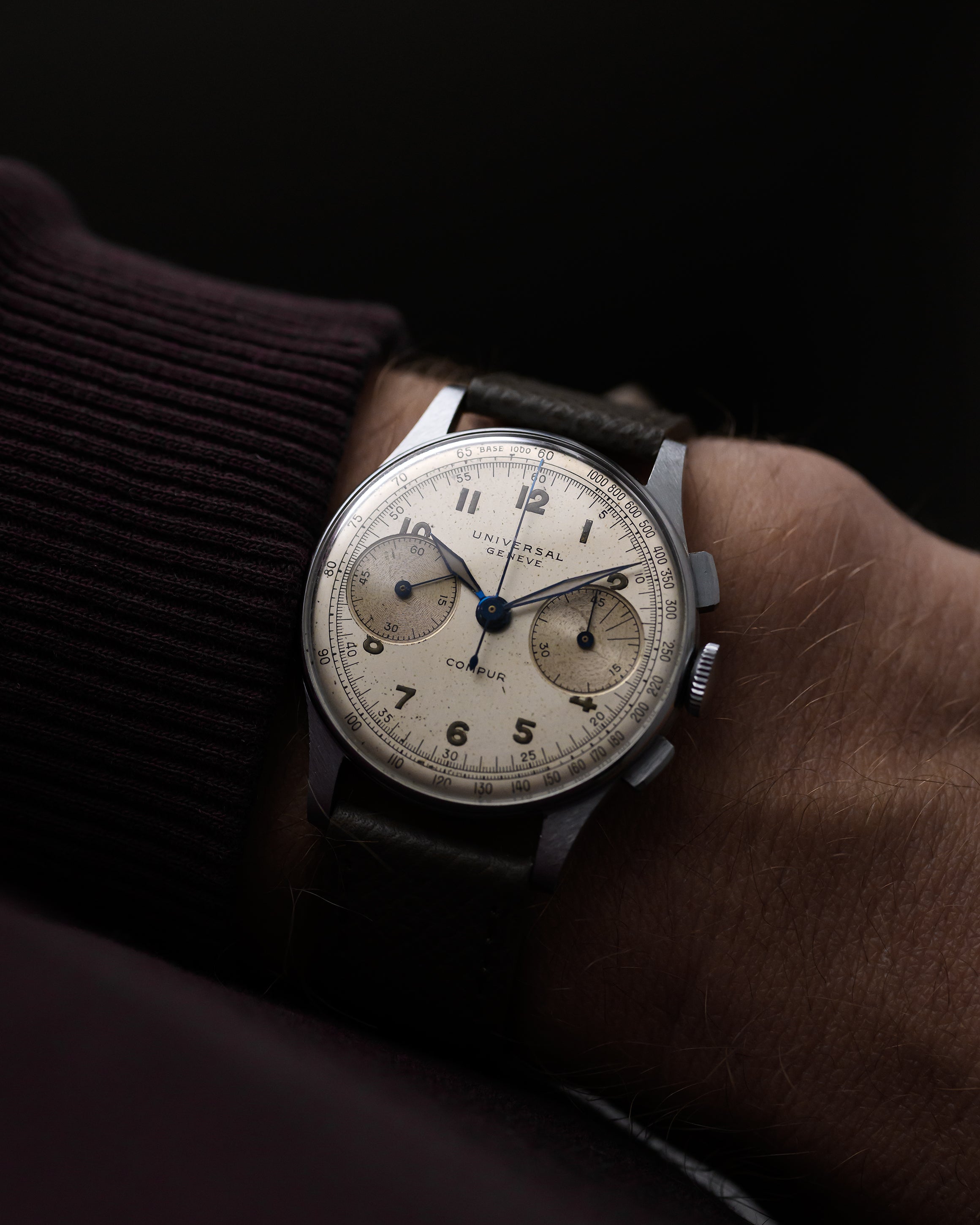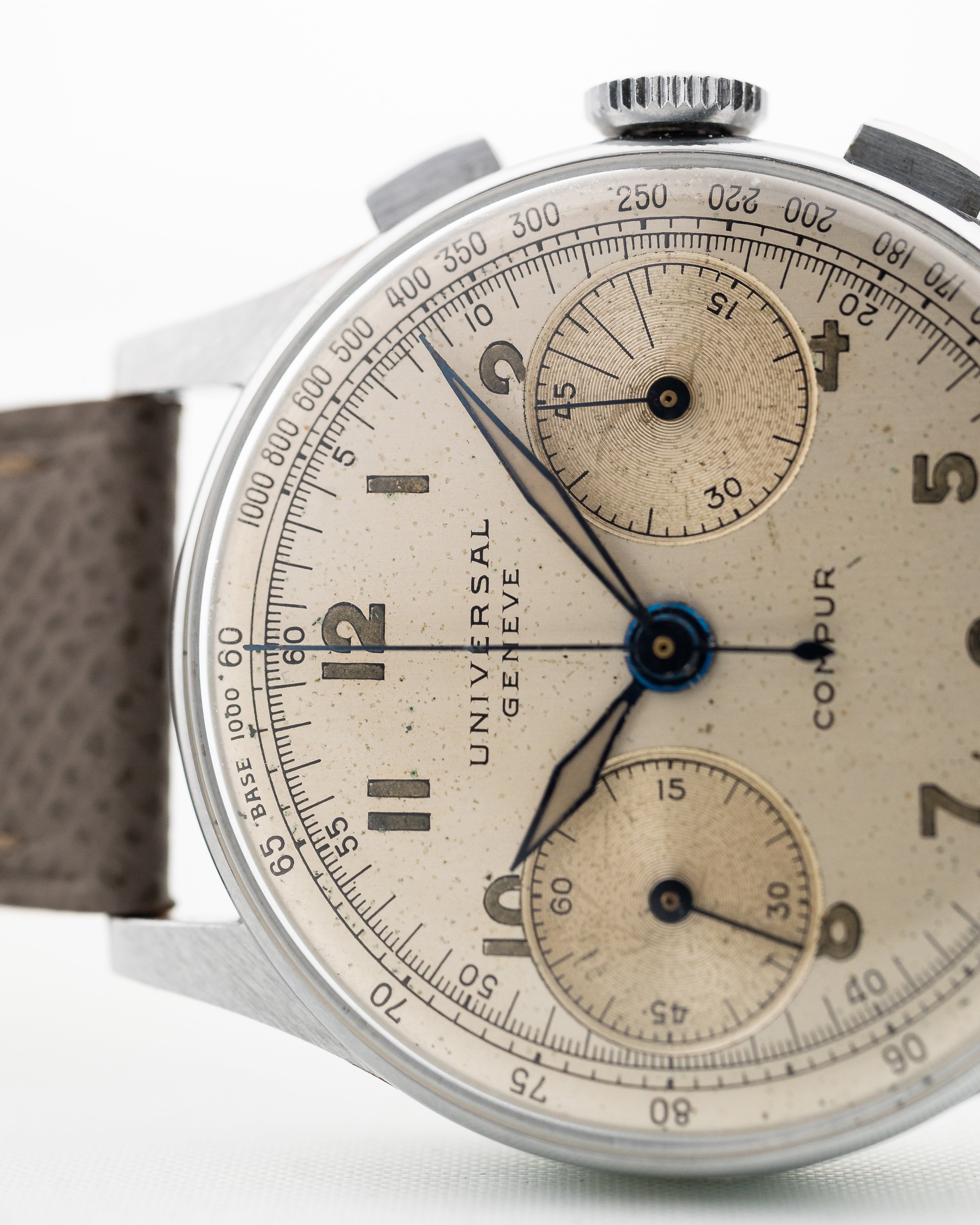 This Universal Geneve Compur is a fantastic example of what the manufacturer did so well in the 1940s. The compact stainless steel case with square pushers houses the desirable caliber 386 movement.
