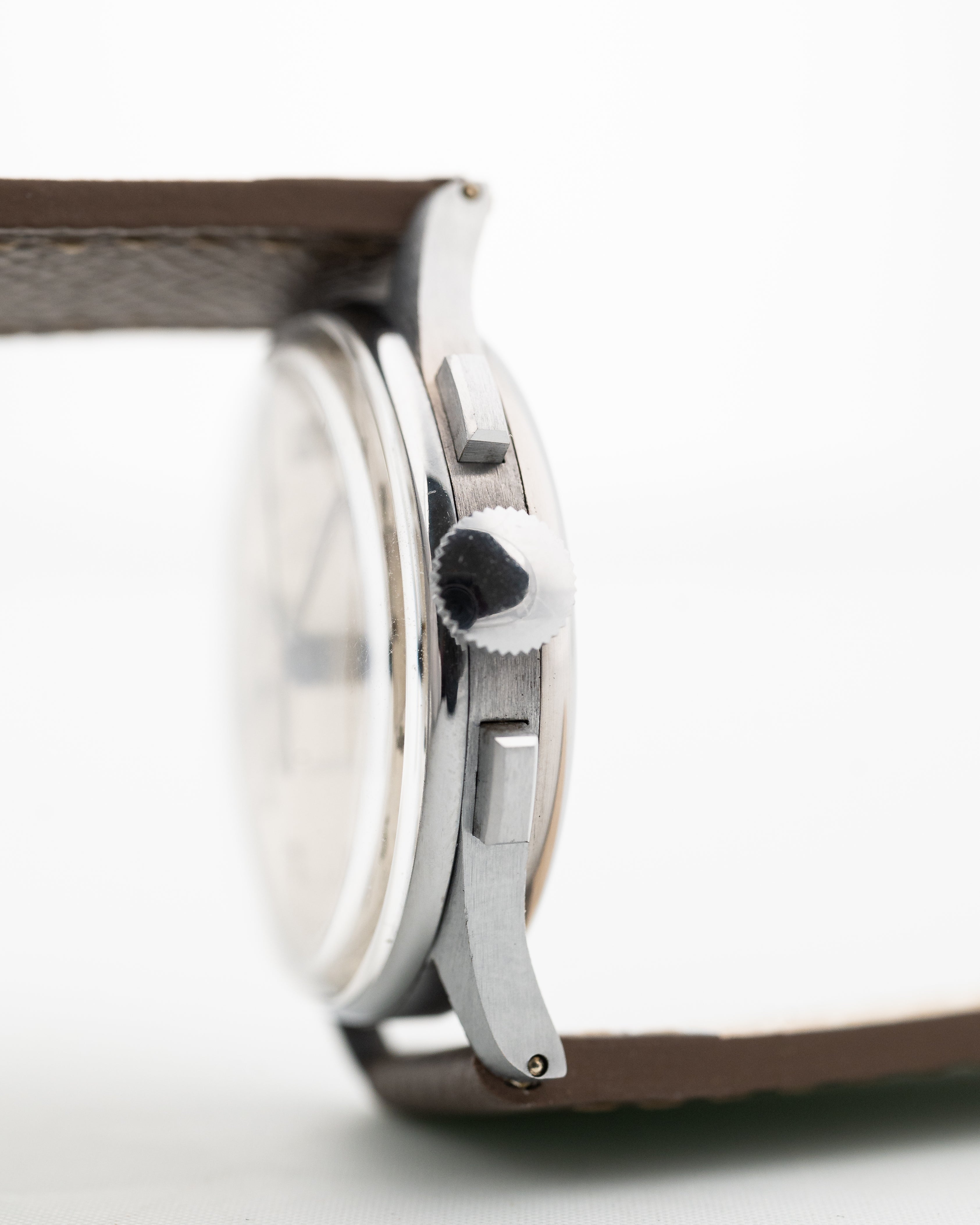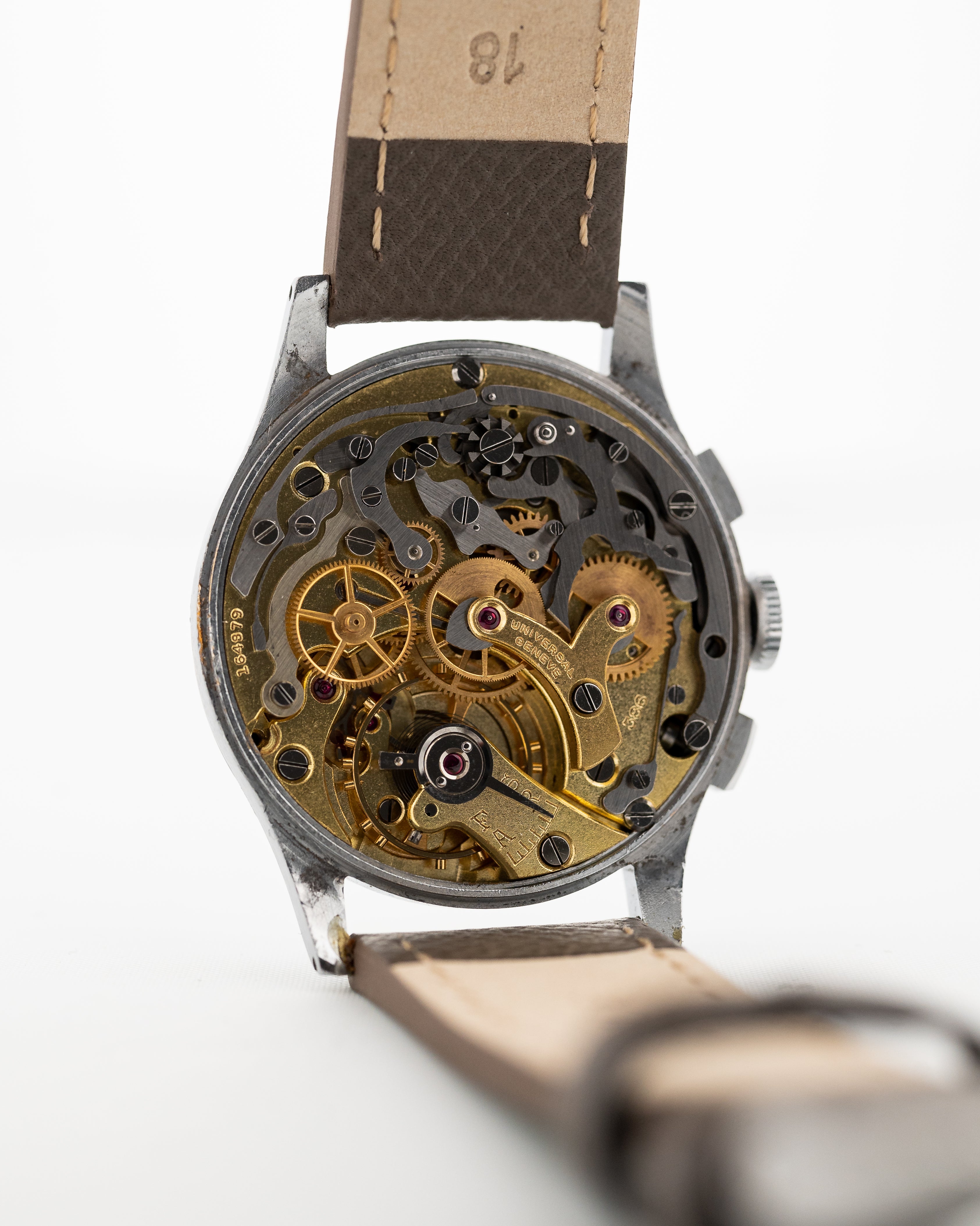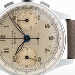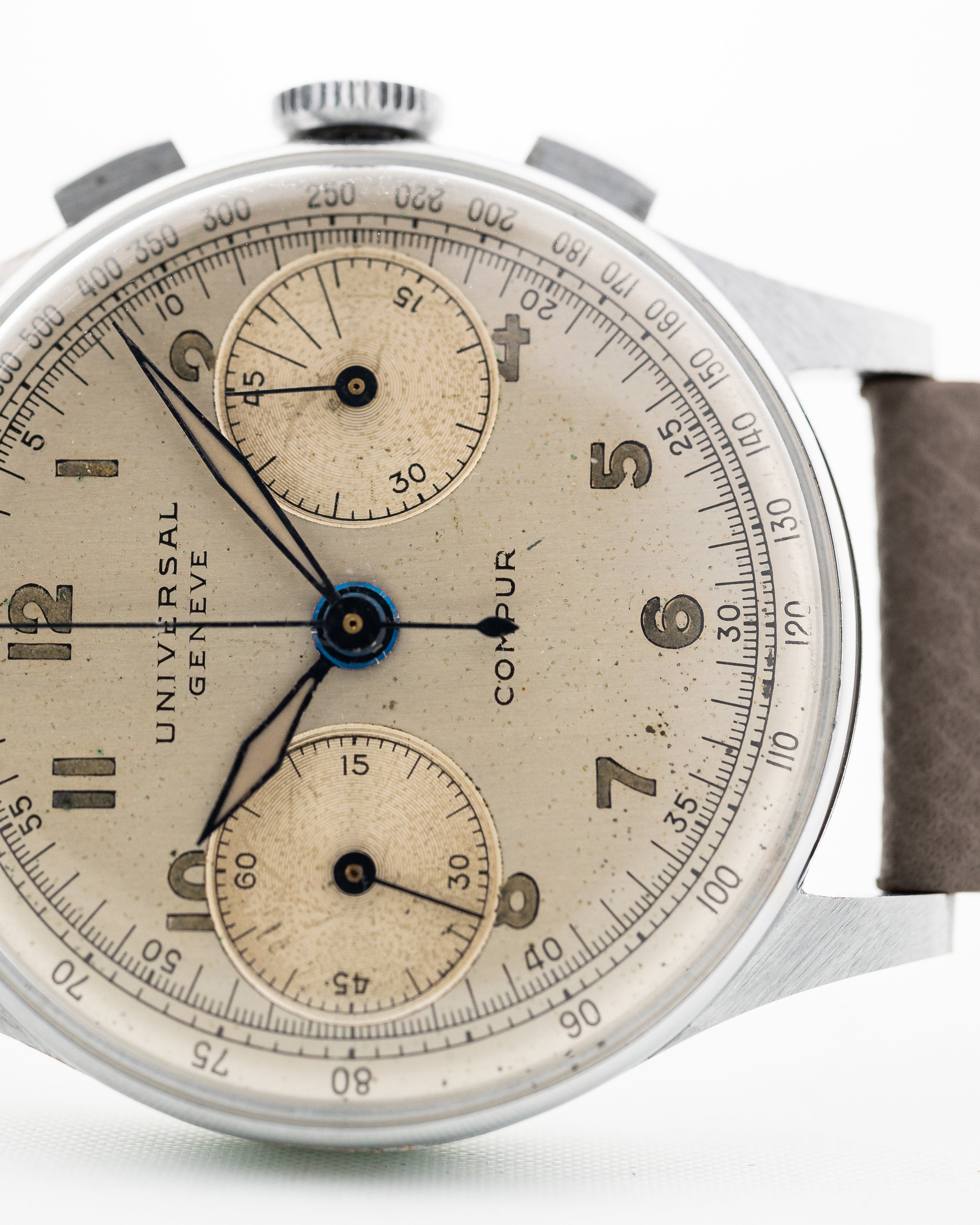 This Universal Geneve Compur is a fantastic example of what the manufacturer did so well in the 1940s. The compact stainless steel case with square pushers houses the desirable caliber 386 movement.