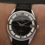 Classic vintage watch worn on a wrist above vintage watches and luxury watches on a desk.