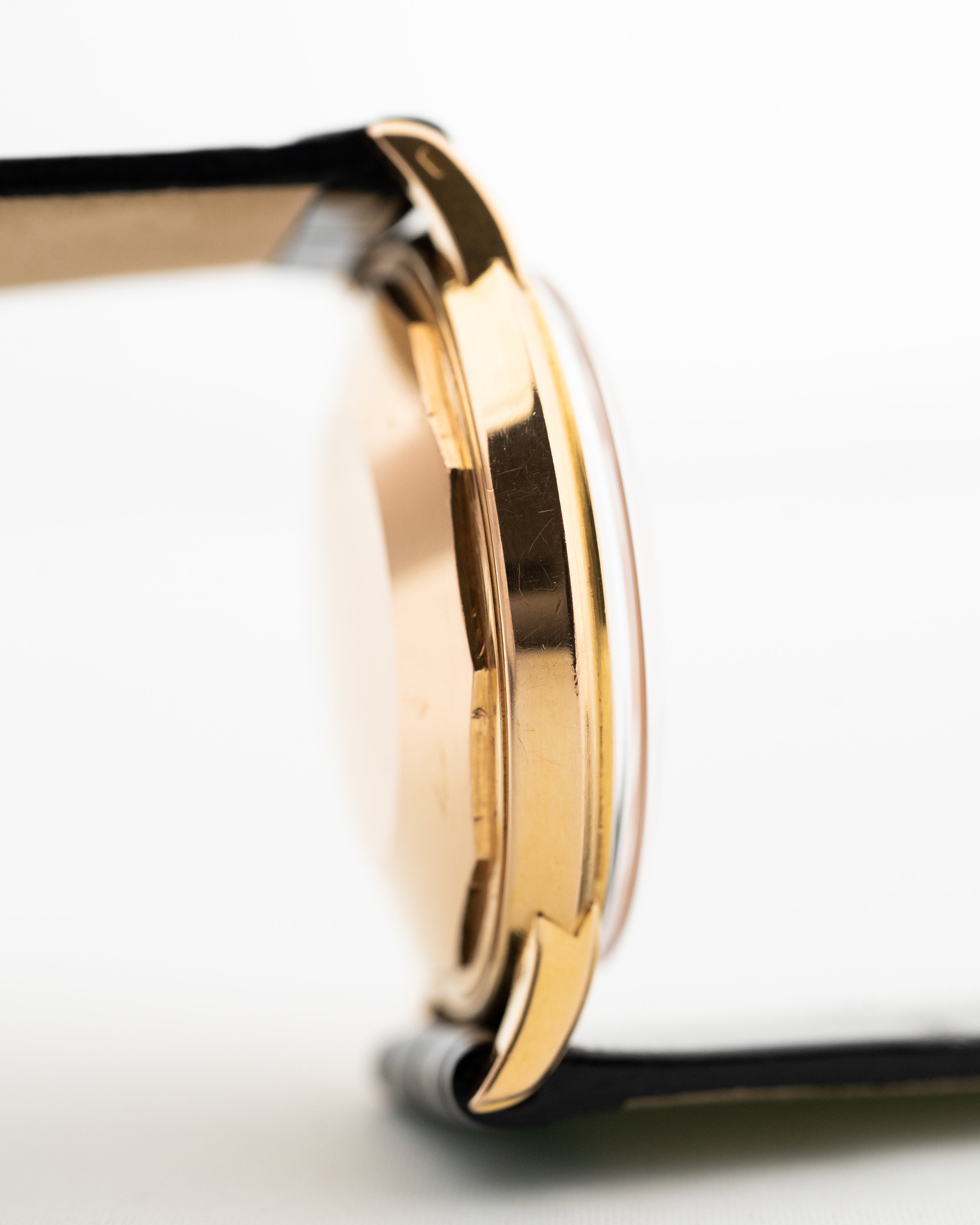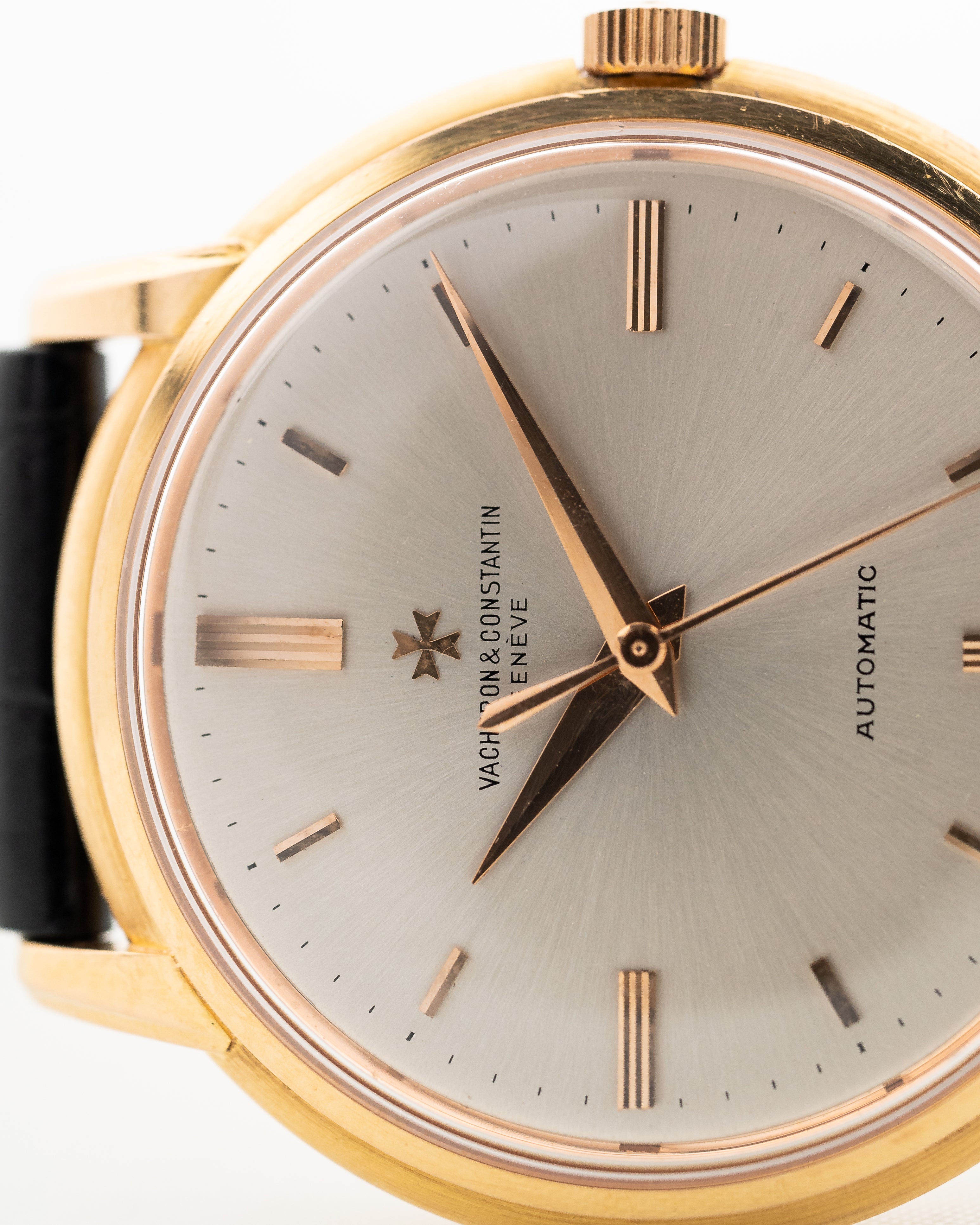 Here we have a beautiful example of a time only, 36 mm Rose Gold Vacheron Constantin ref. 63940 automatic from 1960s. This piece has a silver sunburst dial with applied rose gold hour markers and rose gold dauphine hands. The attention to detail of the hour markers and elegance of the clean dial is rarely seen done so well. This is a classic example of a VC dress watch with simple indicating hours, minutes and seconds and a 18k Wenger case.