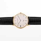 The 32,5 mm, 18K yellow gold case encloses a silver vertically brushed dial, decorated with 8 small diamonds and 4 white gold arrowhead markers. Furthermore, it is adorned by a small seconds at 6 o'clock and plain pin hands complete this total work of art.