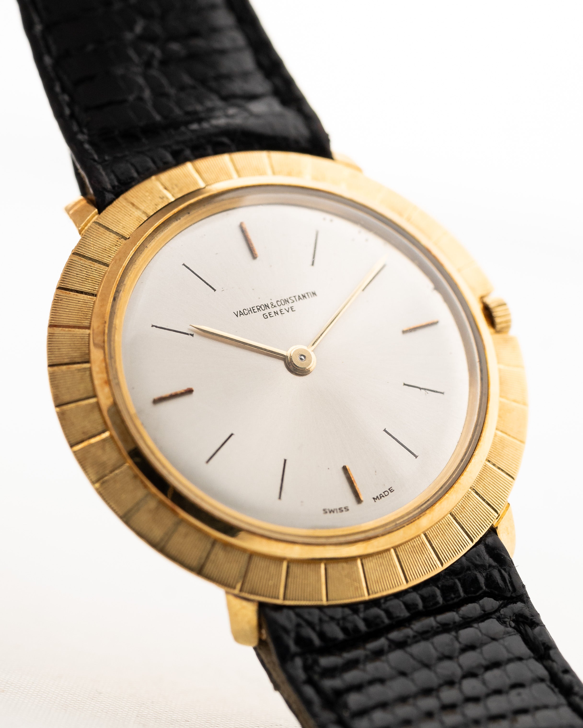When we hold this piece in our hands it simply leaves us speechless. So many details that it is almost difficult to mention them all. Short down turned lugs, stunning fine coin edge bezel finishing, a silver sunburst dial with stick hour markers and hands housing in an 18k yellow gold Disco Volante "Eggy & Cie" case.