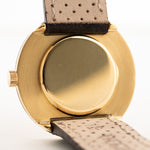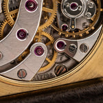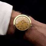 When we hold this piece in our hands it simply leaves us speechless. So many details that it is almost difficult to mention them all. A no lug design, clean bezel finishing, a honey colored dial with stick hour markers and hands housing in an 18k yellow gold Disco Volante case.