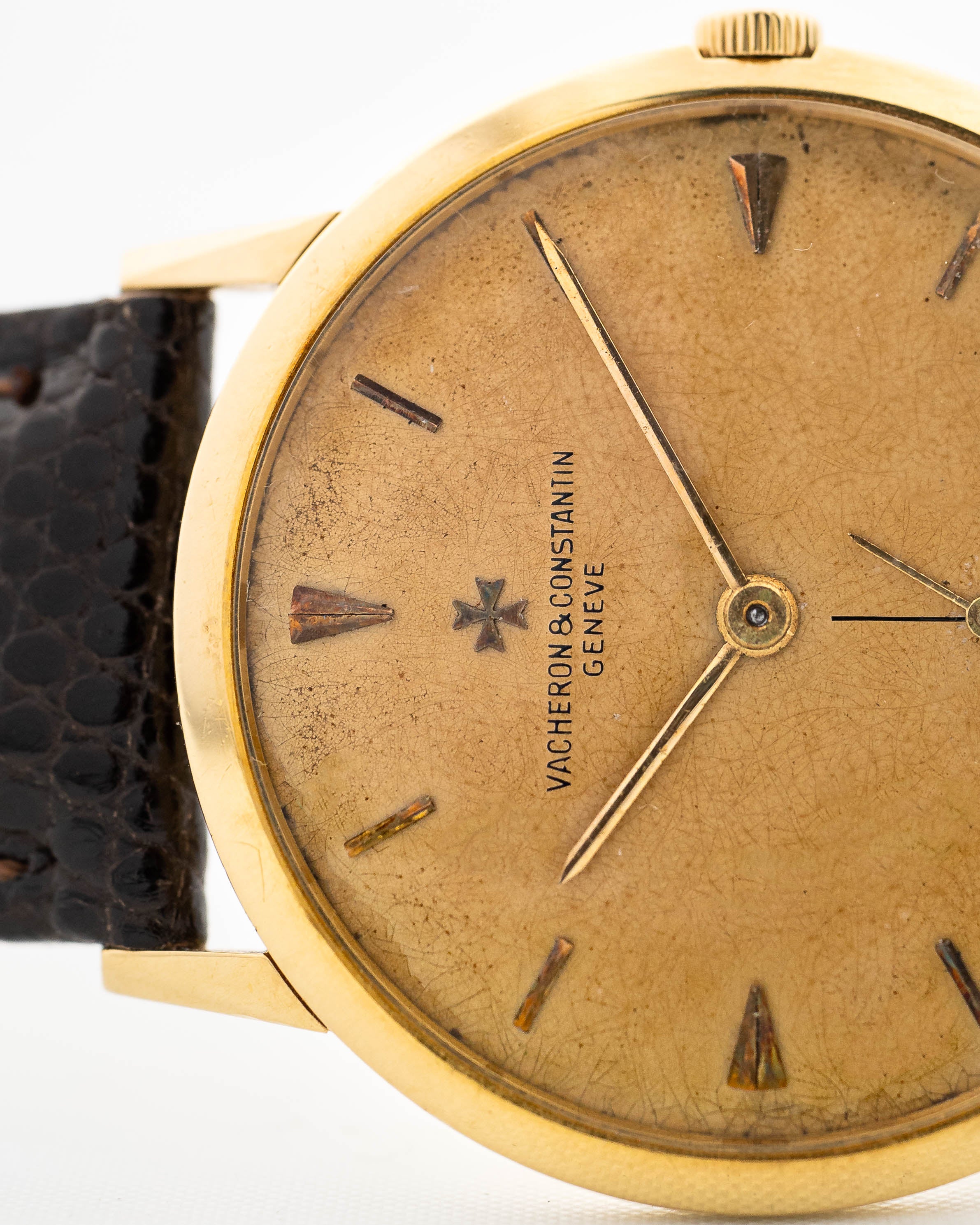 Here we have a beautifully finished Vacheron Constantin dress watch from the 1950s with a  ultra thin case and an amazingly designed Calatrava dial which developed a unique warm and even patina.