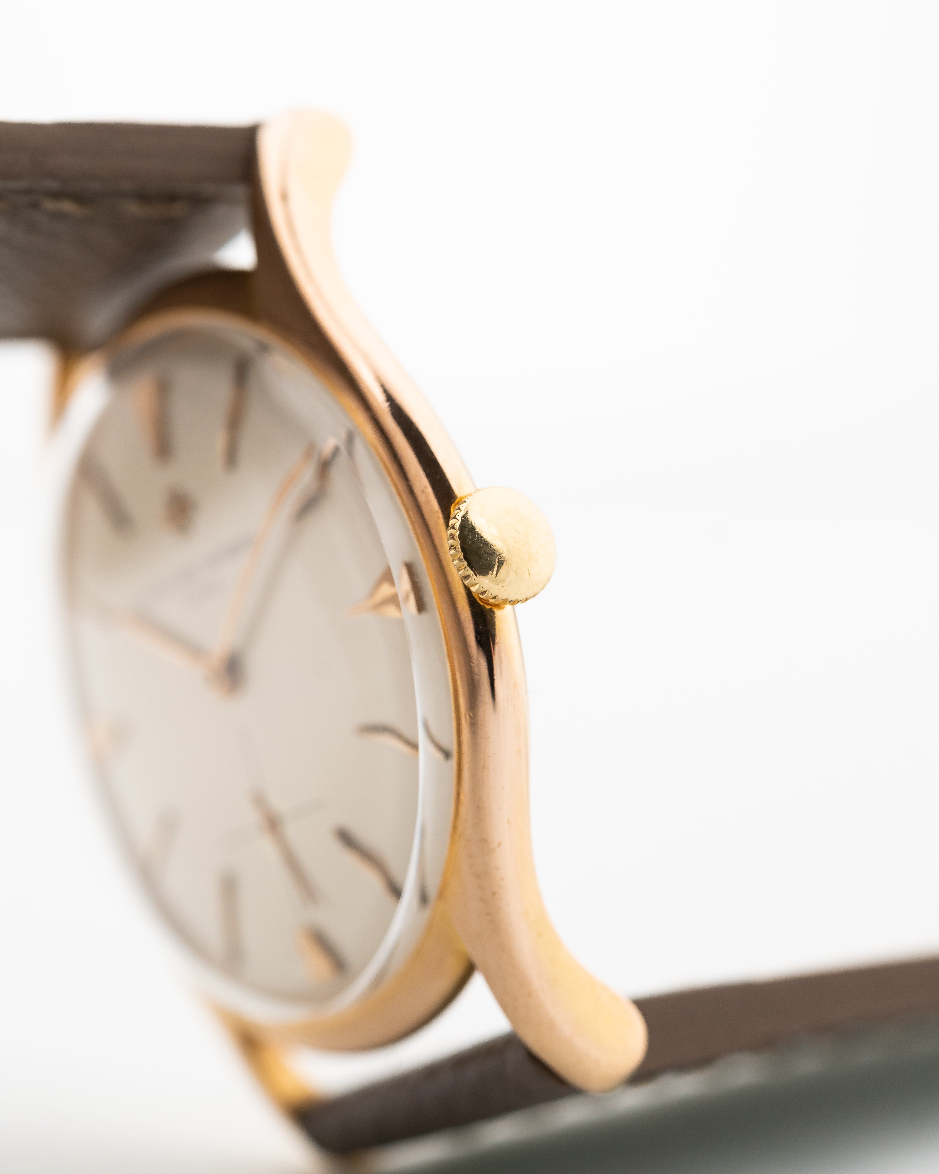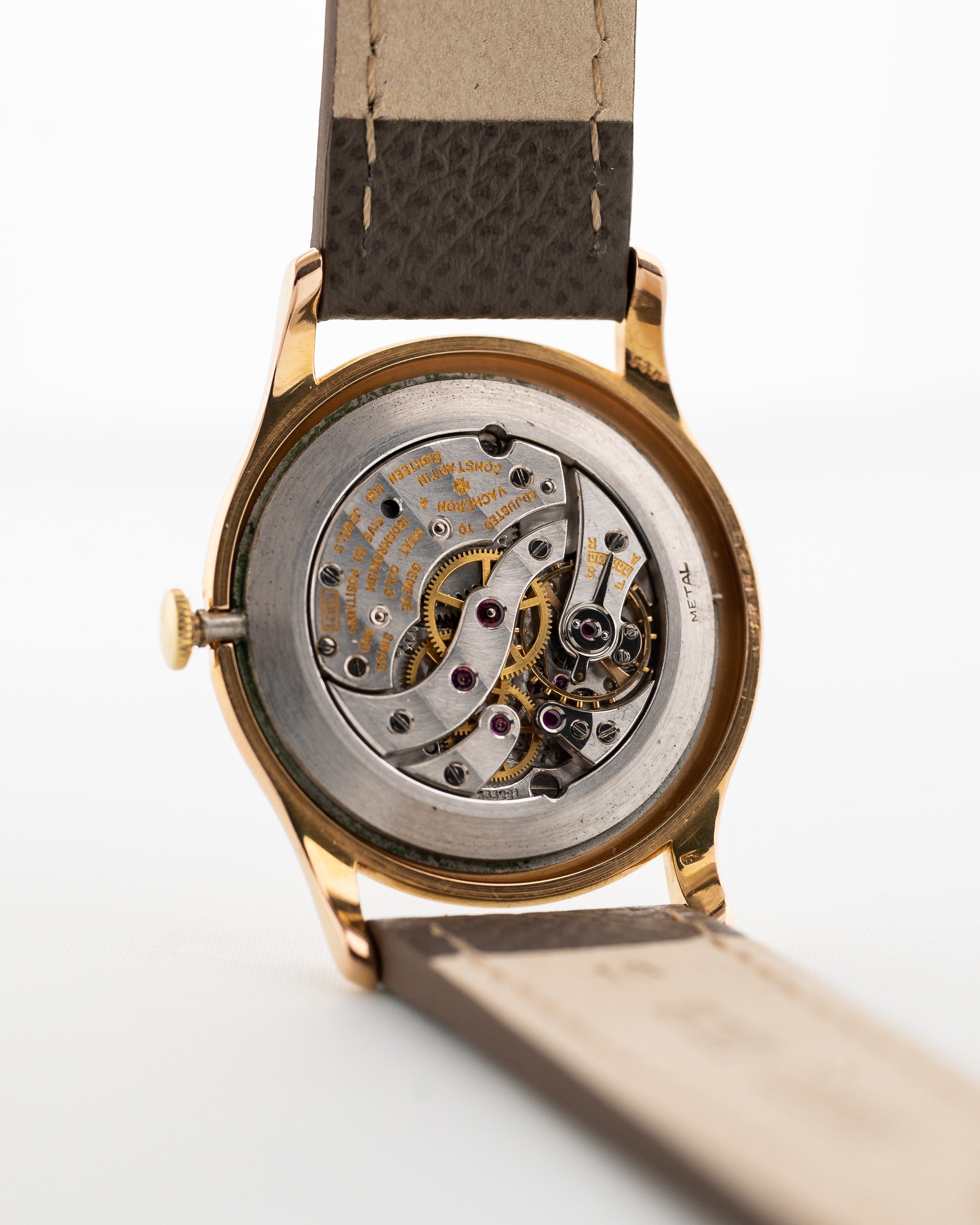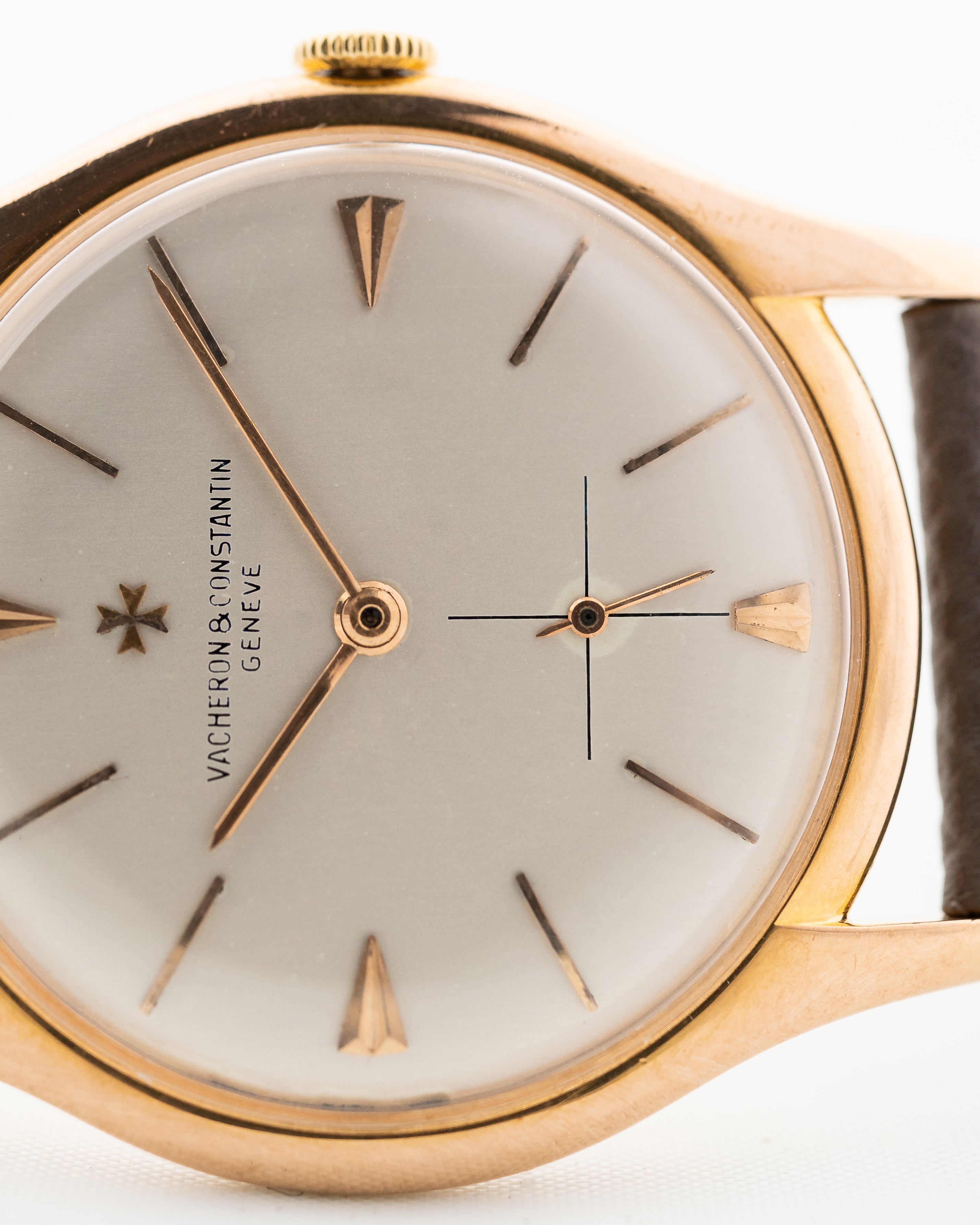 Here we have a beautifully finished Vacheron Constantin dress watch from the 1950s with an amazingly designed dial, sub second and filigree rose gold hour markers and hands.