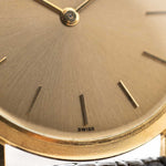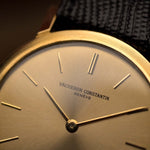 A refined Vacheron Constantin Patrimony dress watch from the 1960s, defined by its ultra-thin 18k yellow gold case and elegant coin-finished bezel. The beautifully preserved golden sunburst dial features stick hands and hour markers, creating a subtle yet striking contrast that embodies mid-century sophistication.