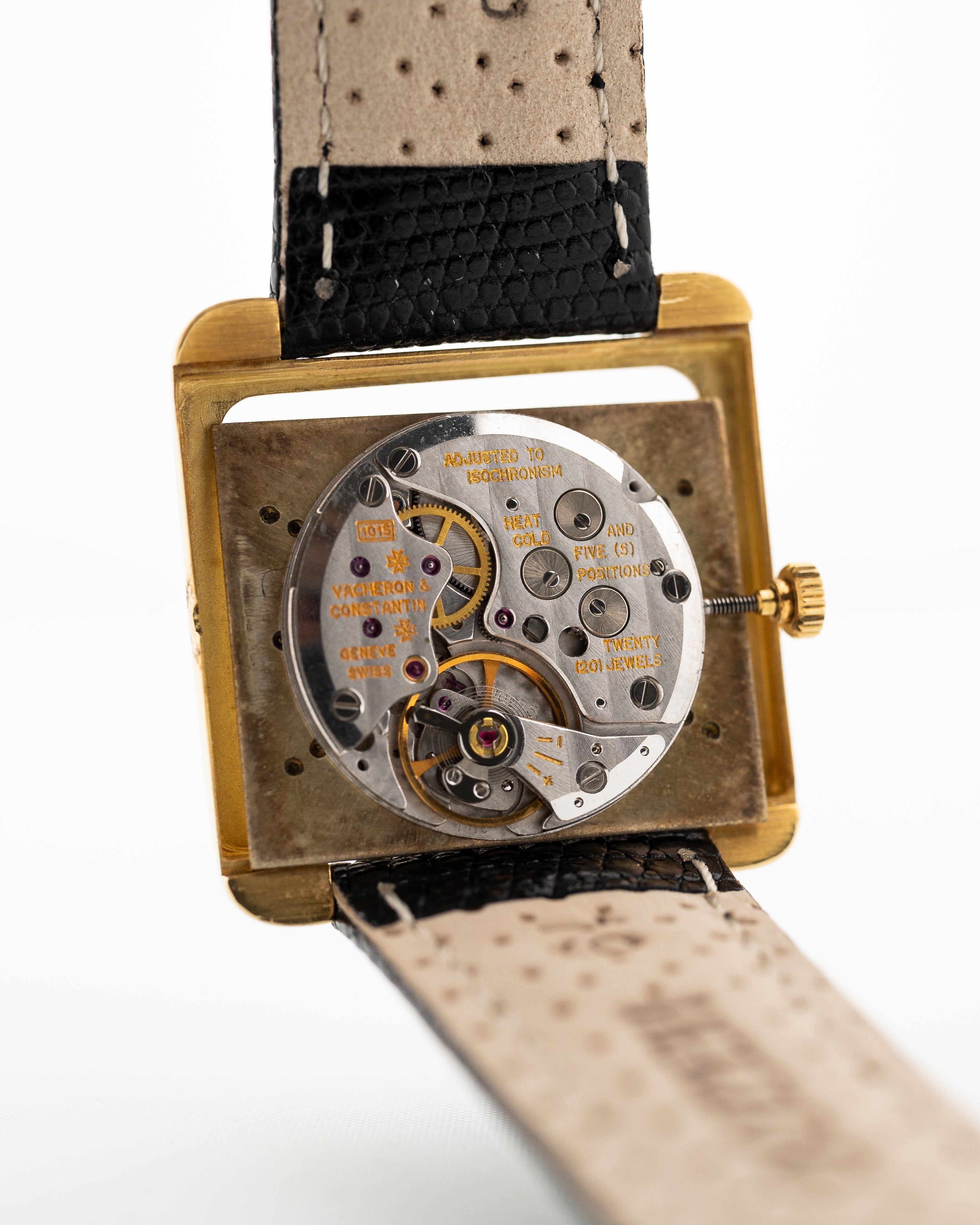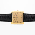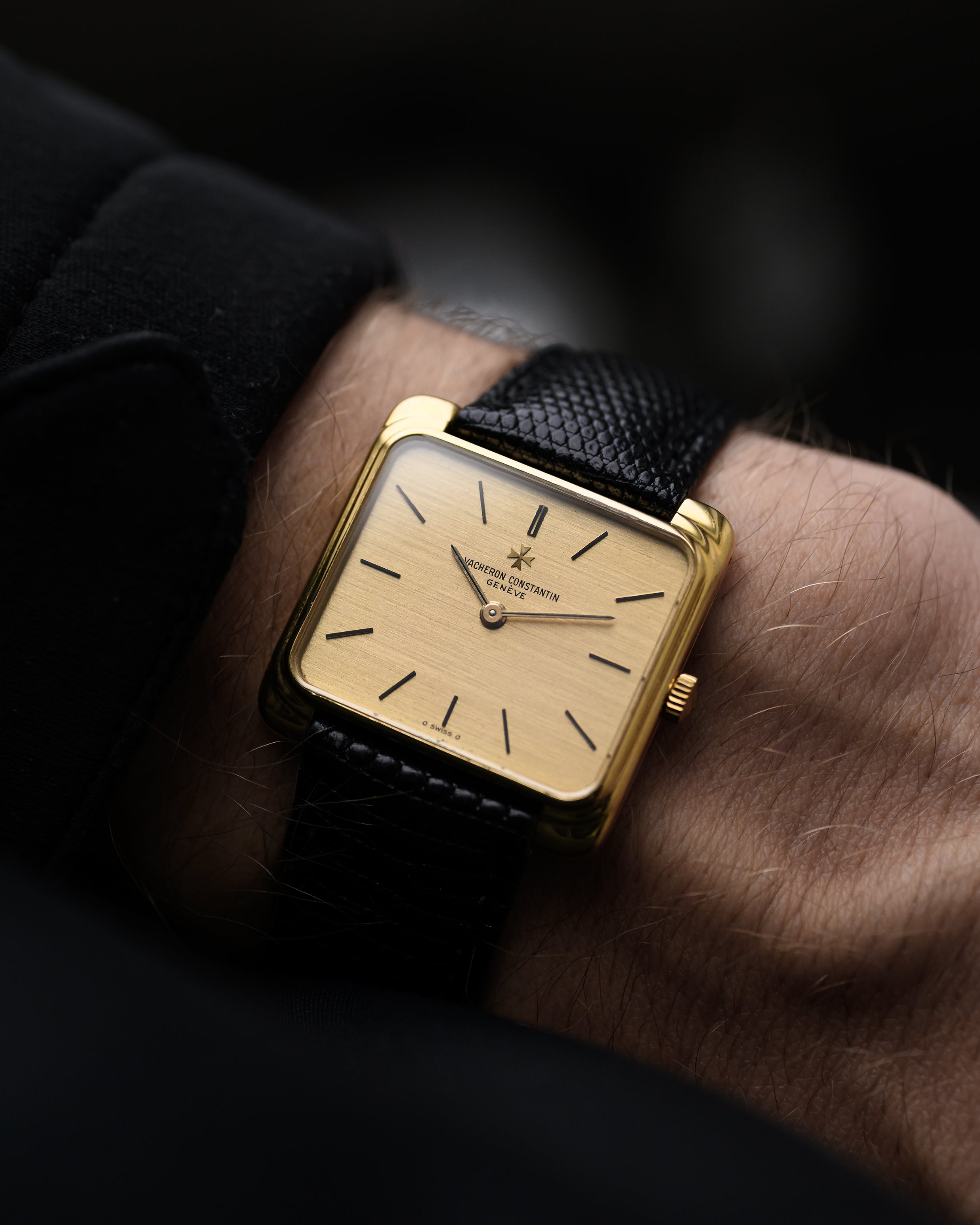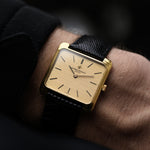 Here we have a beautifully finished 18k yellow gold Vacheron Constantin dress watch in a tank design from the 1970s. This particular piece is notable for its beautiful 18k sigma dial, applied Vacheron Logo, and a strong unpolished 18k yellow gold case.