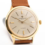 Here we have a beautiful example of a time only, 35,5 mm yellow gold Vacheron Constantin ref. 6592 automatic from 1960s. This piece has a silver dial with applied yellow gold hour markers and stick hands. The attention to detail of the hour markers and elegance of the clean dial is rarely seen done so well. This is a classic example of a VC dress watch with simple indicating hours, minutes and seconds and a 18k Gerlach case.