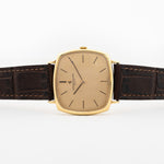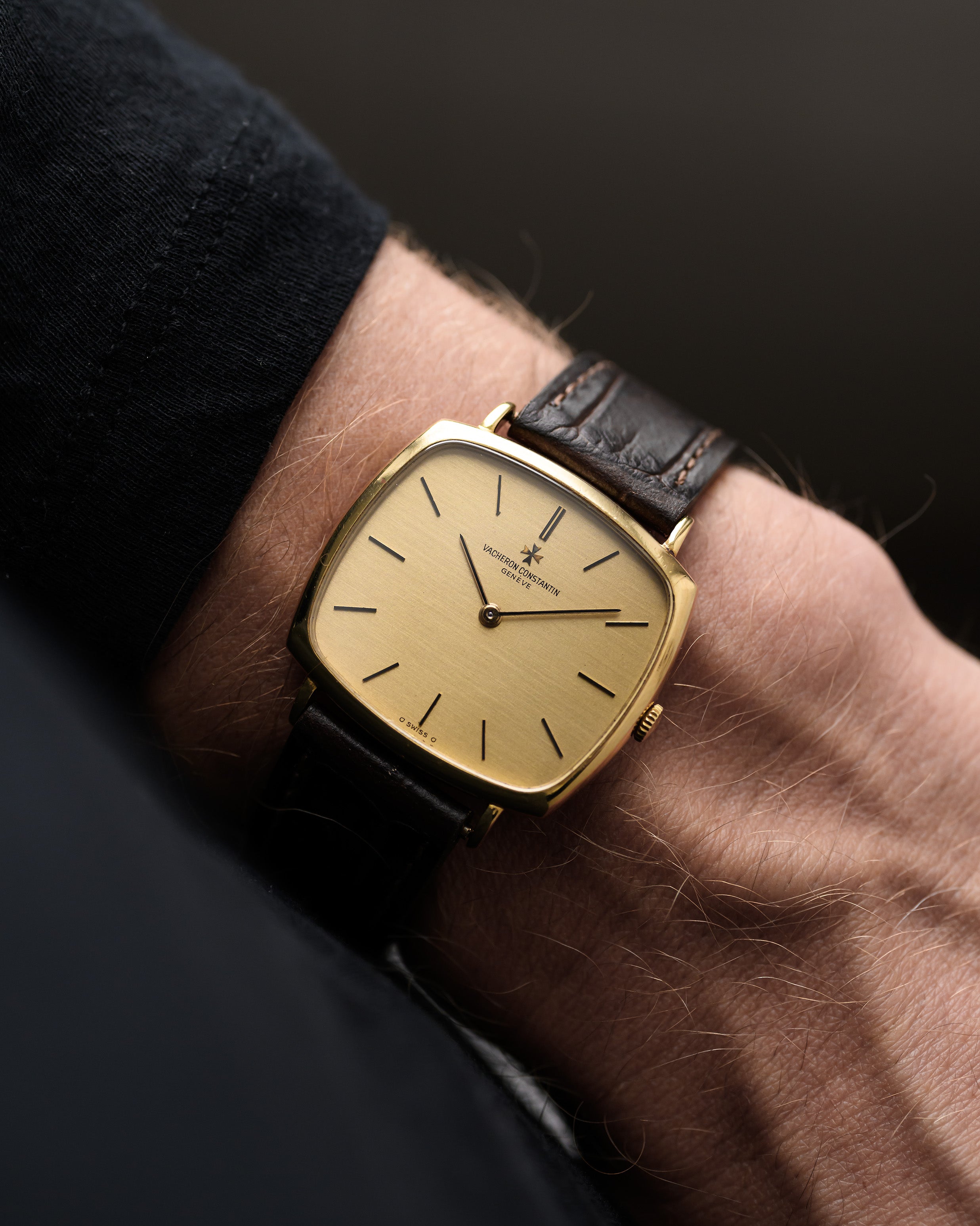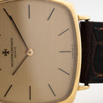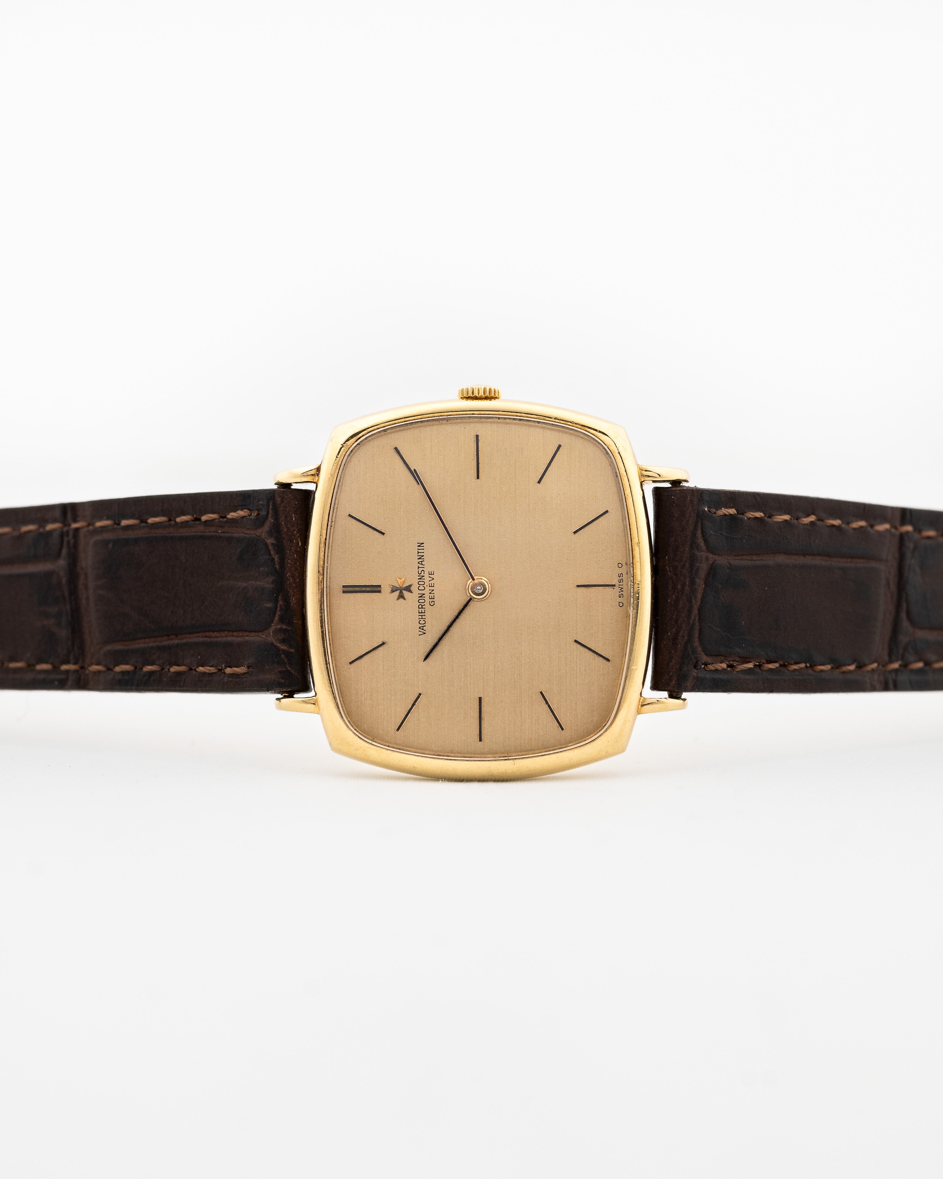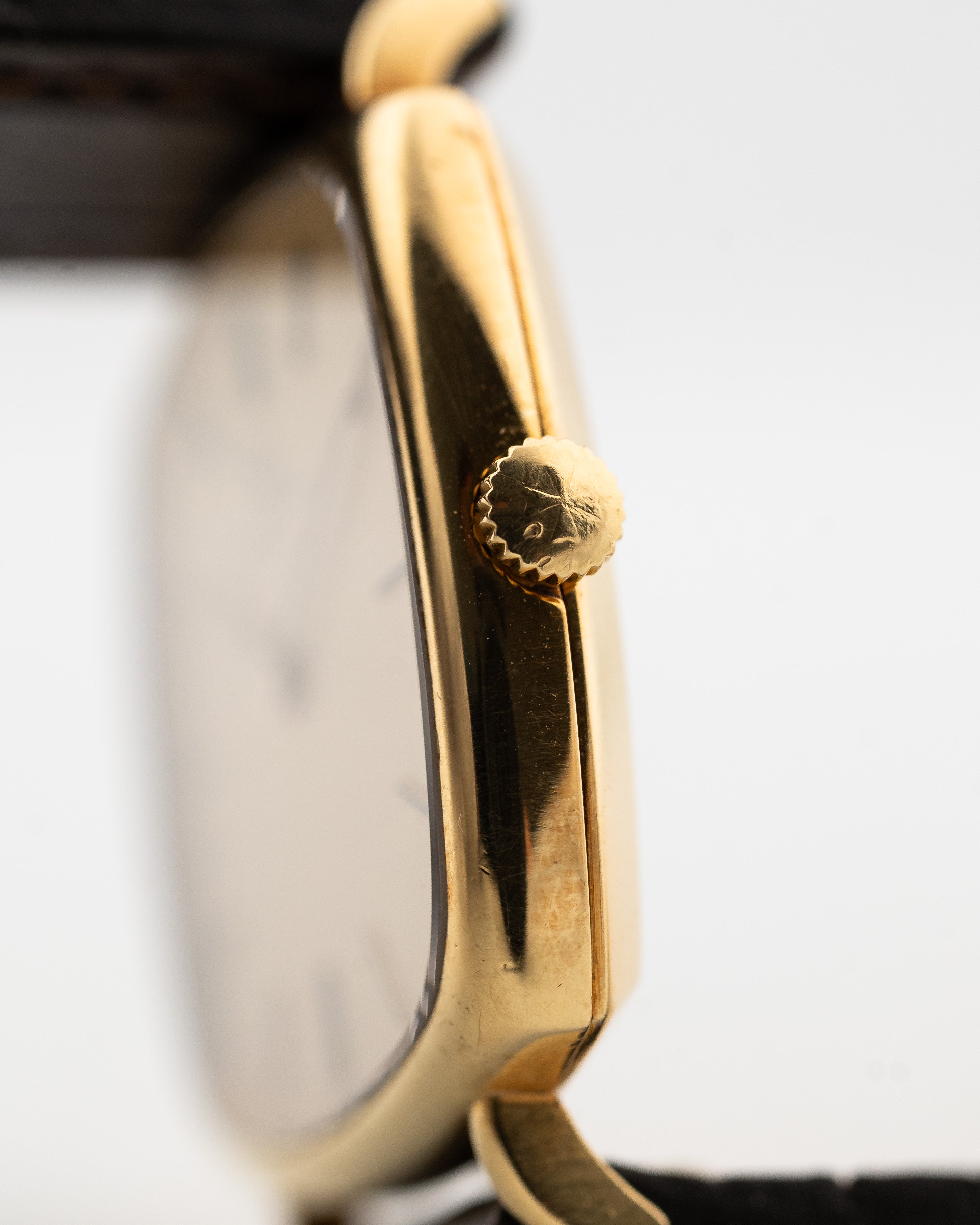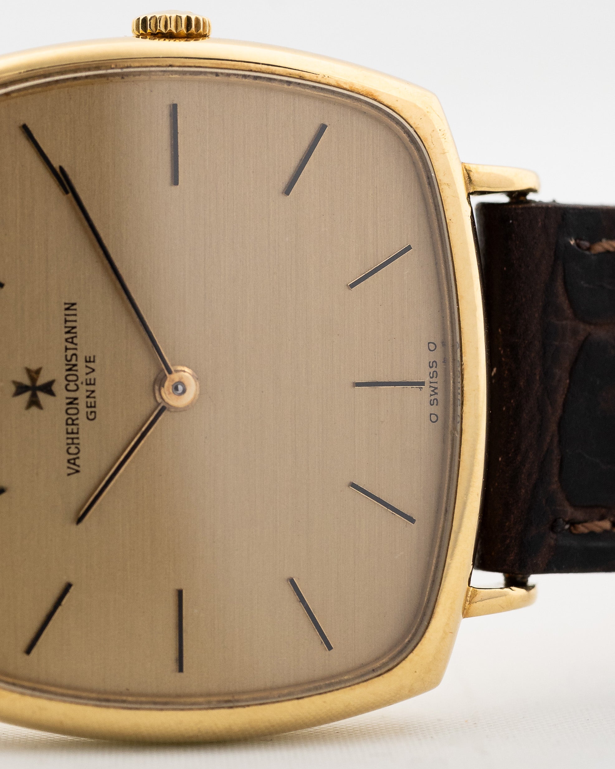Here we have a beautifully finished 18k yellow gold Vacheron Constantin dress watch in a tank design from the 1970s. This particular piece is notable for its beautiful 18k sigma dial, applied Vacheron Logo, and a strong 18k yellow gold case.