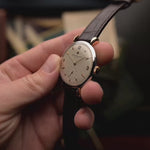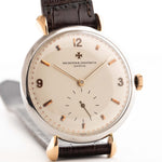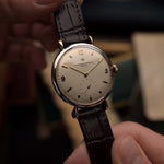 A beautifully preserved Vacheron Constantin from the late 1930s, distinguished by its rare two-tone case construction: a stainless steel body paired with sculptural 18k rose gold teardrop lugs. The untouched silver enamel dial is a masterpiece of subtle detailing, featuring rose gold indexes, matching hands, and an elegant outer minute track — a composition that radiates pre-war refinement.