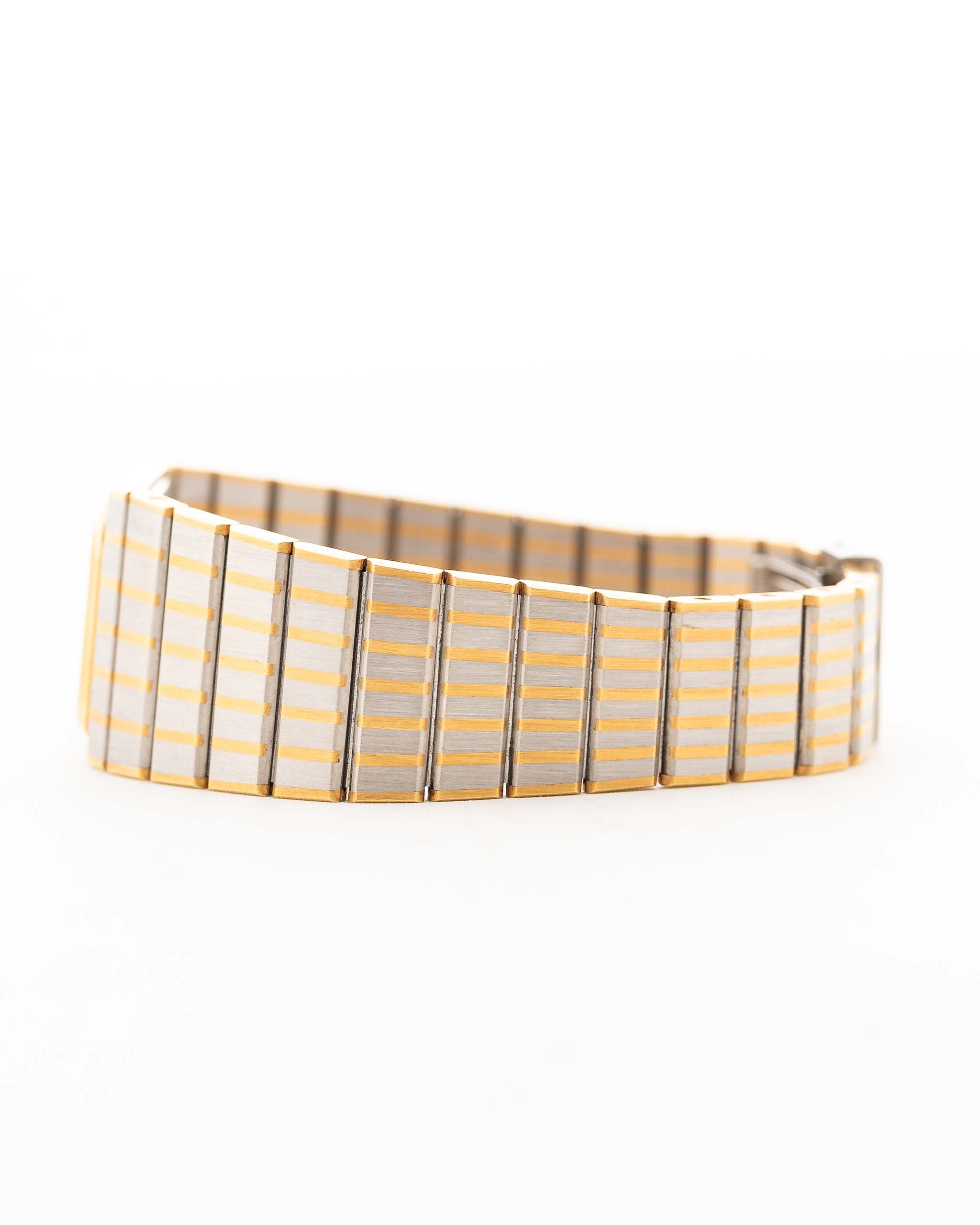 • 18K 黃金 / 不鏽鋼 AP 手鍊,完整鏈節最長 18.5 公分,厚度 2.5 公釐 (鏈節可拆下)