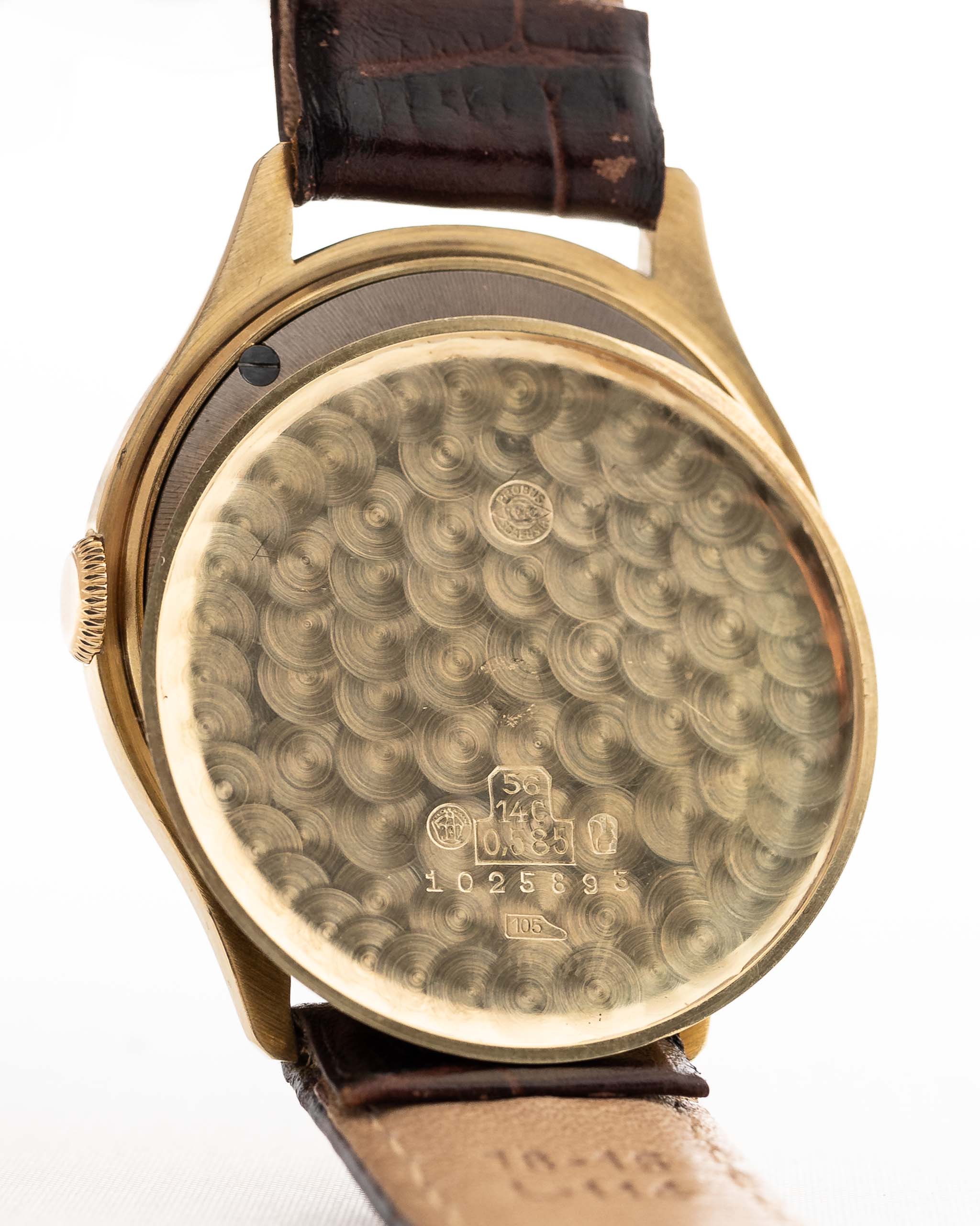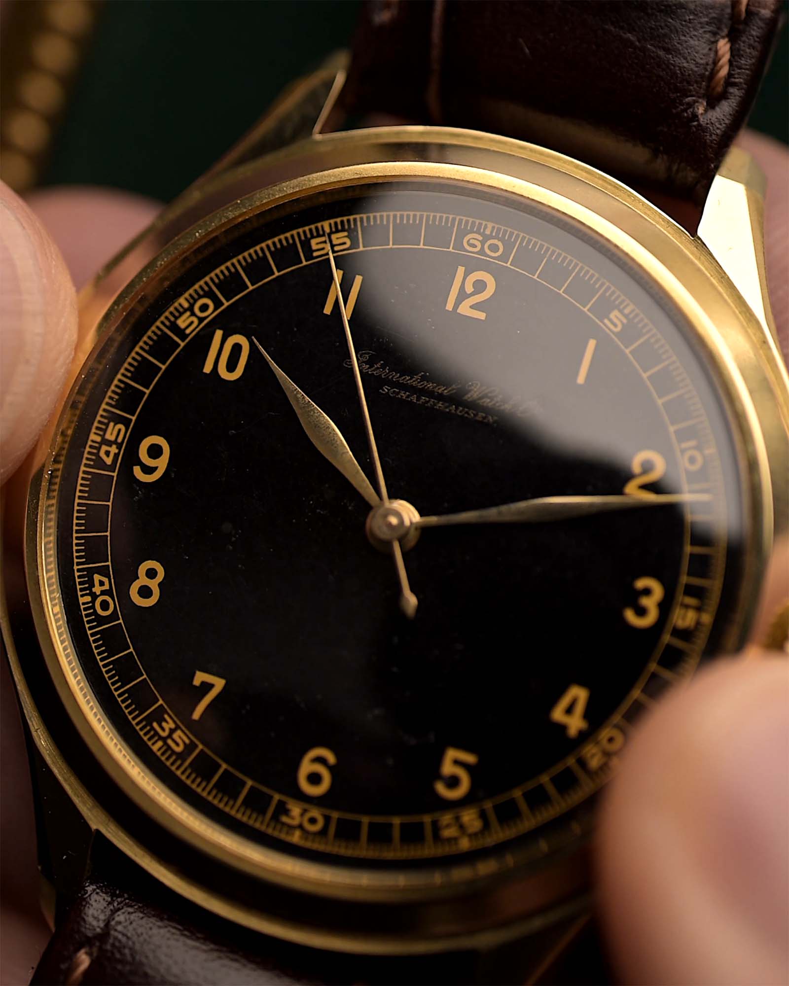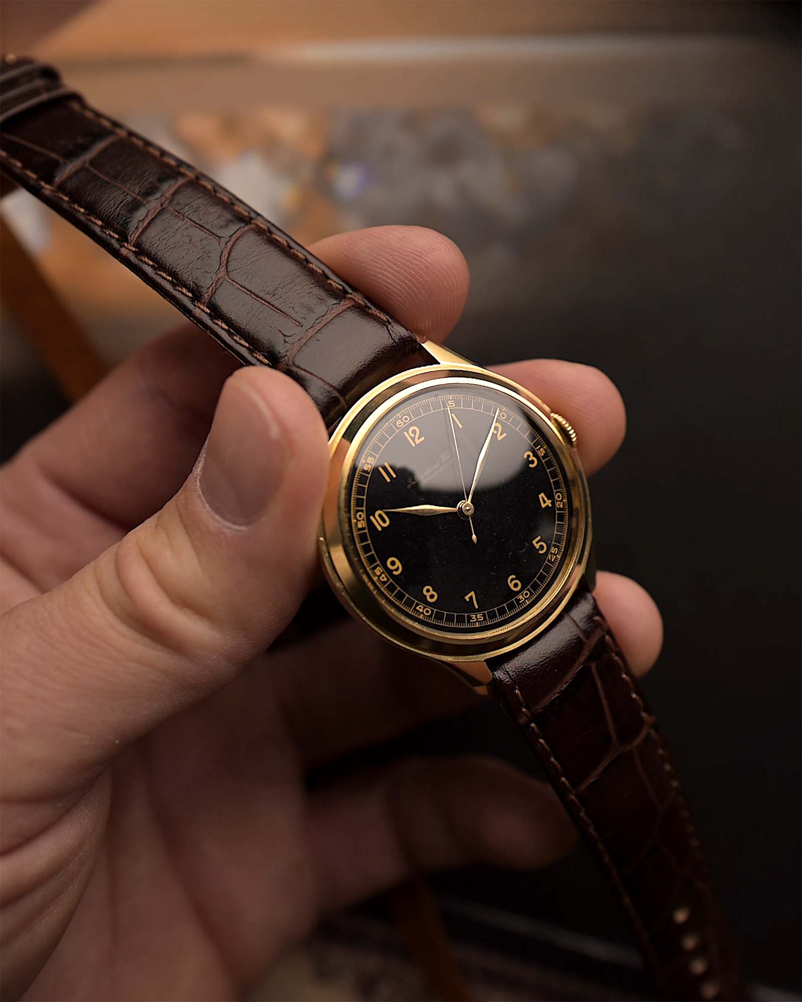 Elegant, oversized, and nearly impossible to find — this 1937 IWC Pre “Hermet” is a remarkable artifact from the golden age of Swiss horology. With a large-for-its-time 36.5 mm solid 14k yellow gold case, it was designed with both innovation and aesthetics in mind.