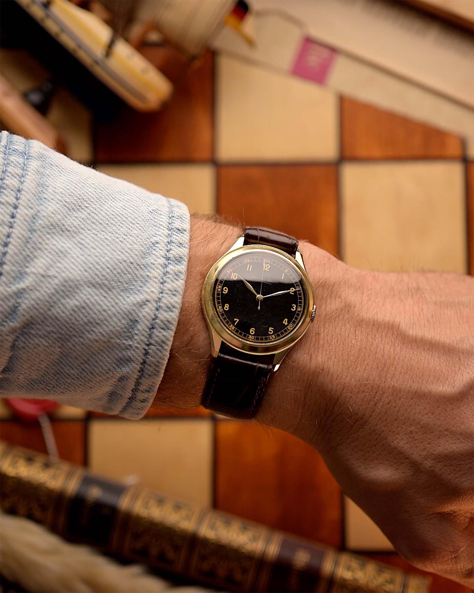 - 3-體 14K 黃金錶殼,搭配錶殼製造商 Les Fils de Jules Blum 的卡扣式錶背。