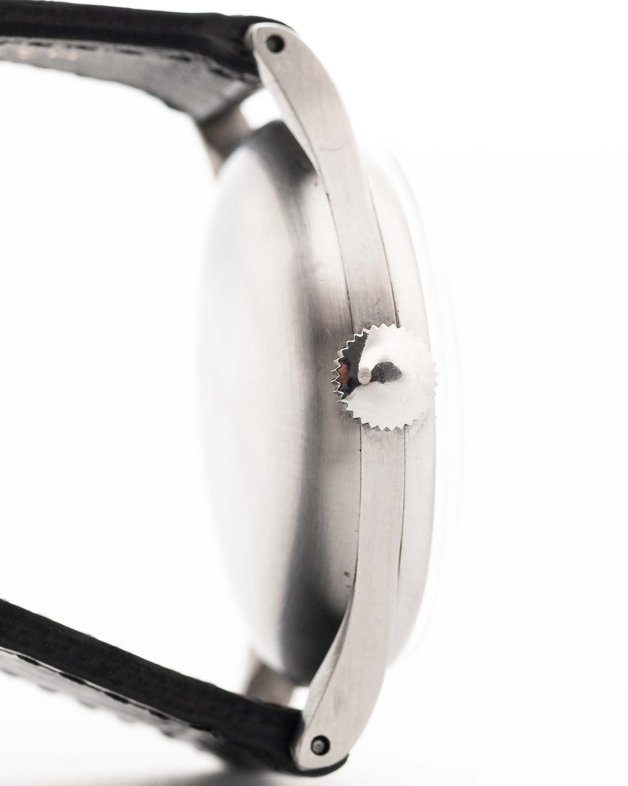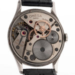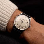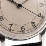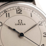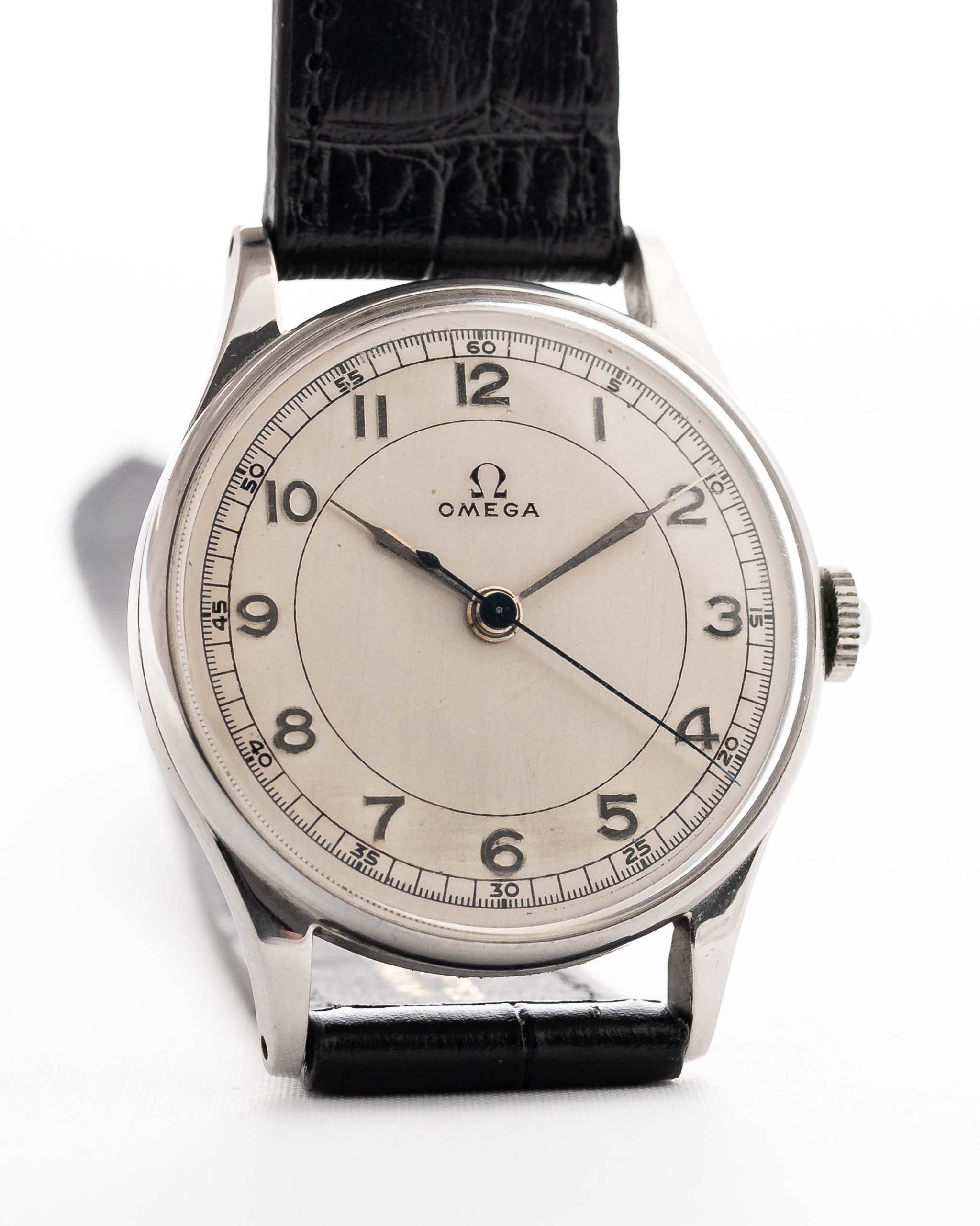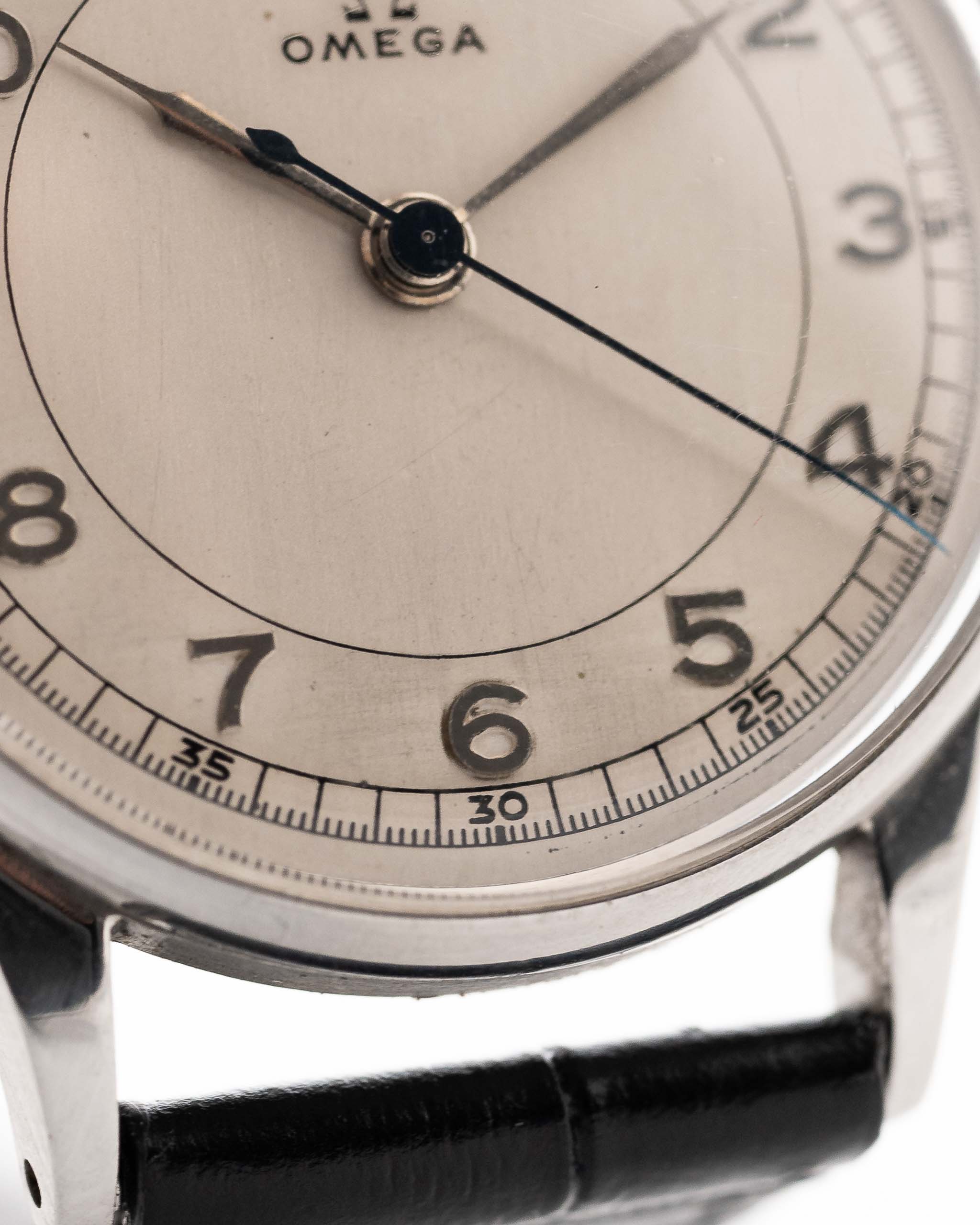 另一款罕見的 40 年代歐米茄腕表,保存狀況令人難以置信。潔淨的銀色雙色錶盤、阿拉伯數字、針筒指針和藍鋼秒針 - 優雅的組合。