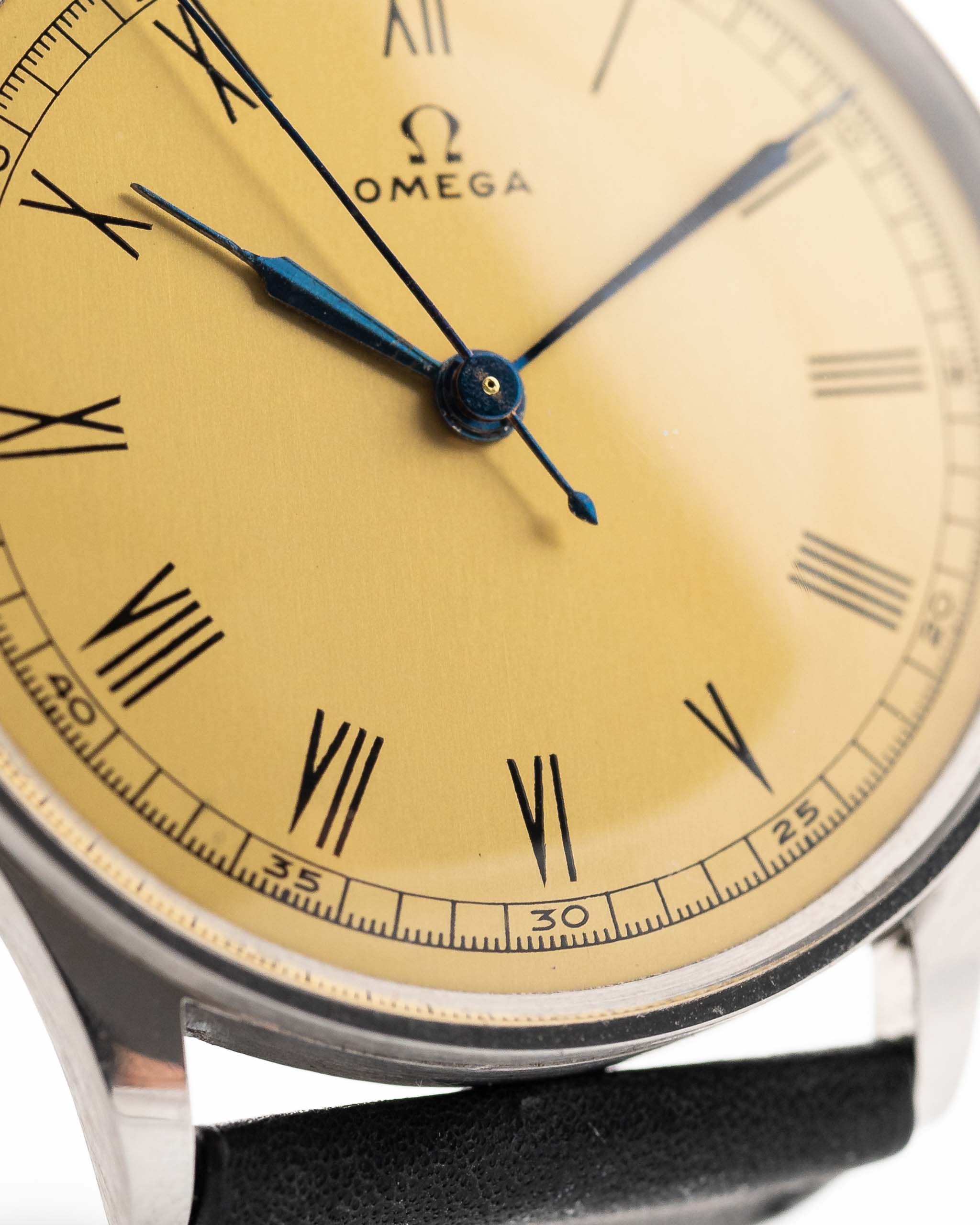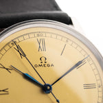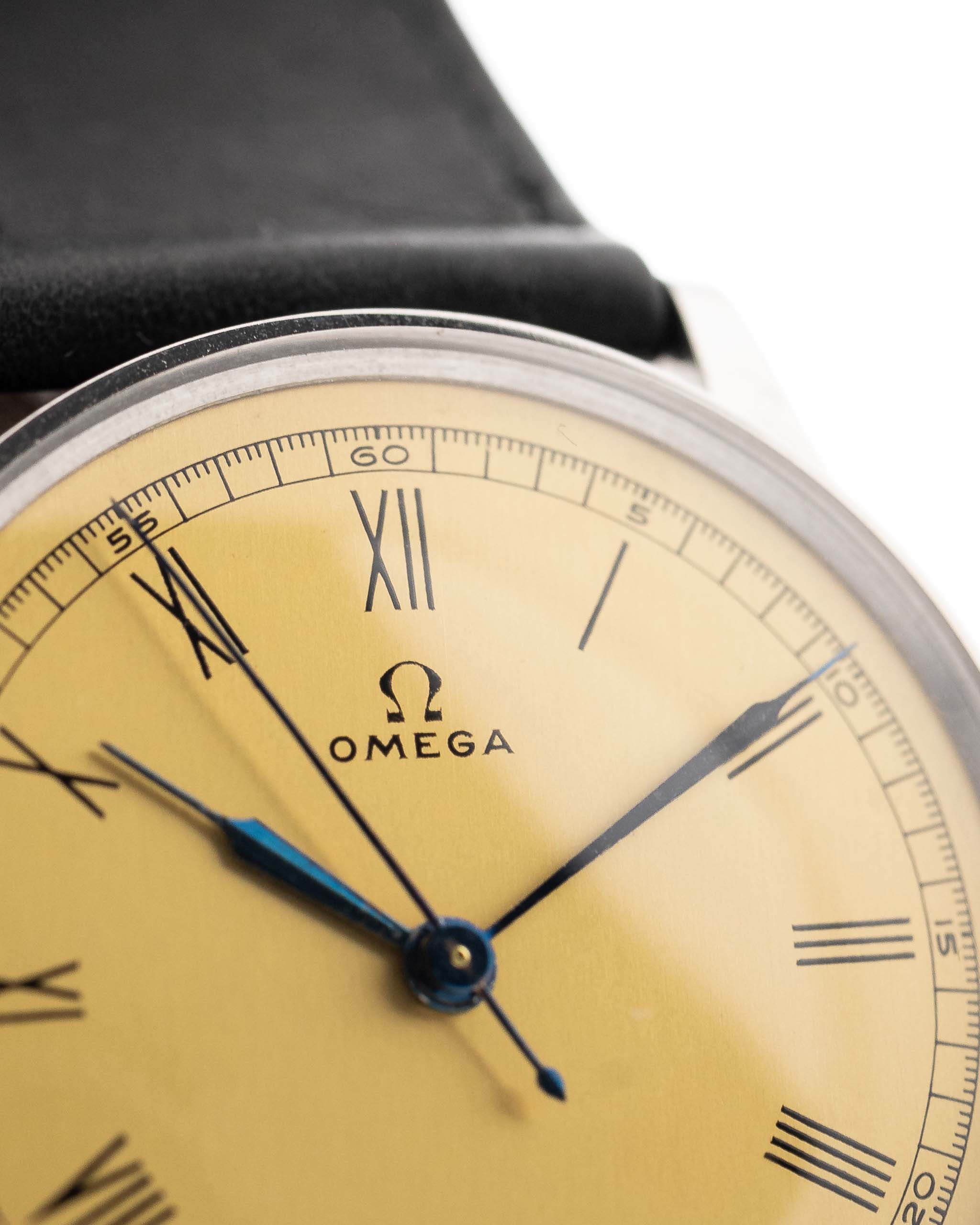 要找到一枚狀態良好的 1930 年代歐米茄腕表並不容易,但要找到一枚擁有美麗的金色無瑕表盤、羅馬裝飾藝術數字和匹配的藍鋼針筒指針的腕表,幾乎是不可能的。