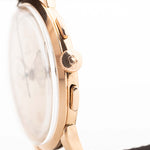 我們這款腕錶採用 37.5 mm 玫瑰金大錶殼,錶殼和錶耳均經過倒角處理。令人讚嘆的玫瑰金針筒指針和時標等裝飾,讓這款腕錶更顯高貴。