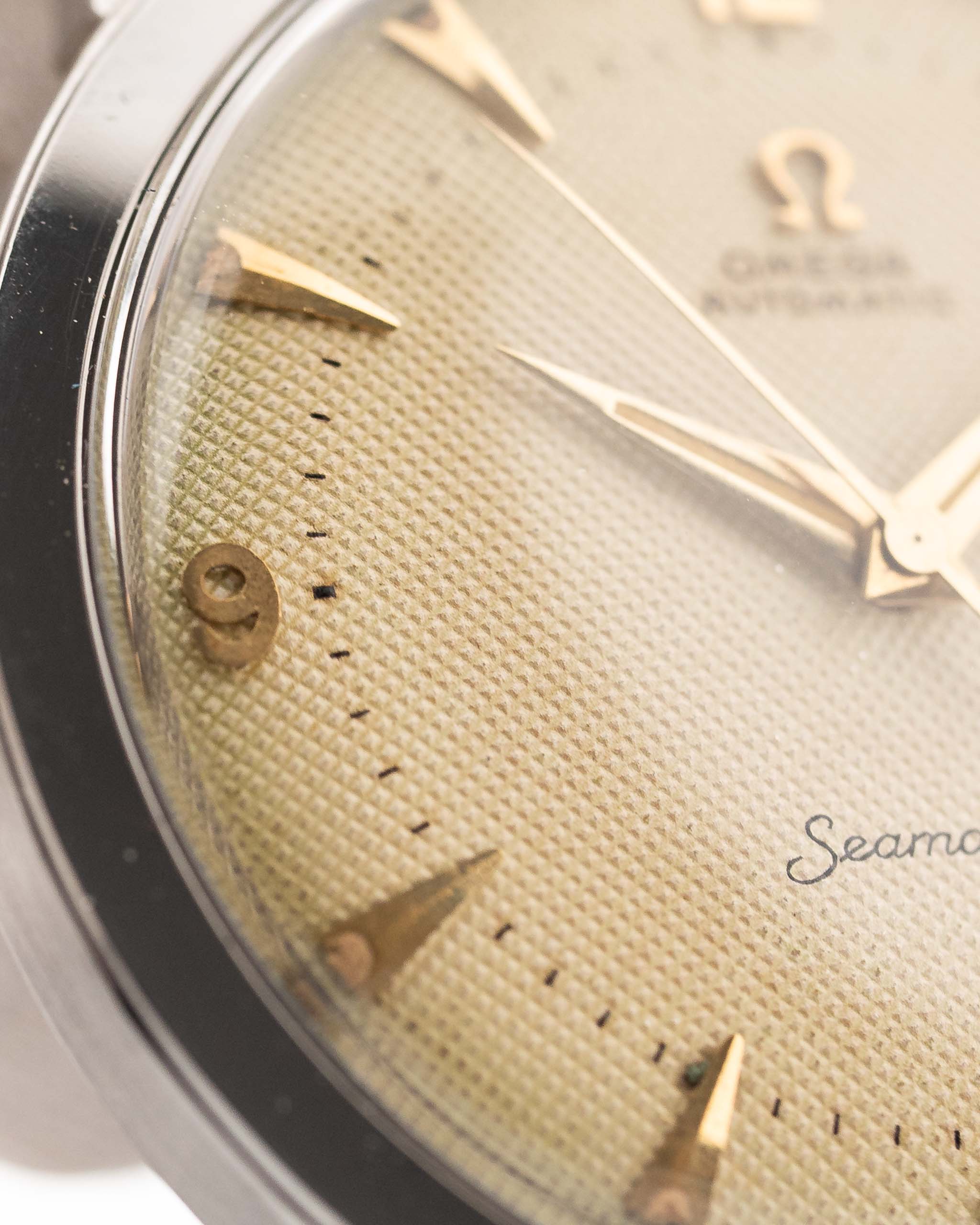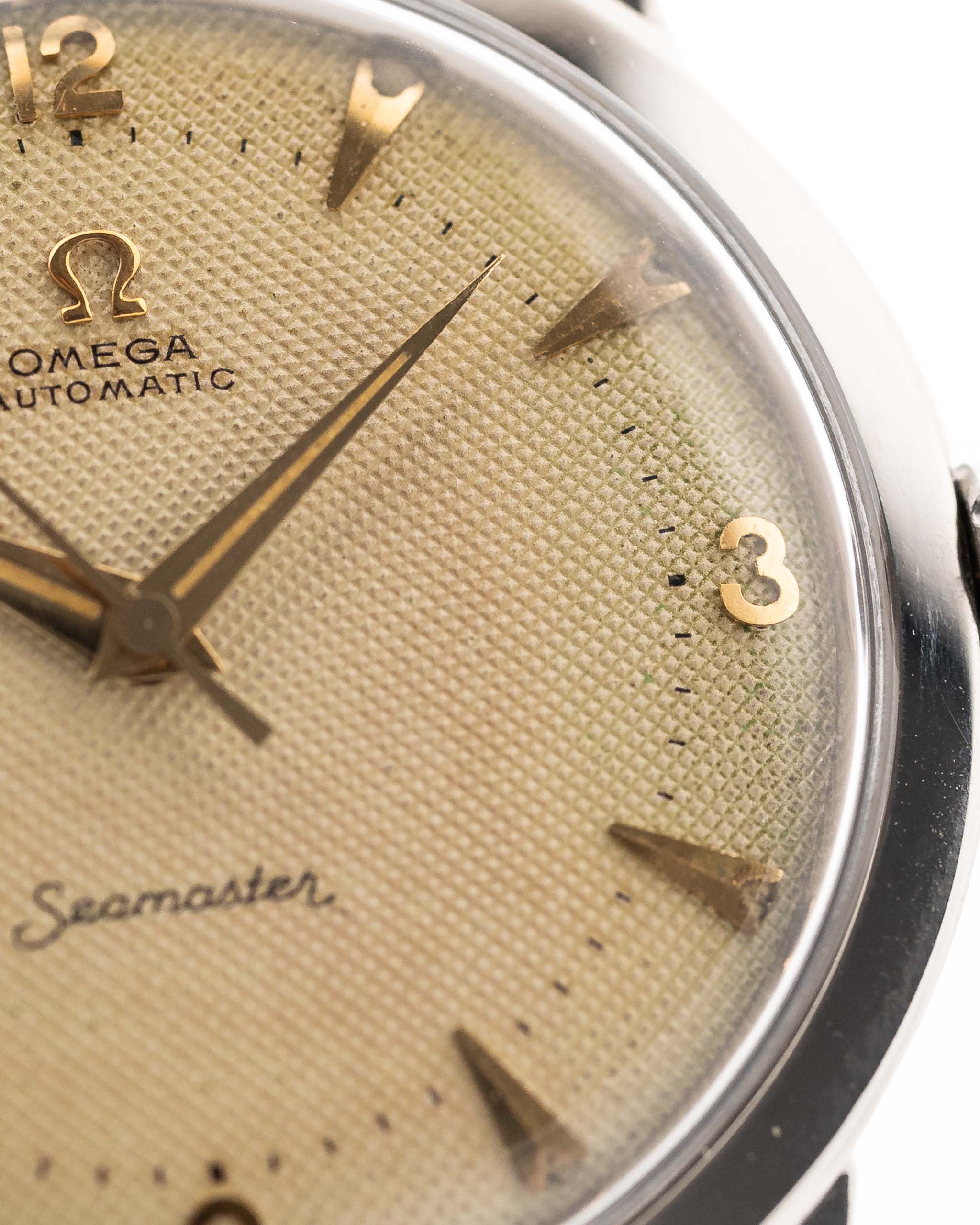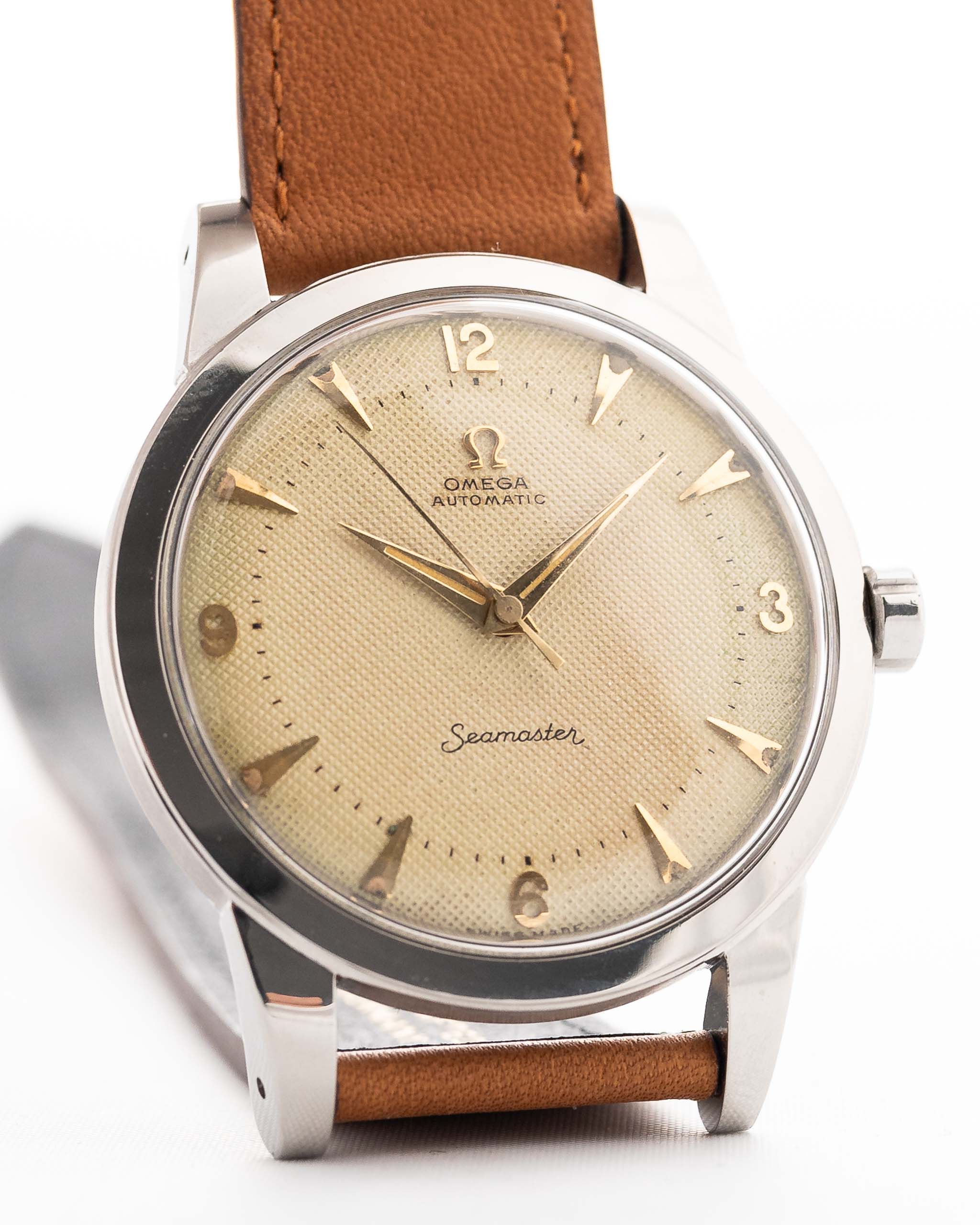 在此您可以看到 Omega 於 1952 年製造的迷人海馬腕錶。這款腕錶採用 36 mm 精鋼錶殼,錶耳微微向下傾斜,配備美麗的蜂巢狀錶盤、匕首時標和太子妃式指針。