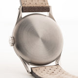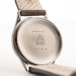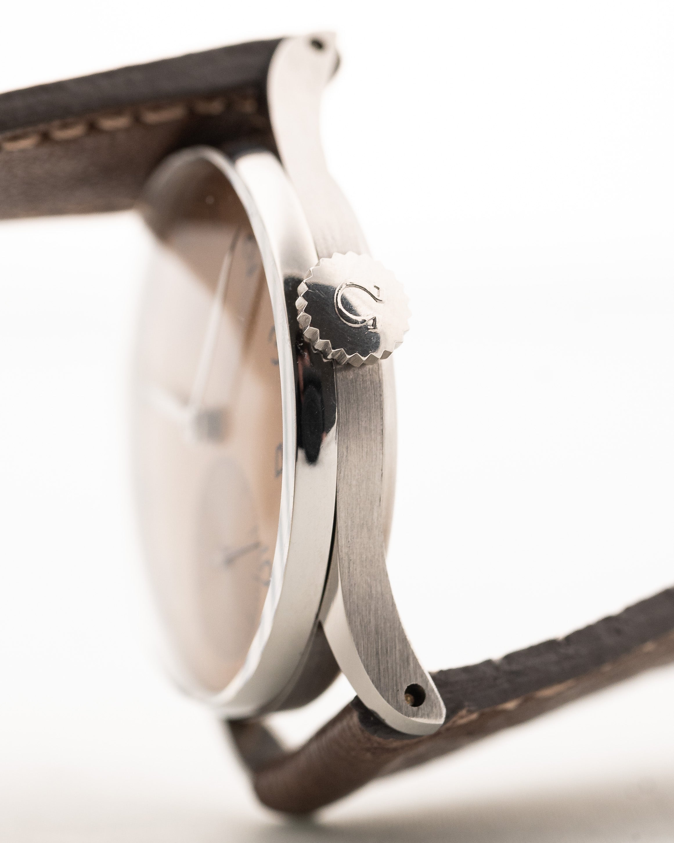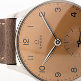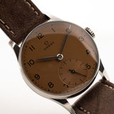 在此您可以看到 Omega 於 1947 年製造的迷人正裝腕錶。它擁有 33mm 不銹鋼錶殼、纖薄簡約的斜角錶耳、完美無瑕的卡布奇諾錶盤和不銹鋼葉形指針,是一款讓人屏息凝神的作品。