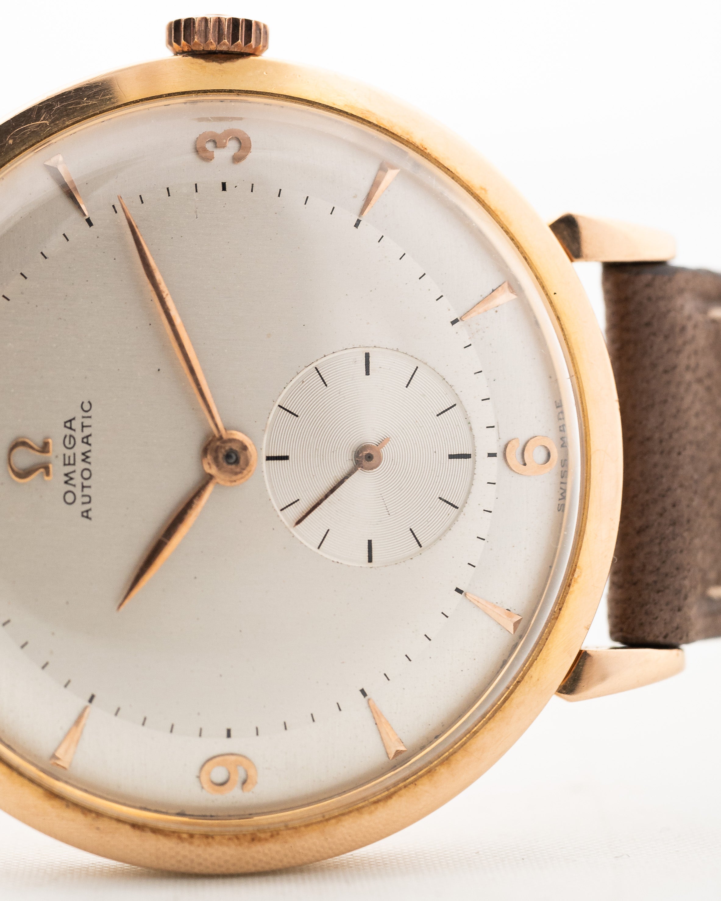 1950 年代是歐米茄的好時光,這款美麗的正裝腕錶就是最好的例證。這款腕錶不僅美觀,而且實用。37.5毫米的玫瑰金錶殼、下翻式錶耳、華麗的白色和灰色雙色錶盤,讓人愛不釋手。