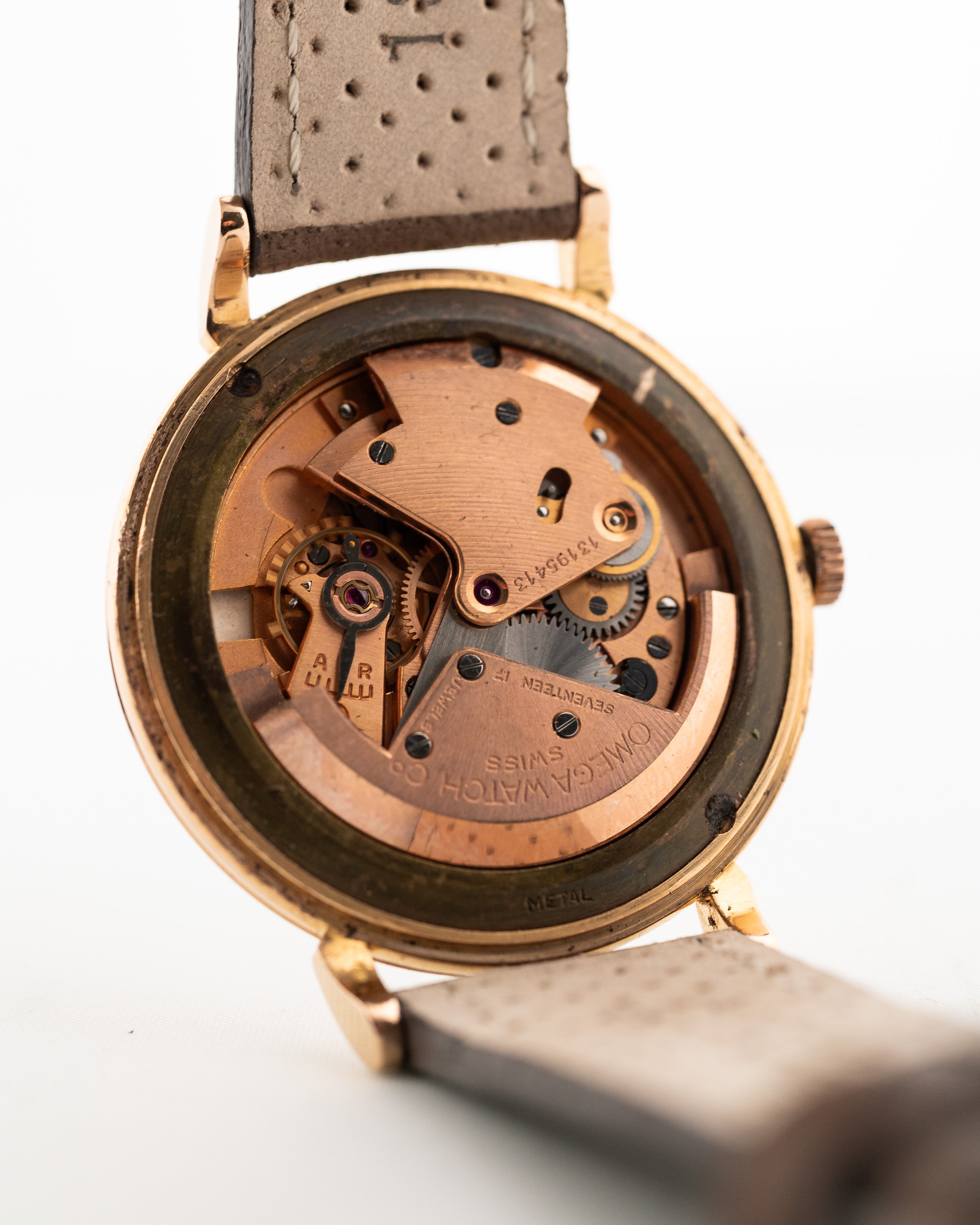 錶盤狀態極佳,錶盤上有玫瑰金阿拉伯數字、巨大的輔助秒針、玫瑰金葉形指針、歐米茄標誌和匕首時標。這款腕錶狀況極佳,錶殼光潔鮮明。
