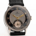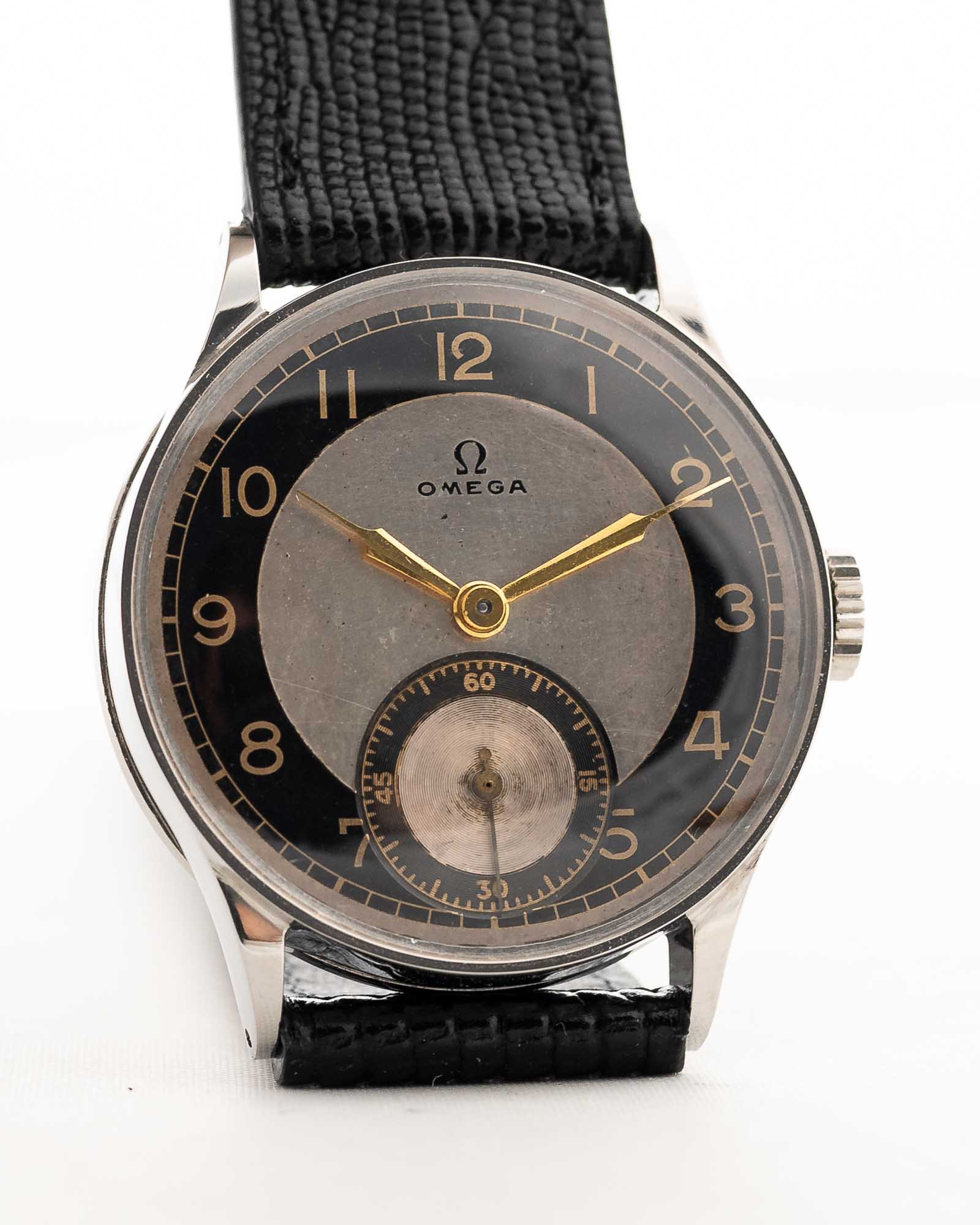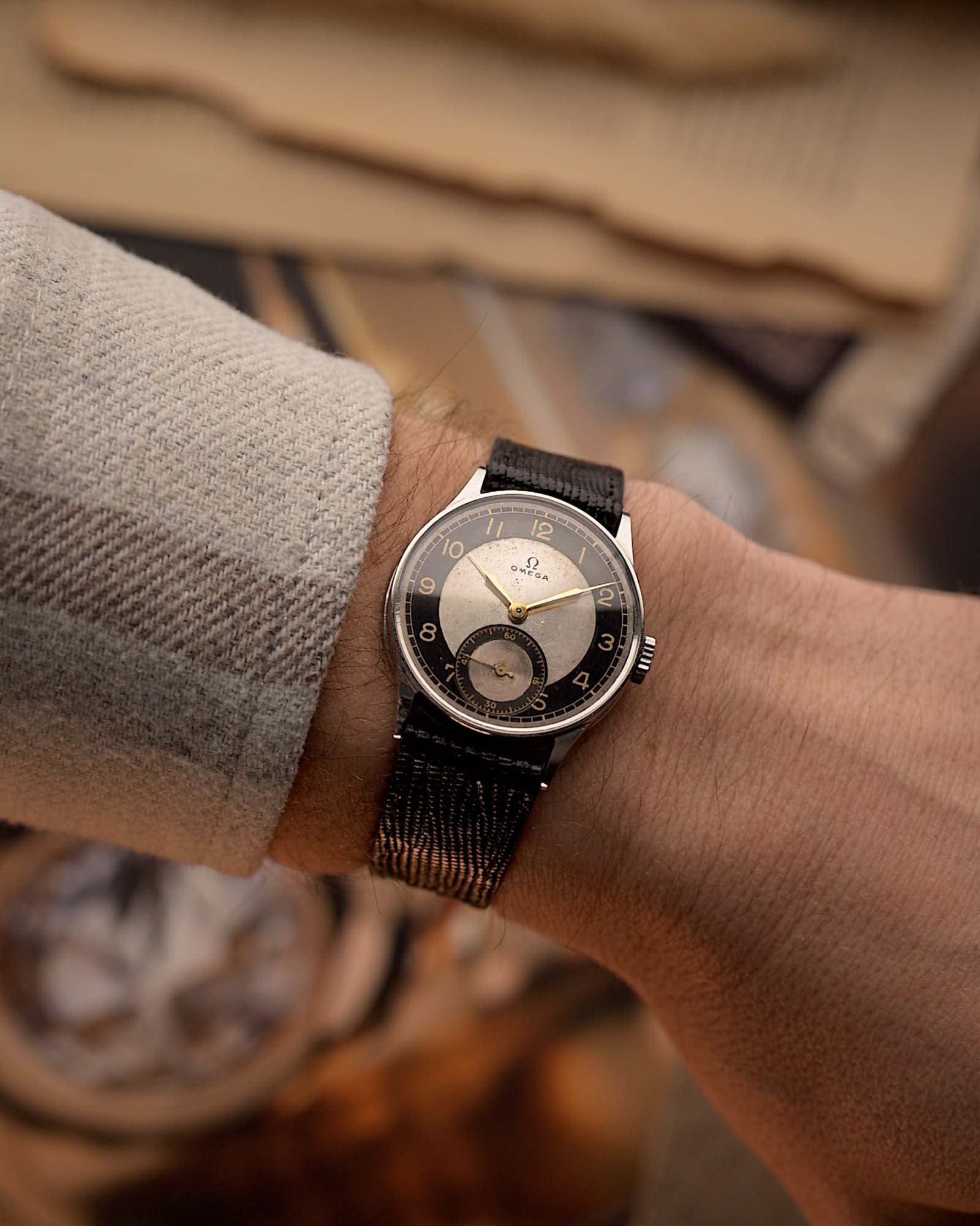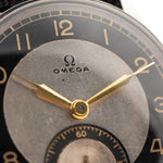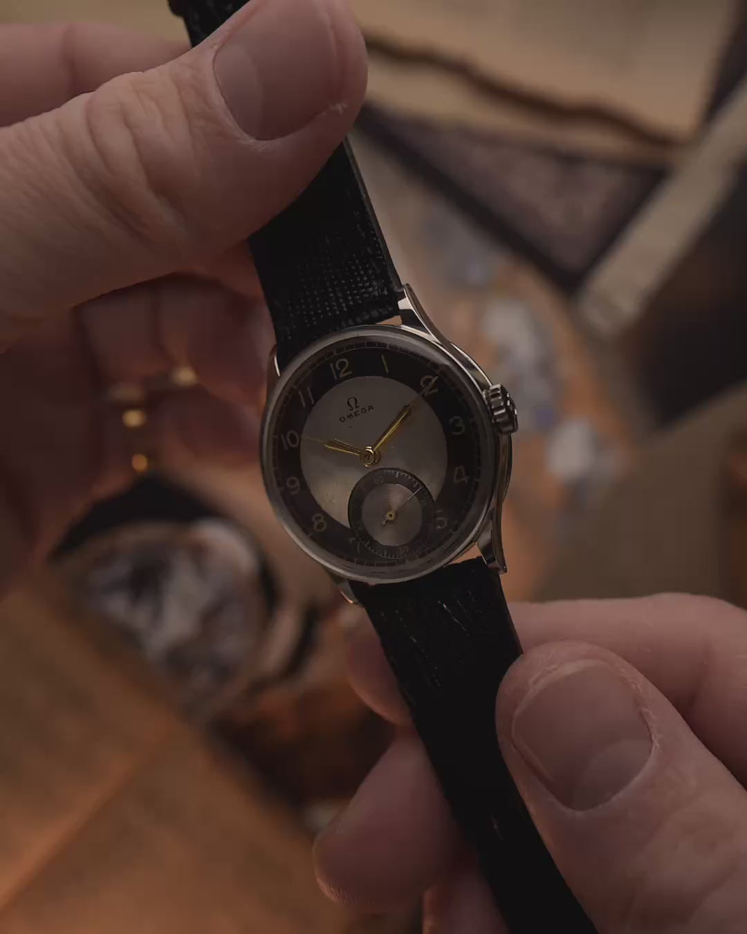 另一枚罕見的1940年代歐米茄珍品,保存狀態極佳。銀黑雙色「燕尾服」錶盤採用 阿拉伯數字時標、鐵路式分鐘刻度環,搭配優雅的金色注射器指針——完美展現早期歐米茄設計的絕妙平衡美感。