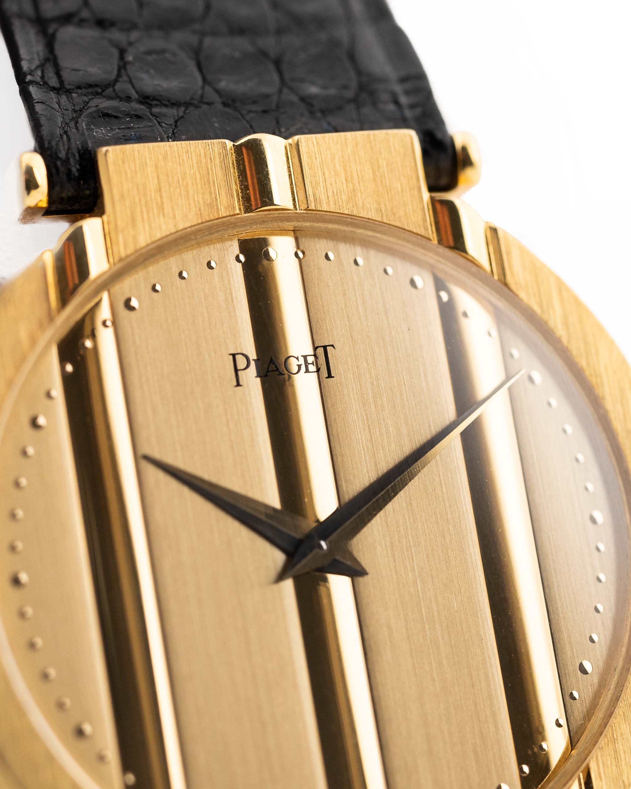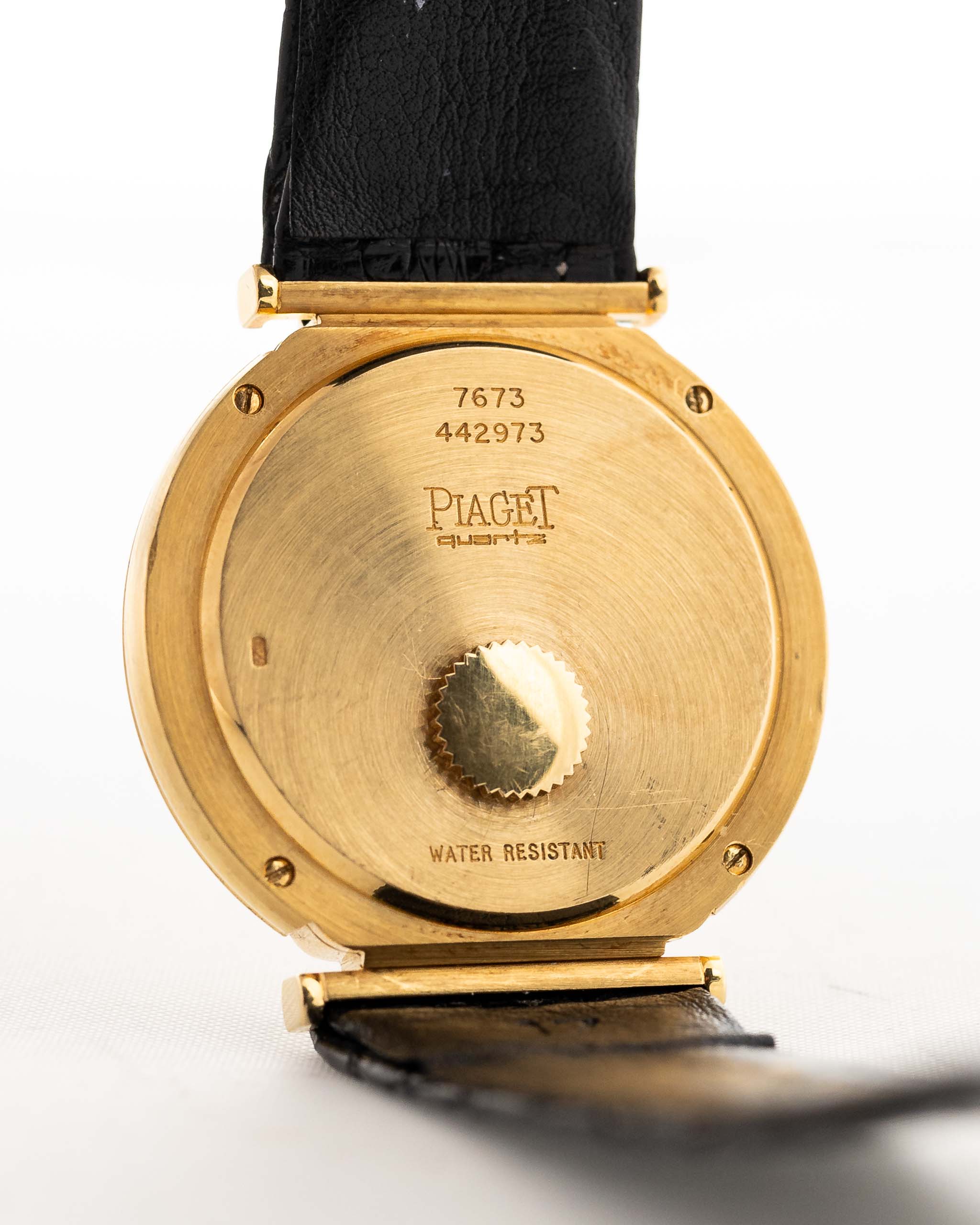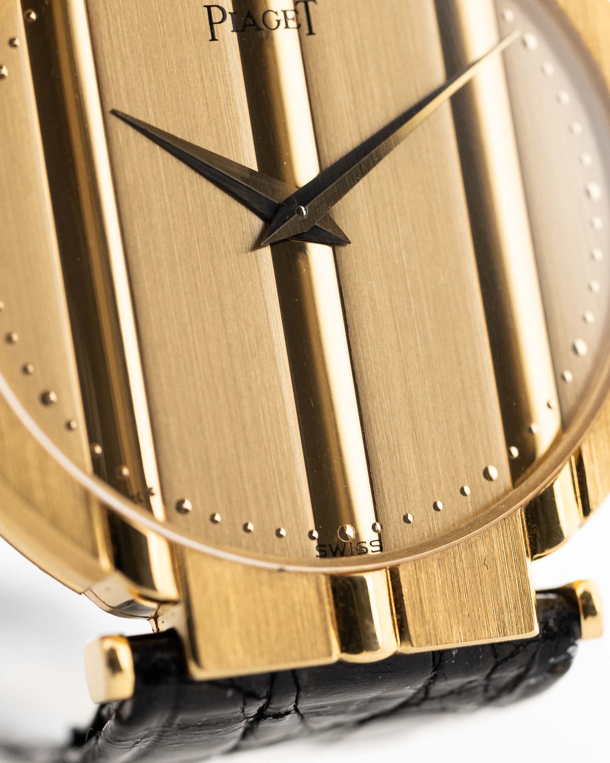 這款Piaget Polo 7673腕錶以18K黃金打造而成。 這款腕錶的錶殼以 18K 黃金打造,光滑圓潤的邊緣與銳利的幾何形錶耳相映成趣,營造出大膽而優雅的輪廓。