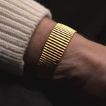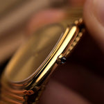 錶盤是簡約主義的夢想:完美無瑕的金色陽光飾面配上清晰的分鐘外軌,再搭配纖細的指針和藍寶石寶石錶冠。但真正讓這款腕與眾不同的是整合式 18K 黃金 「竹節式 」錶鏈- 這一罕見且極具收藏價值的細節將整款腕錶提升為可佩戴的雕塑作品。