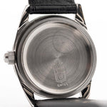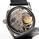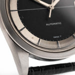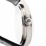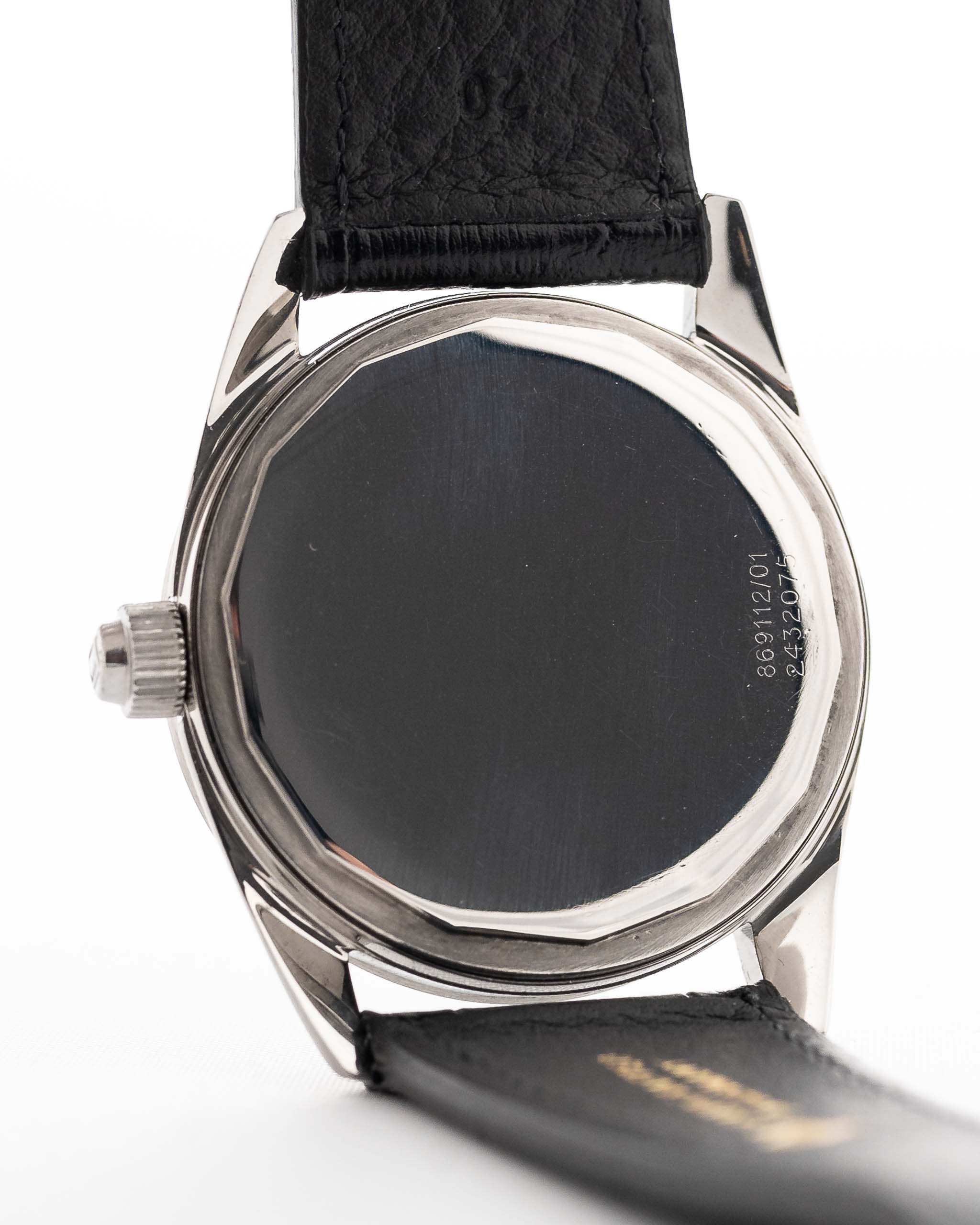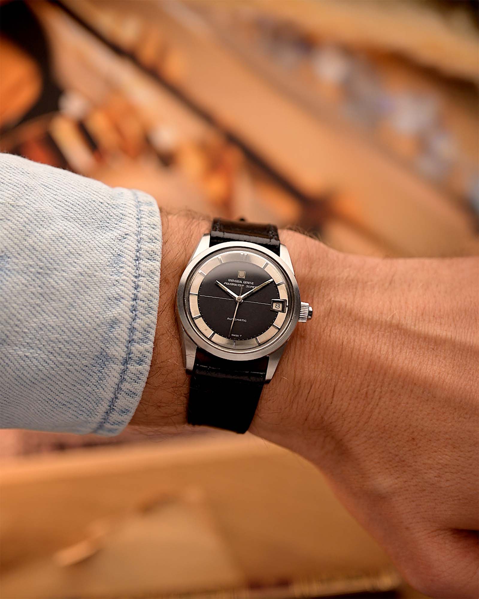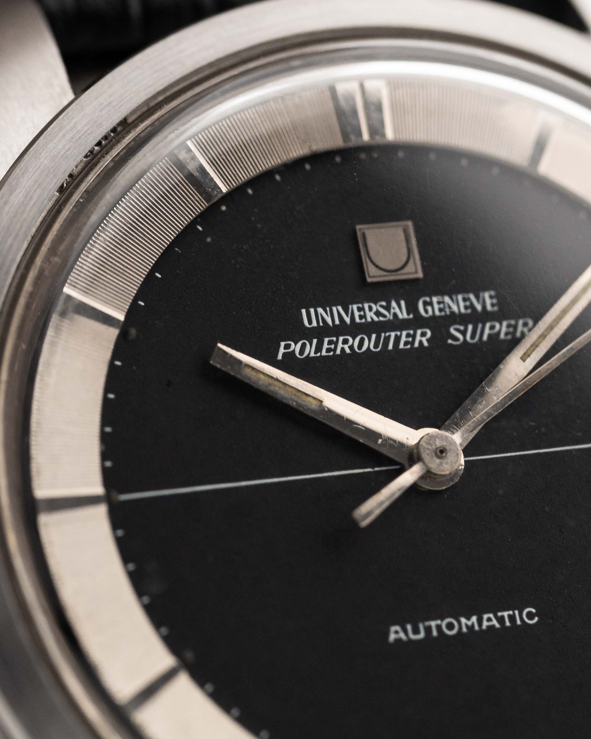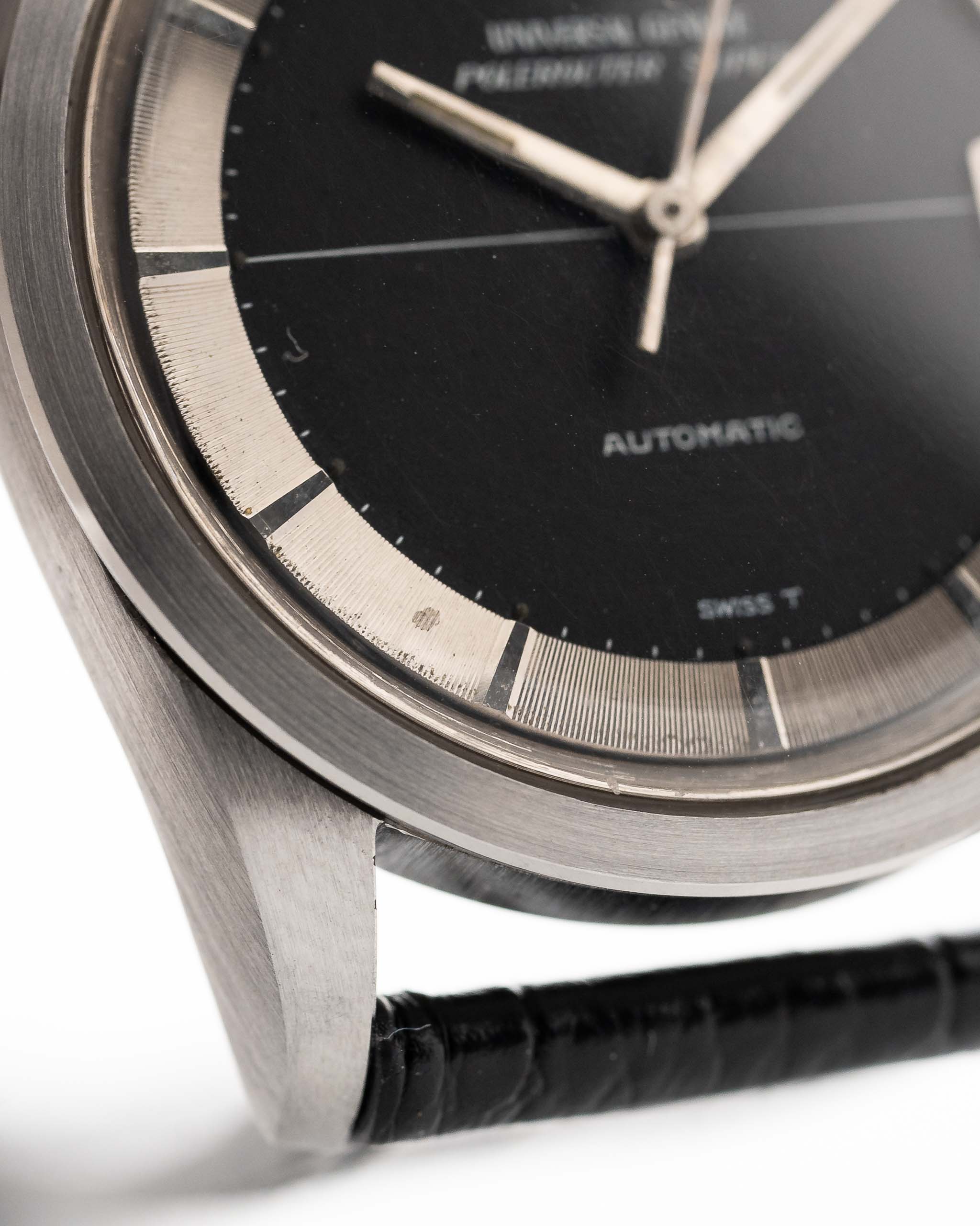 黑色十字紋錶盤搭配鏡面精鋼章環,營造出引人注目的光影效果,讓這款腕錶遠遠超越了傳統工具腕錶的層次。錶殼狀況極佳,已按照 Universal Genève 原廠規格進行拋光處理,保留了銳利的邊緣和復古的魅力。