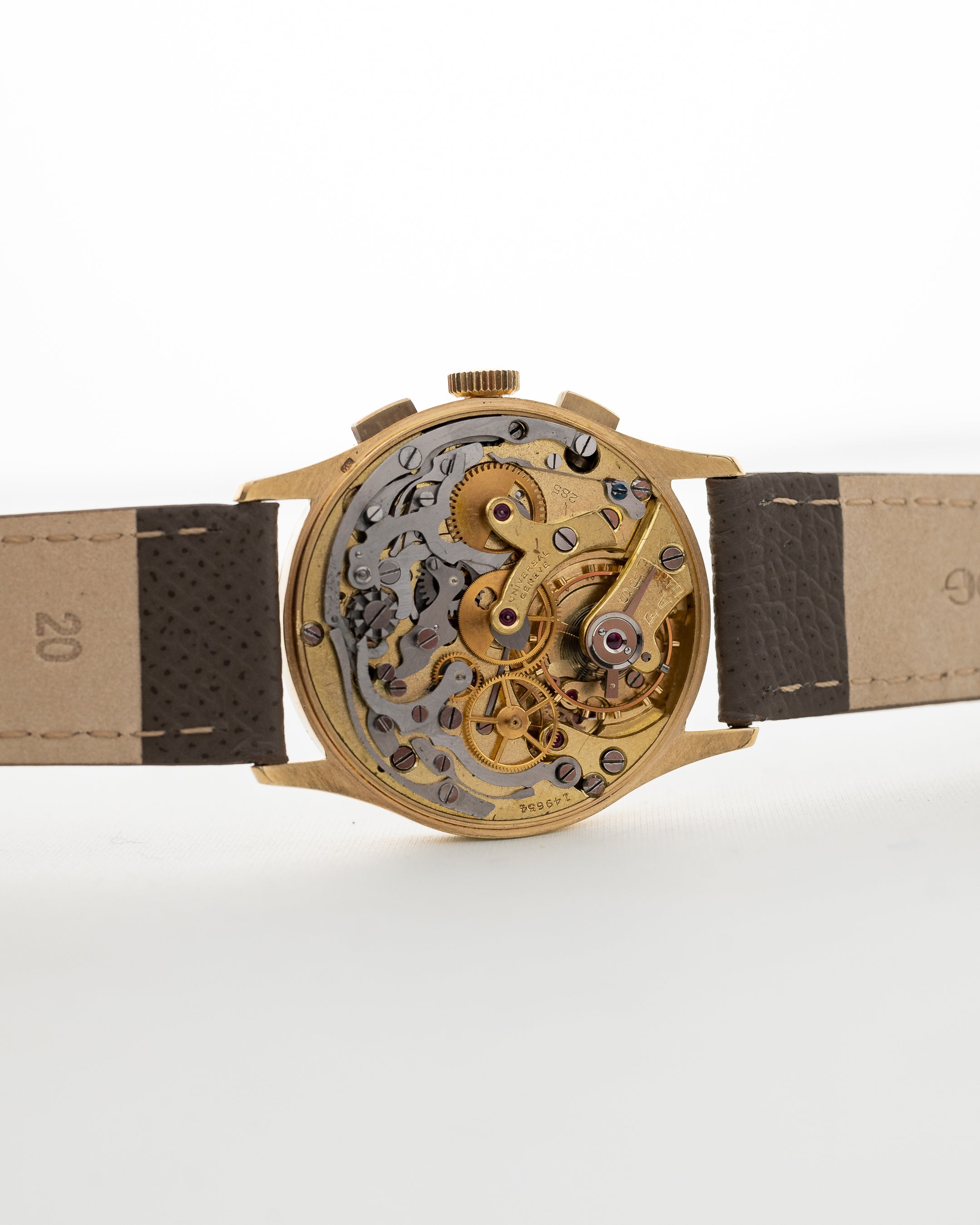 這款Universal Geneve Compur是製錶商在 1940 年代的傑作。精巧的 18K 黃金錶殼搭配方形按鈕,搭載 285 機芯。