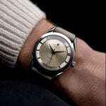 您在此看到的版本是不銹鋼無日期保險桿版本,搭配令人驚艷的銀色/奶油色交叉髮絲錶盤和鏡面不銹鋼章環,在光線下發揮驚人的效果。保險桿版本是最早的 Polerouters。