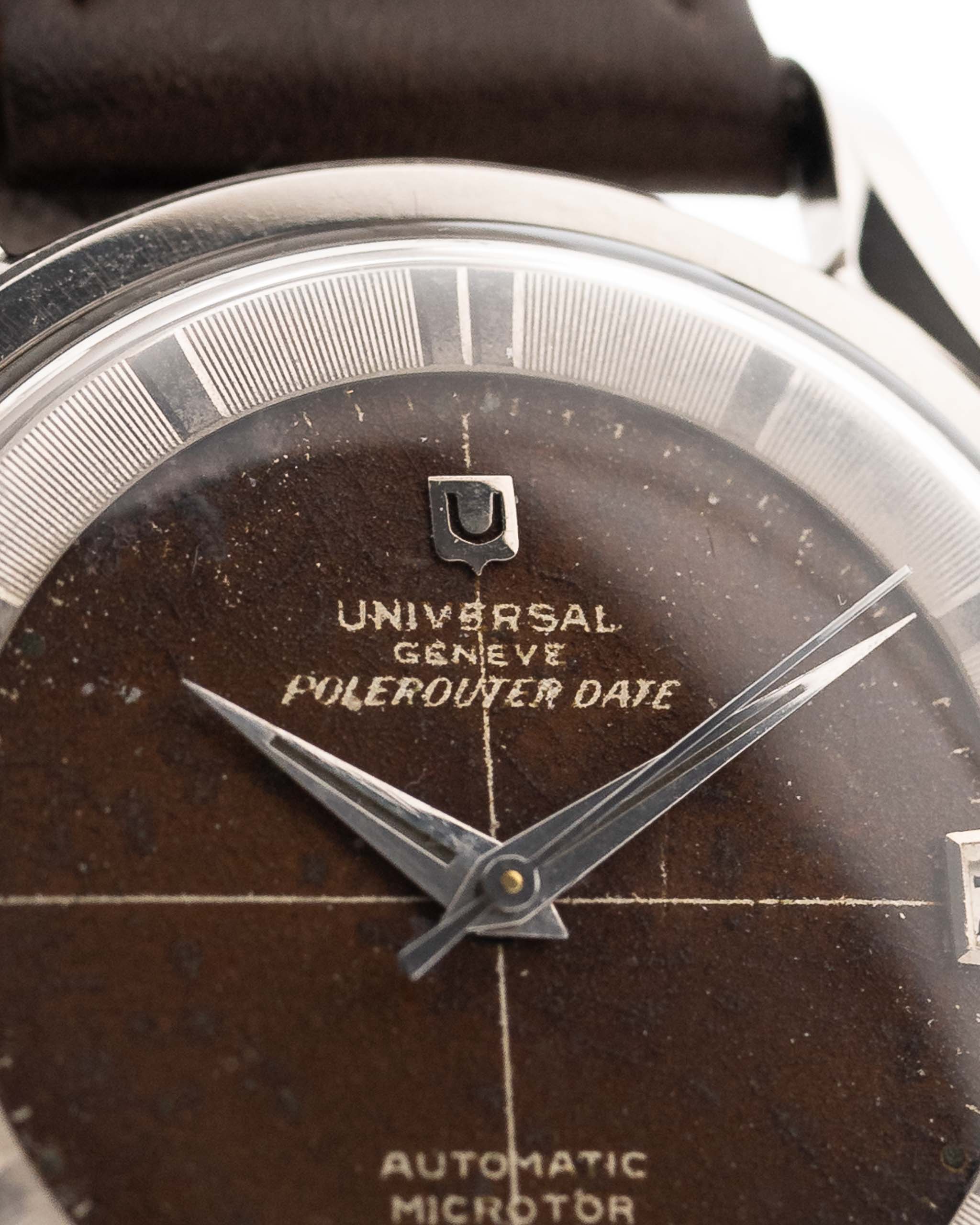 Our example, powered by the legendary Microtor Caliber 215, captures everything that makes the Polerouter iconic: technical elegance, aviation heritage, and bold design. The dial has aged beautifully into a warm tropical brown, adding stunning depth to the crosshair layout and steel chapter ring. It’s a watch that feels alive with history.