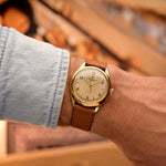 這枚罕見的江詩丹頓正裝腕錶來自 1950 年代,代表了瑞士製錶業的黃金時代。錶殼採用堅固的35 mm 18K 黃金 Spillman 錶殼,兼顧堅固與精緻。錶盤上有精緻的奶油色扭索紋圖案溫暖的金色鏽蝕紋經過柔和的歲月洗禮,優雅的指針和鑲嵌式刻度為其增色不少。