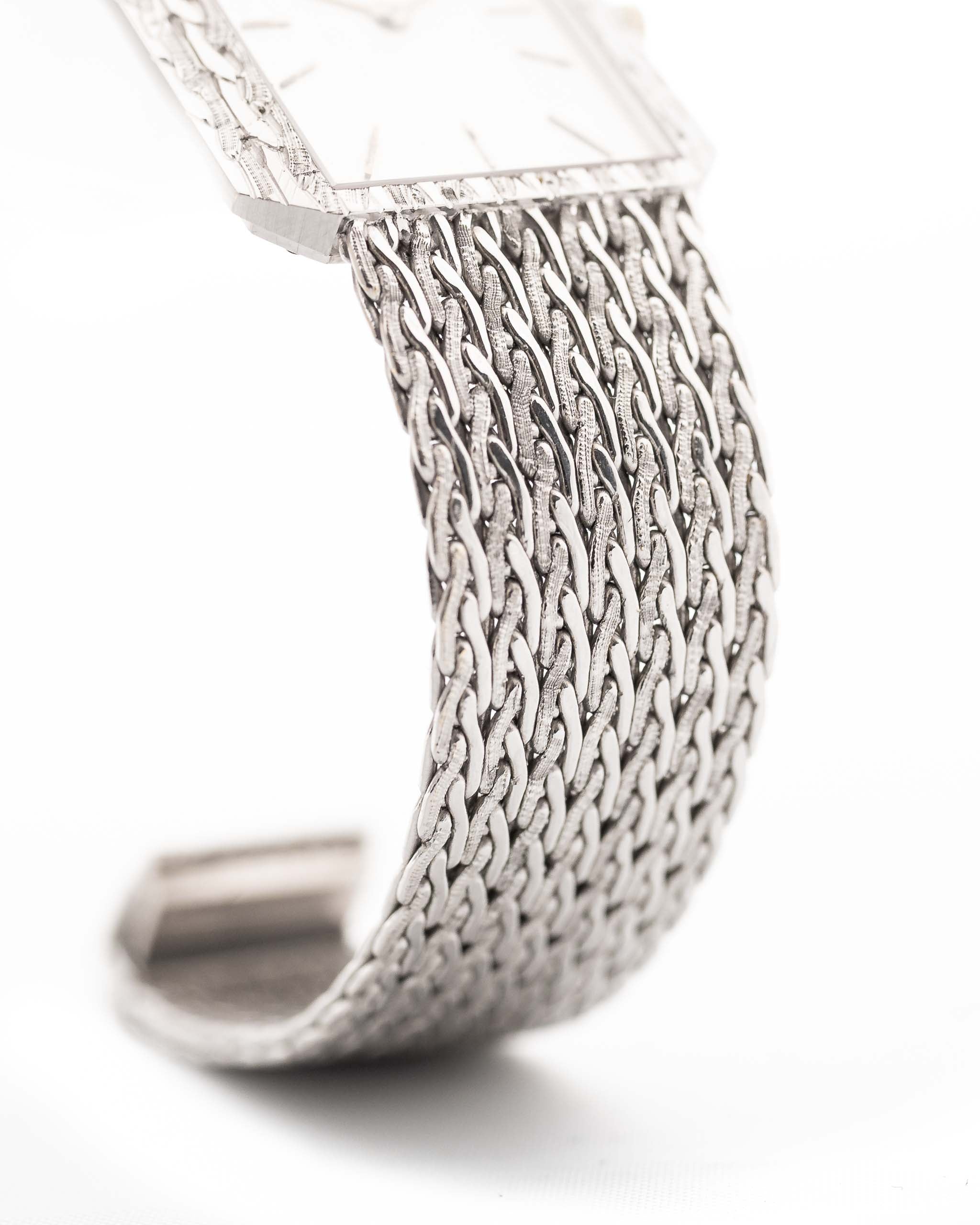 Vintage Vacheron Constantin 7457 長方形腕錶,1970 年代製造,白底。25毫米寬、18K白金、手動上鏈1003型機芯、無瑕銀麻布錶盤和編織錶鏈。