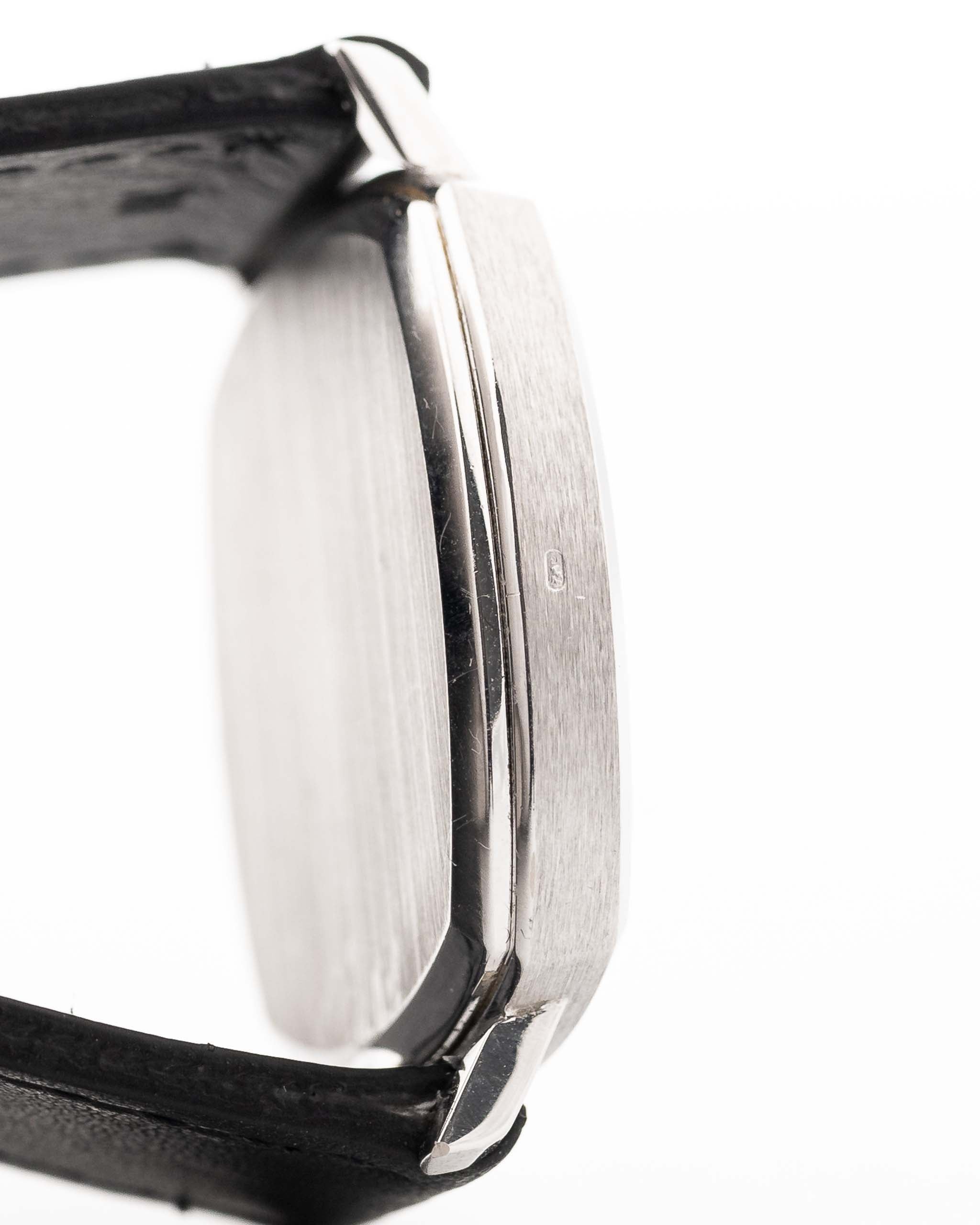 這款江詩丹頓Ref.江詩丹頓7390Ref.以實心18K白金打造的方形錶殼,銳利的邊緣反映出那個時代簡潔、自信的幾何形狀 - 瑞士簡約主義的巔峰之作。