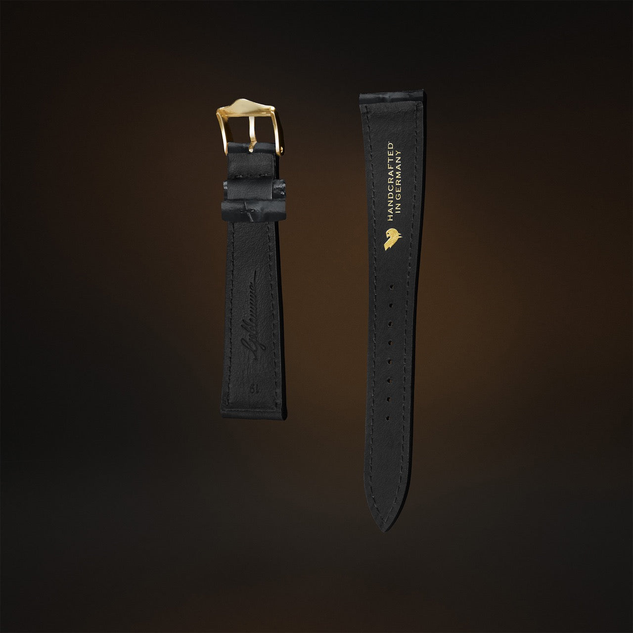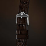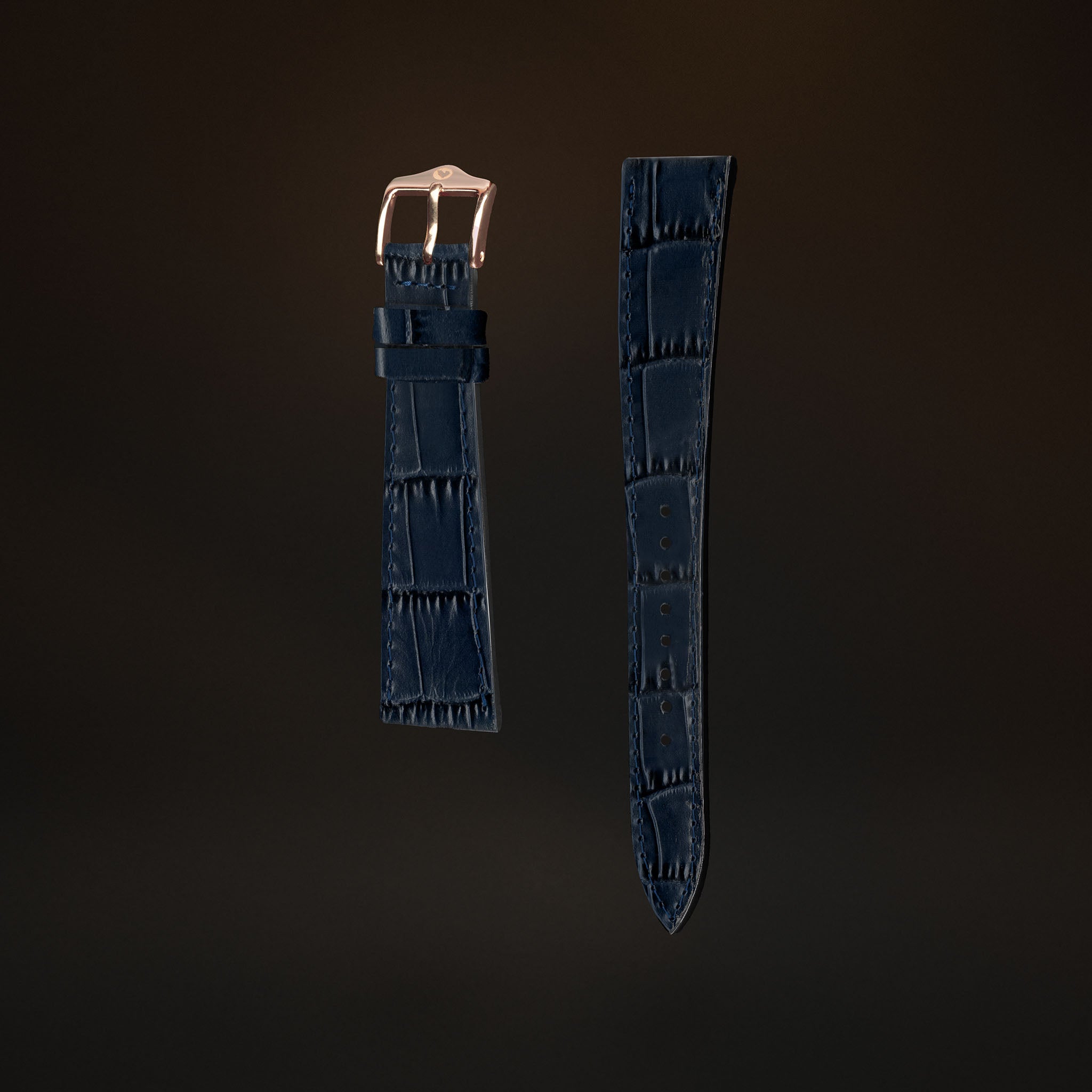 錶帶以優質的義大利小牛皮製成,飾有壓紋鱷魚圖案,在提供亮澤質感的同時兼具永續性。錶帶僅薄 2 mm,第一次配戴就能完美貼合手腕。獨特的錐形設計為您的經典復古腕錶襯托出完美的框架。