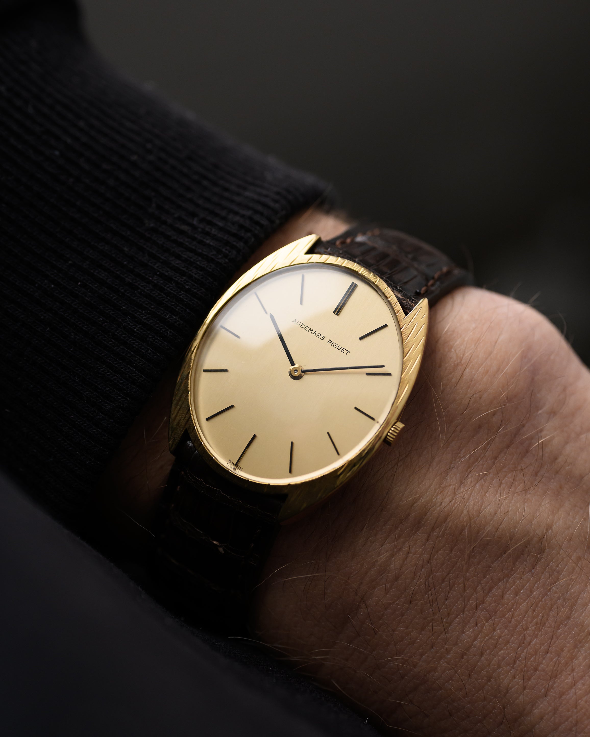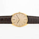 這款 Audemars Piguet 正裝腕錶來自 1980 年代,錶盤呈金黃色,設計簡潔,令人讚嘆。 這款腕錶的特別之處在於其精美的 18K 黃金超薄錘紋錶殼,狀況極佳。