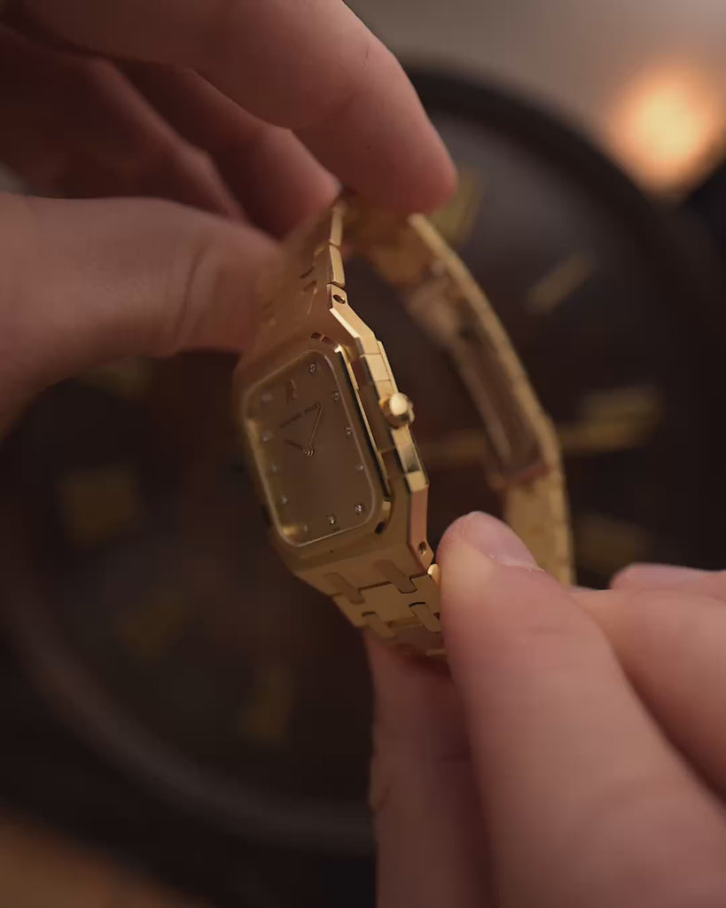 金色錶盤在光線下熠熠生輝,11 個工廠鑲鑽時標與簡約的棒狀指針相得益彰。藍寶石水晶錶鏡、無簽名錶冠和拋光錶圈更顯簡潔高雅。