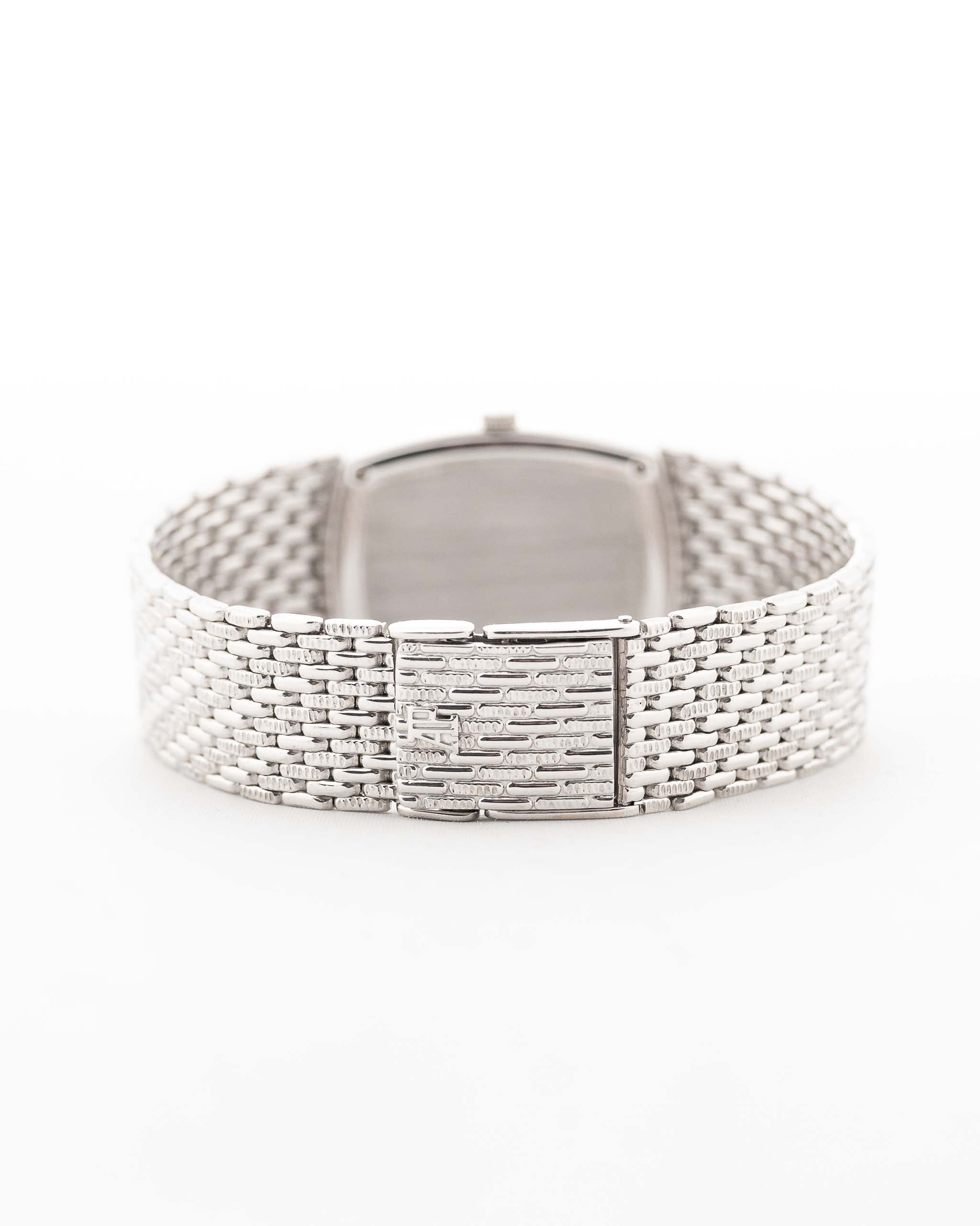 直徑 27 mm 的 18K 白金錶殼保存完好,搭配獨一無二的 18K 白金精美錶帶。鑲鑽指針和時標更是錦上添花。