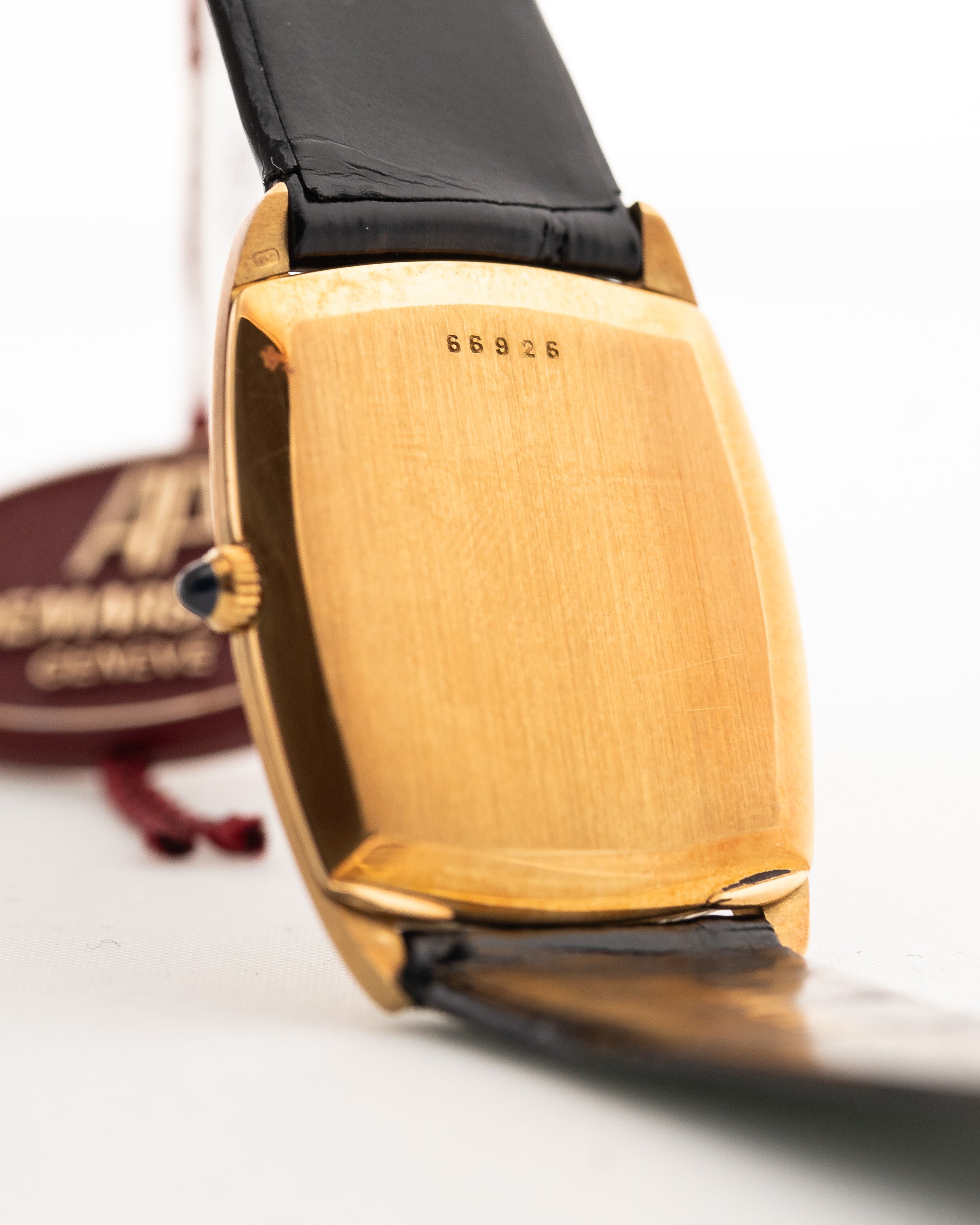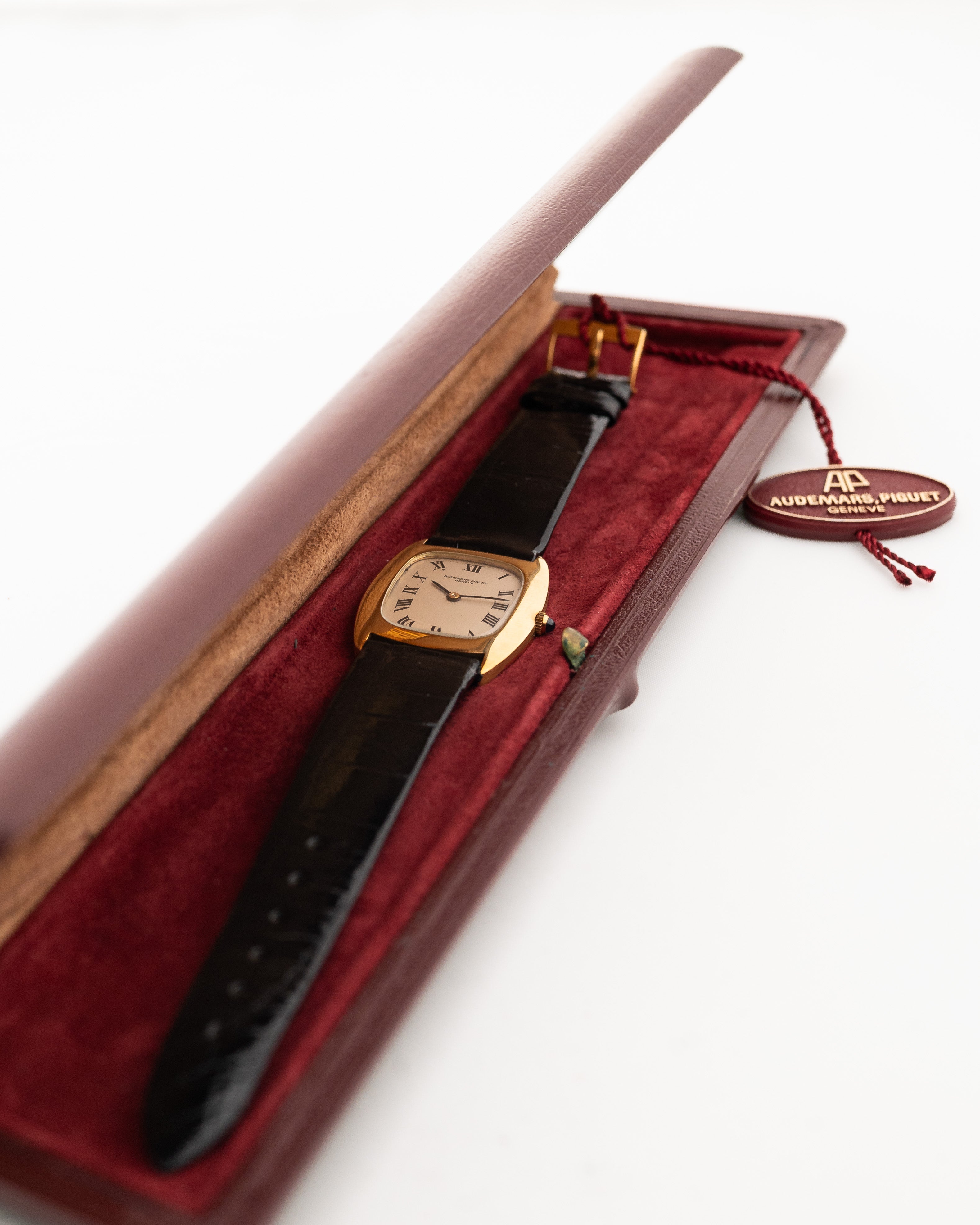 這款 18K 黃金 Audemars Piguet 正裝腕錶採用 1970 年代的橢圓形枕型設計,做工精美。